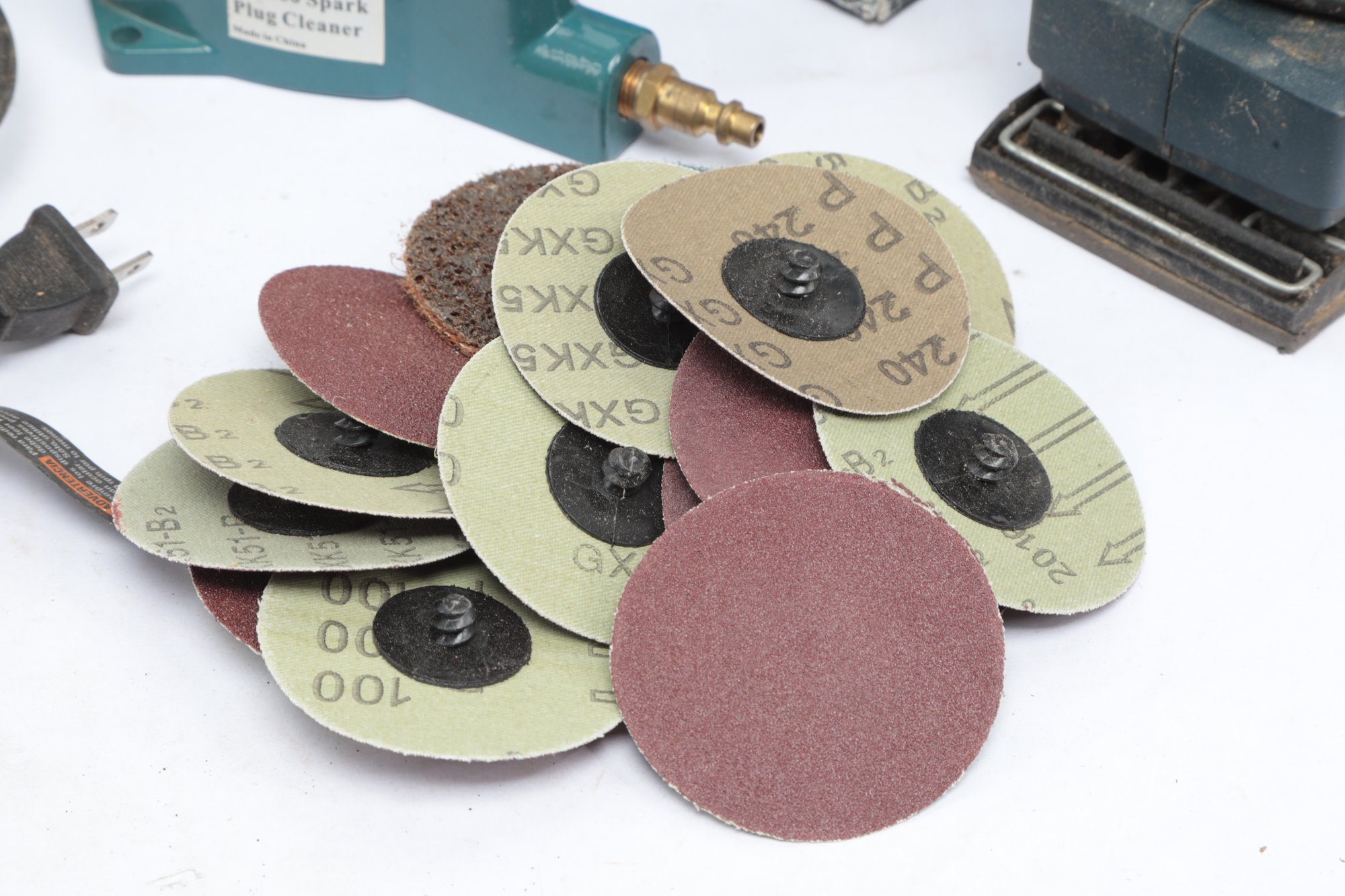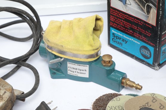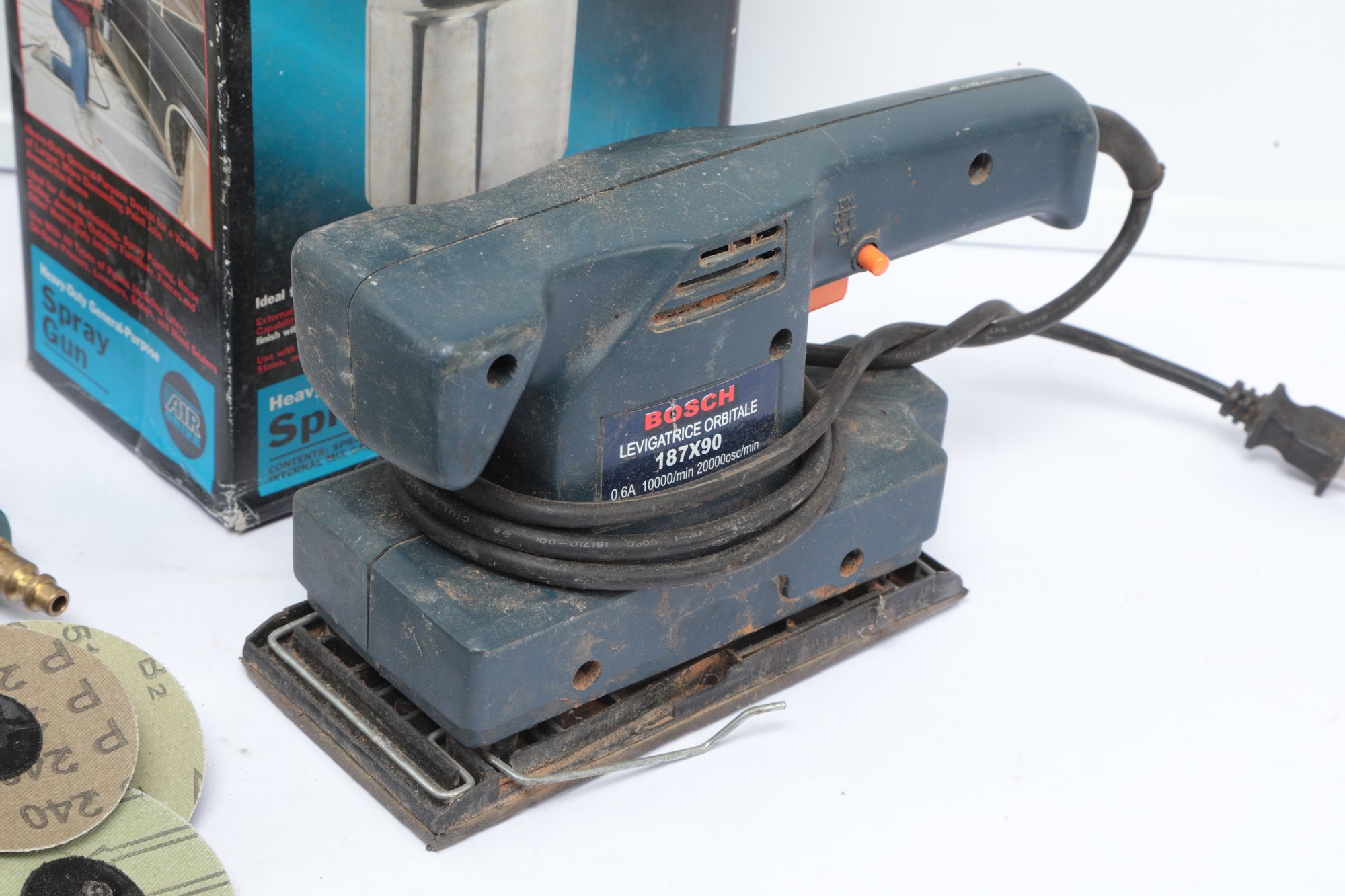 Ryobi, Bosch, Craftsman Sander And Sprayer Lot. Tools are untested sold as is. See pictures carefully for details on contents included with lot and condition.