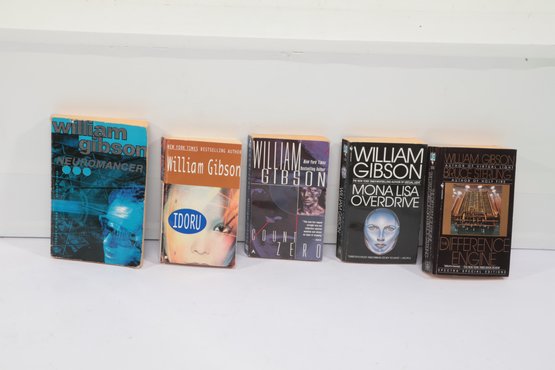 Five book lot from cyberpunk pioneer William Gibson. Includes Neuromancer, Idoru, Count Zero, Mona Lisa Overdrive, and Difference Engine (with Bruce Sterling). Mix of hardcover and paperback editions spanning his influential career in speculative fiction. Light shelfwear typical of age.