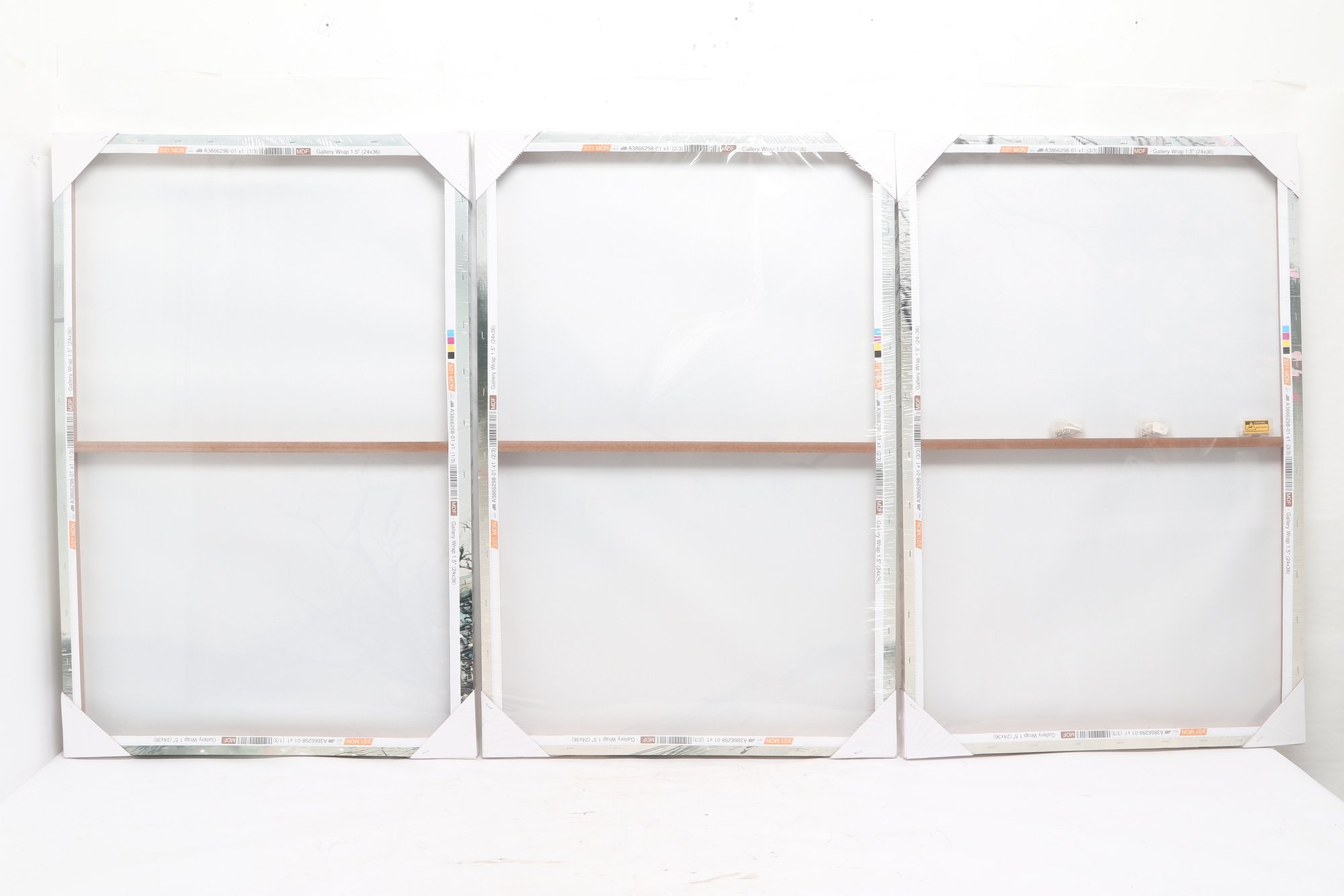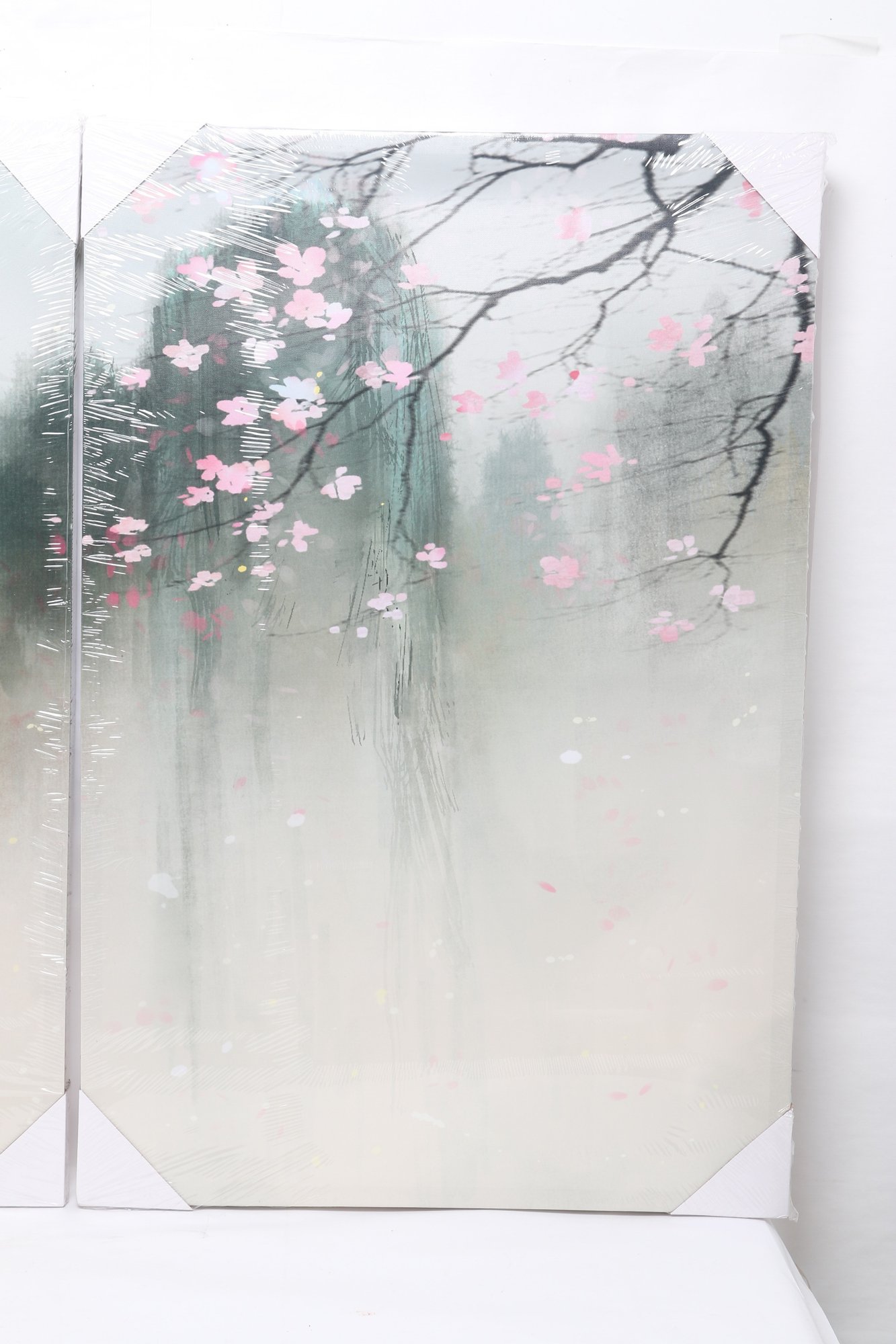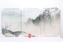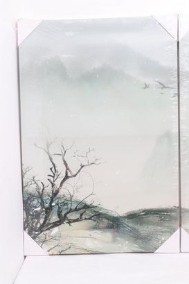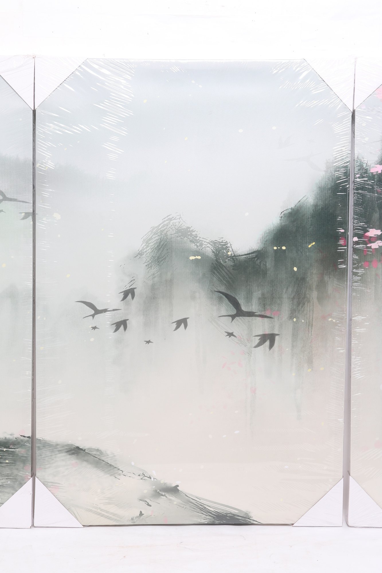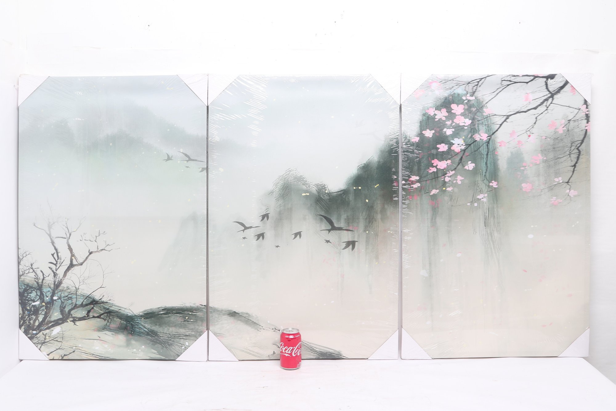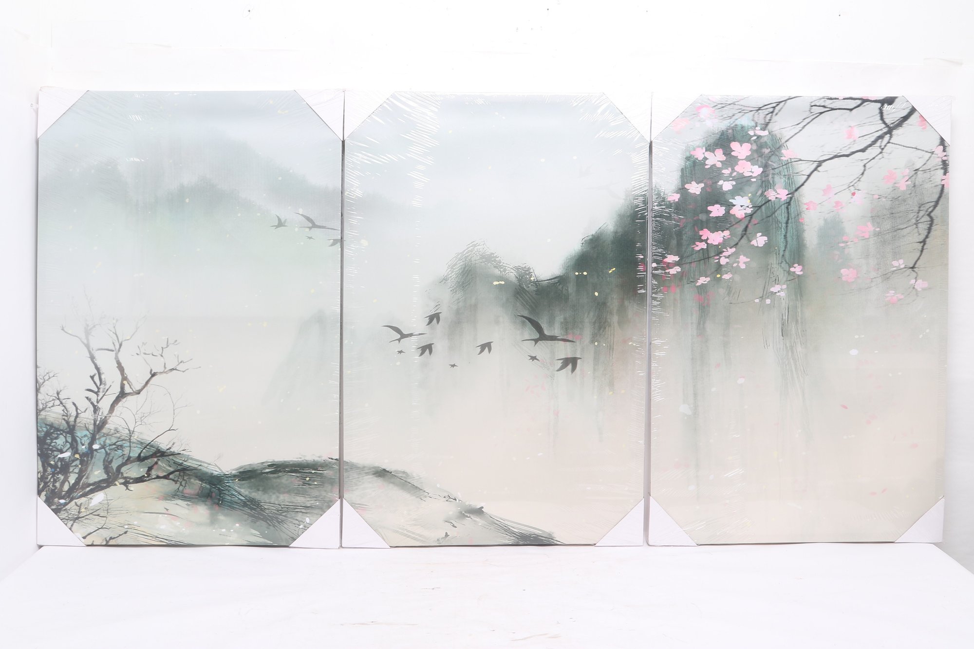 Decorative three-panel wall art set featuring serene Asian-inspired landscape scenes with cranes, misty mountains, and blooming branches. Soft, muted tones create a tranquil aesthetic, each panel measuring approximately 36" tall by 24" wide. Light wear present; overall displays well.