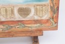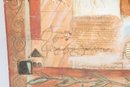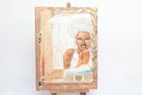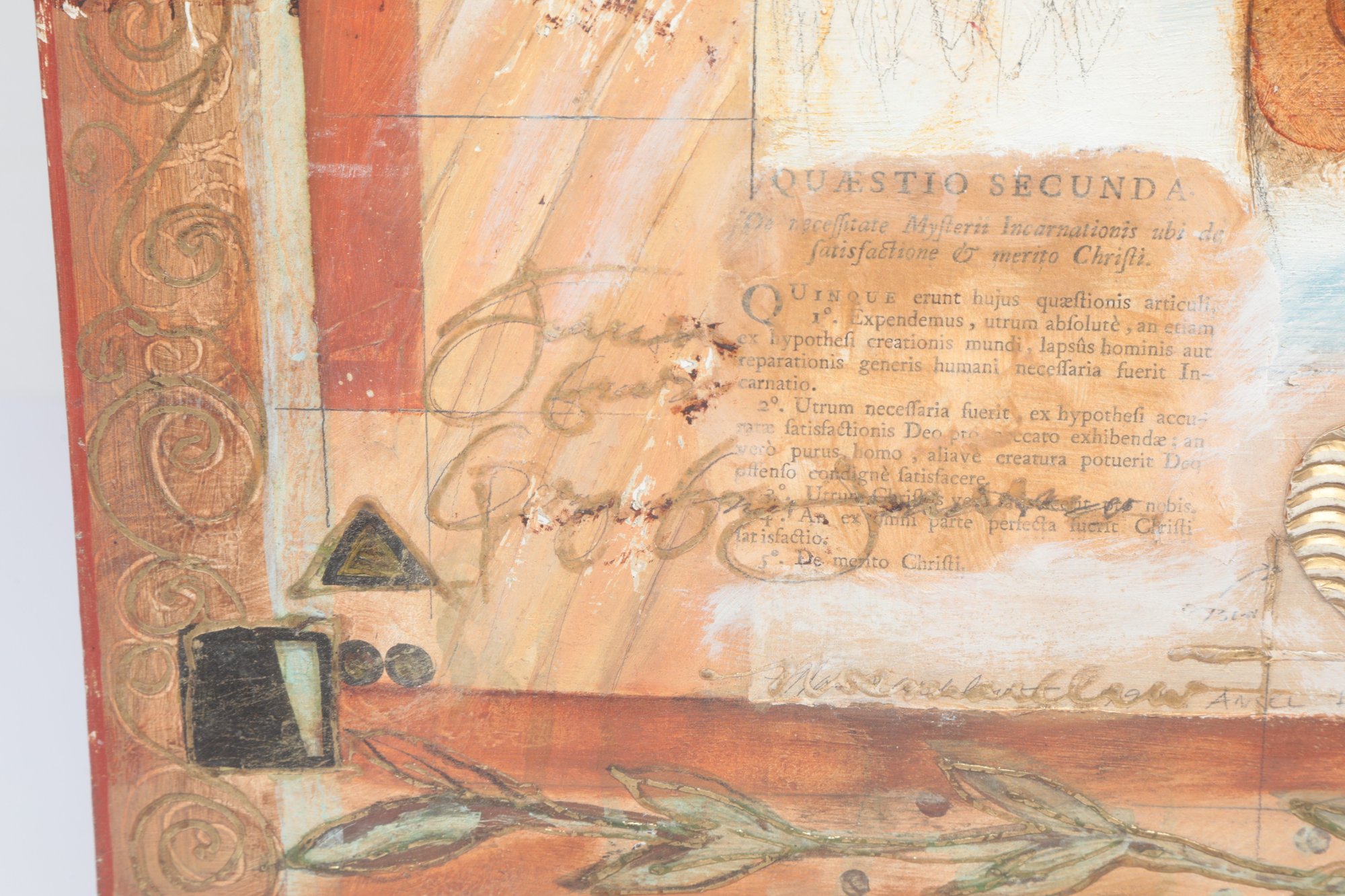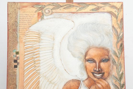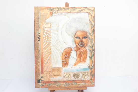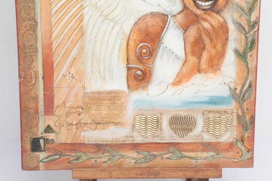 Surrealist style mixed media artwork on board depicting a stylized winged figure with geometric motifs and collage-like printed text elements. The composition features warm earth tones and symbolic decorative details within a framed border design. Unframed board presentation with light surface wear consistent with age. A distinctive decorative modern artwork.