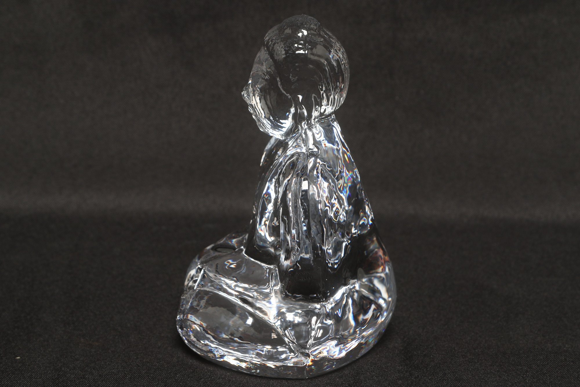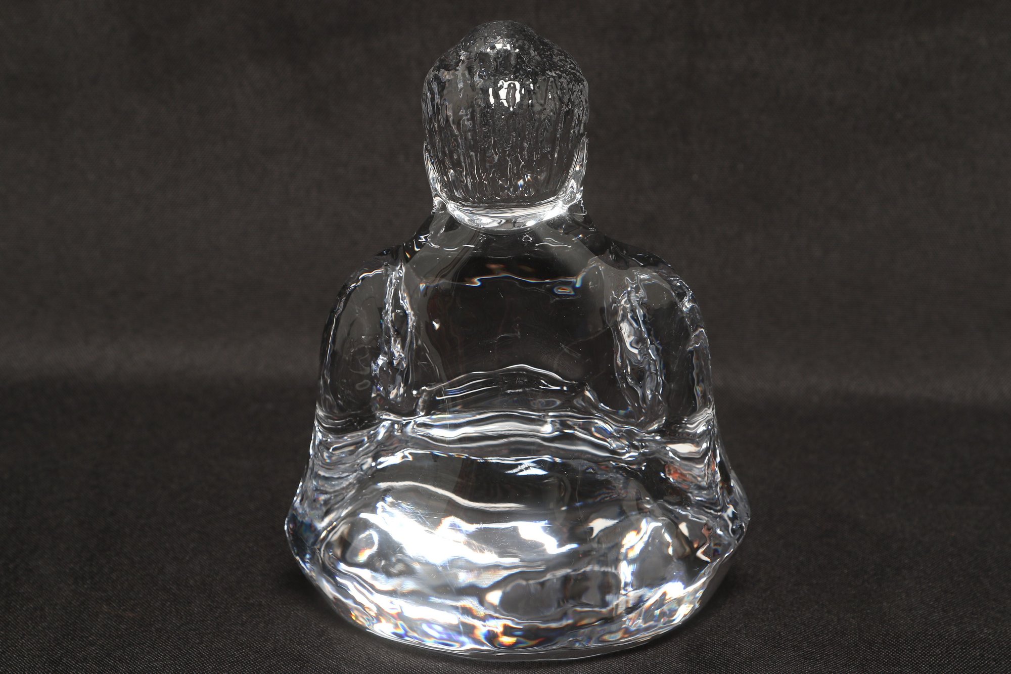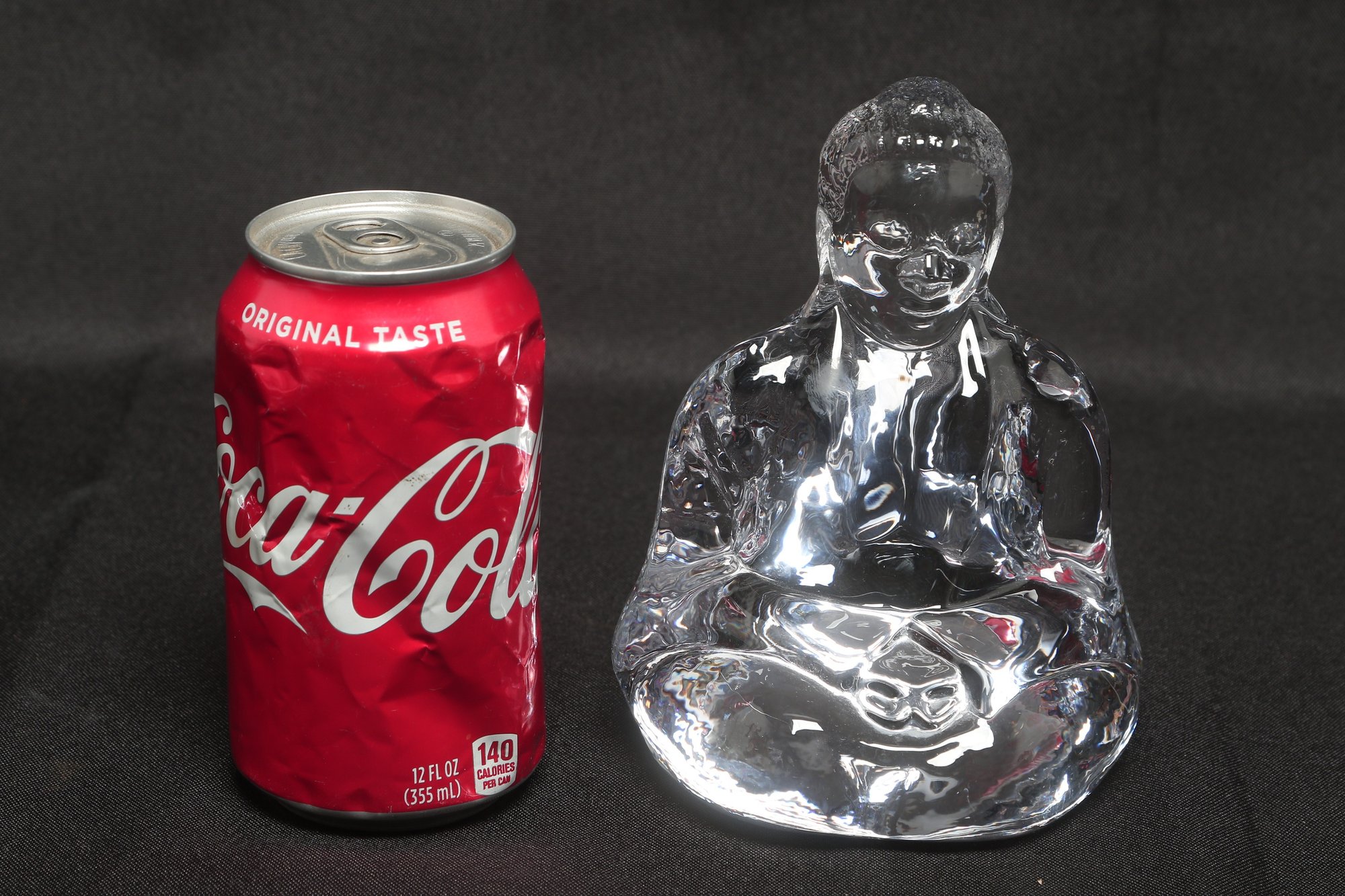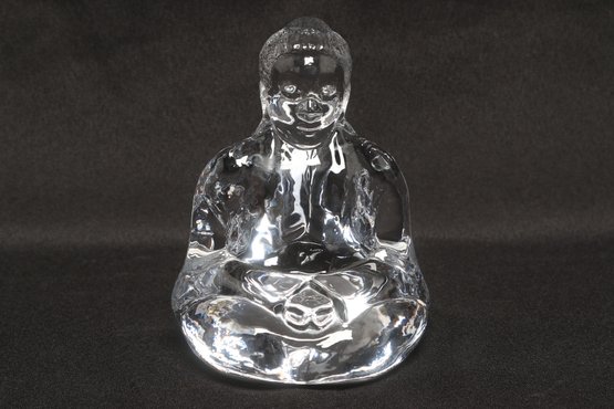 Simon Pearce hand-blown glass Buddha figure in a seated meditative pose. Crafted in clear glass with smooth, sculptural detailing, offering a serene decorative accent. Pre-owned with light wear, overall in very good condition.