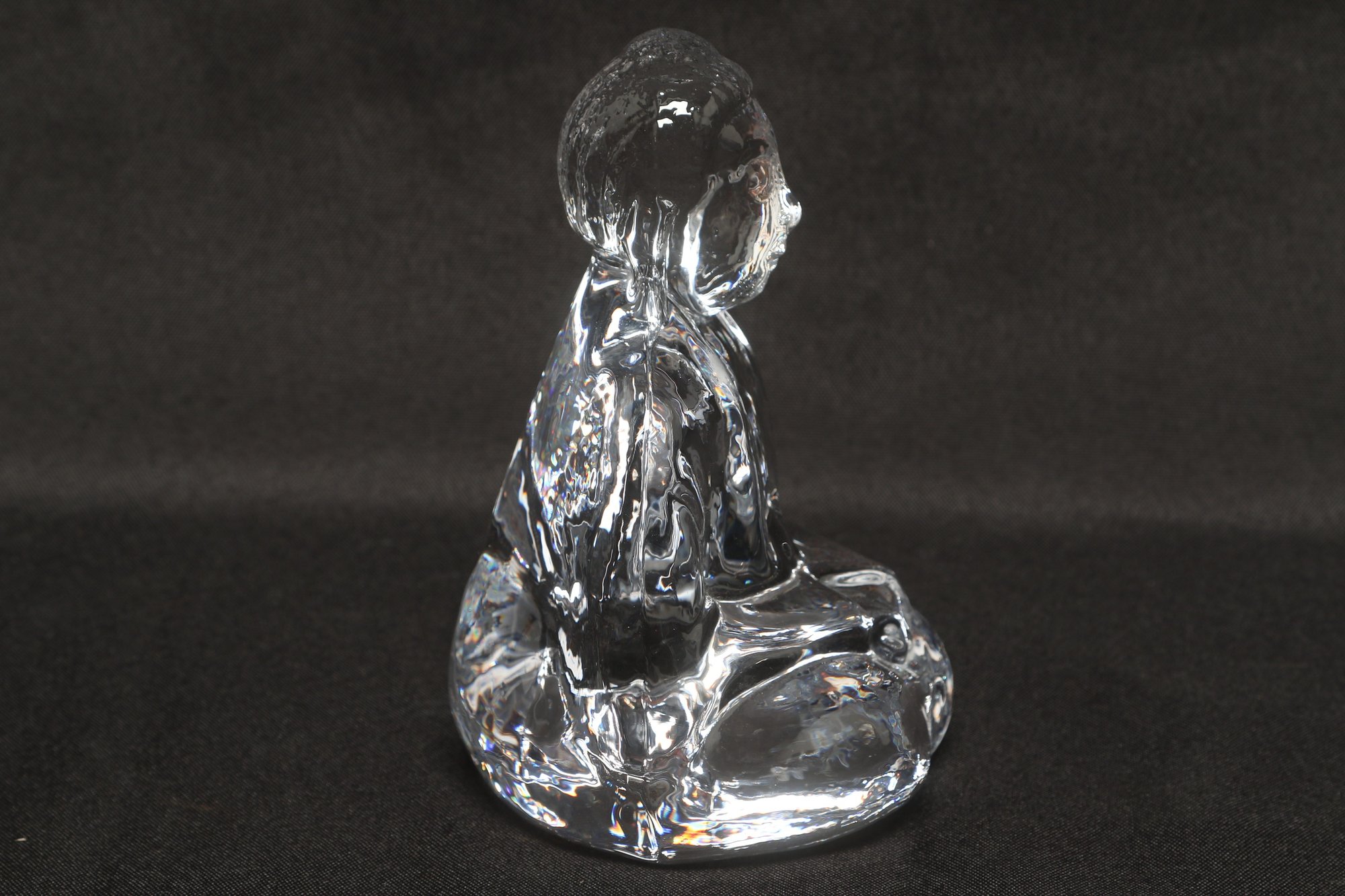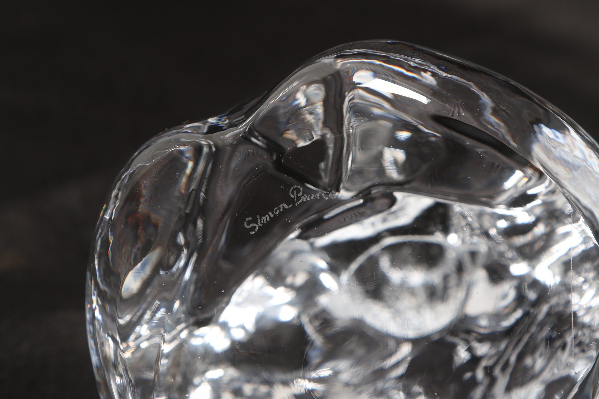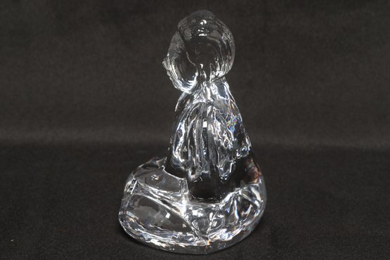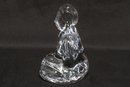 Simon Pearce hand-blown glass Buddha figure in a seated meditative pose. Crafted in clear glass with smooth, sculptural detailing, offering a serene decorative accent. Pre-owned with light wear, overall in very good condition.