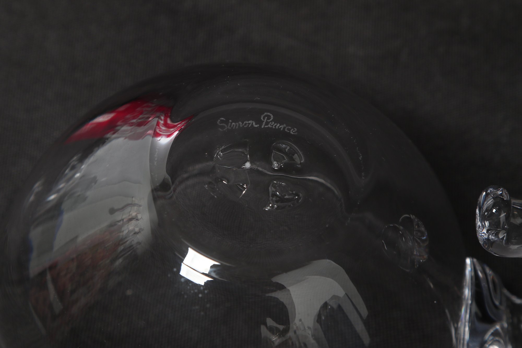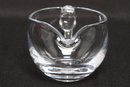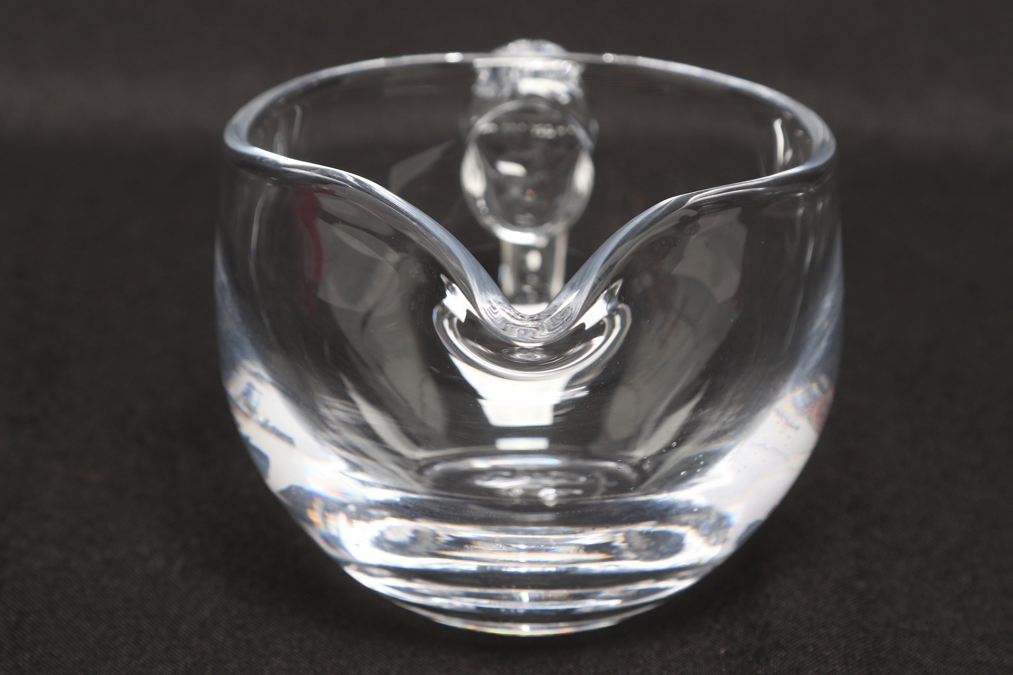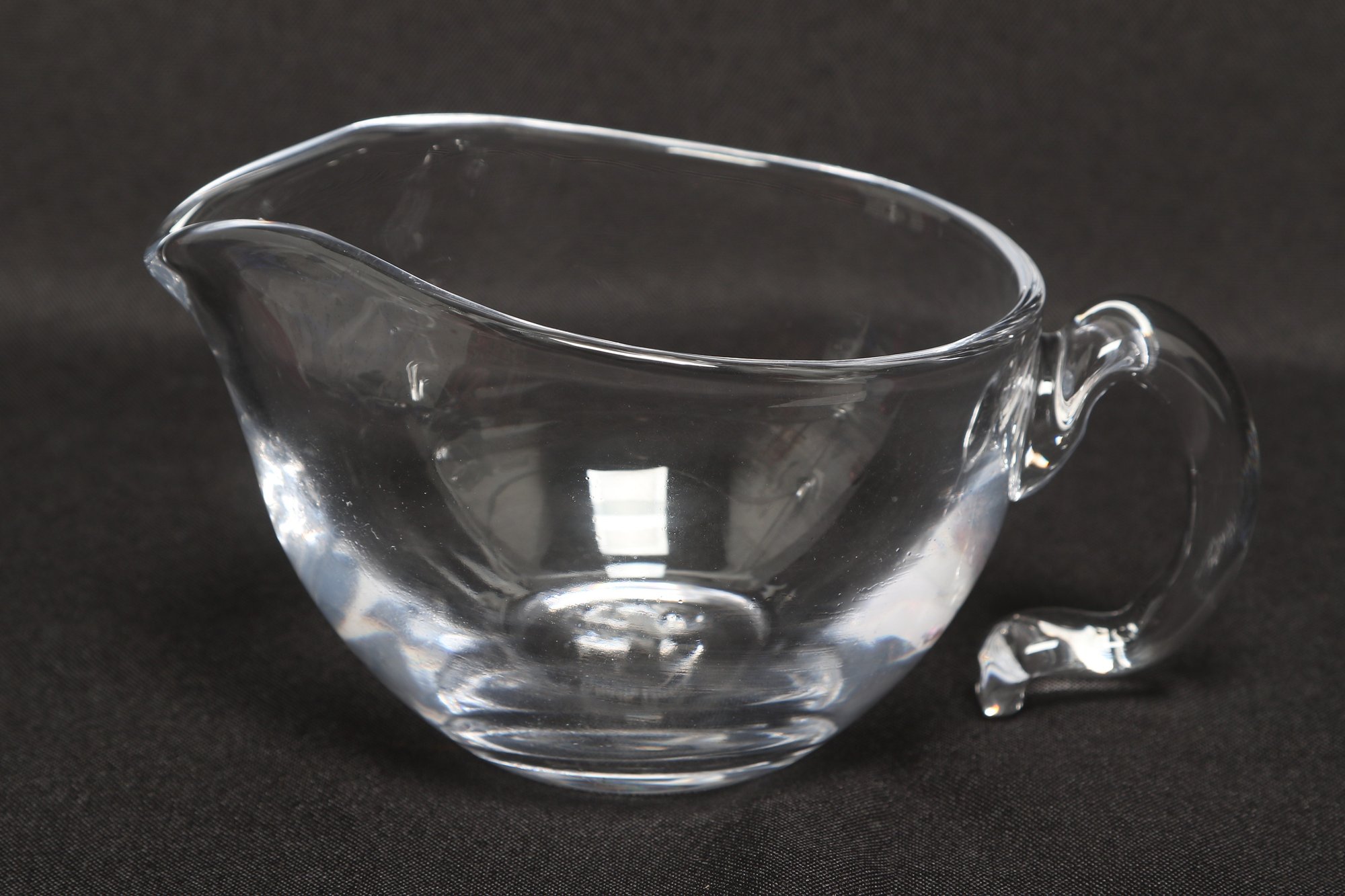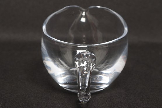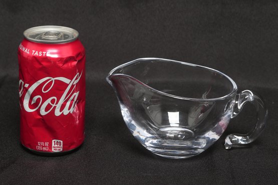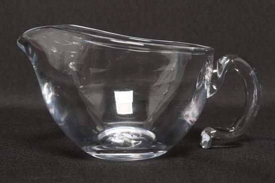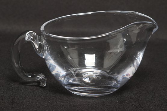 Simon Pearce hand-blown glass creamer pitcher in clear glass, featuring a rounded body, pouring spout, and applied handle. Elegant and functional design ideal for serving cream or sauces. Pre-owned with light wear, overall in very good condition.