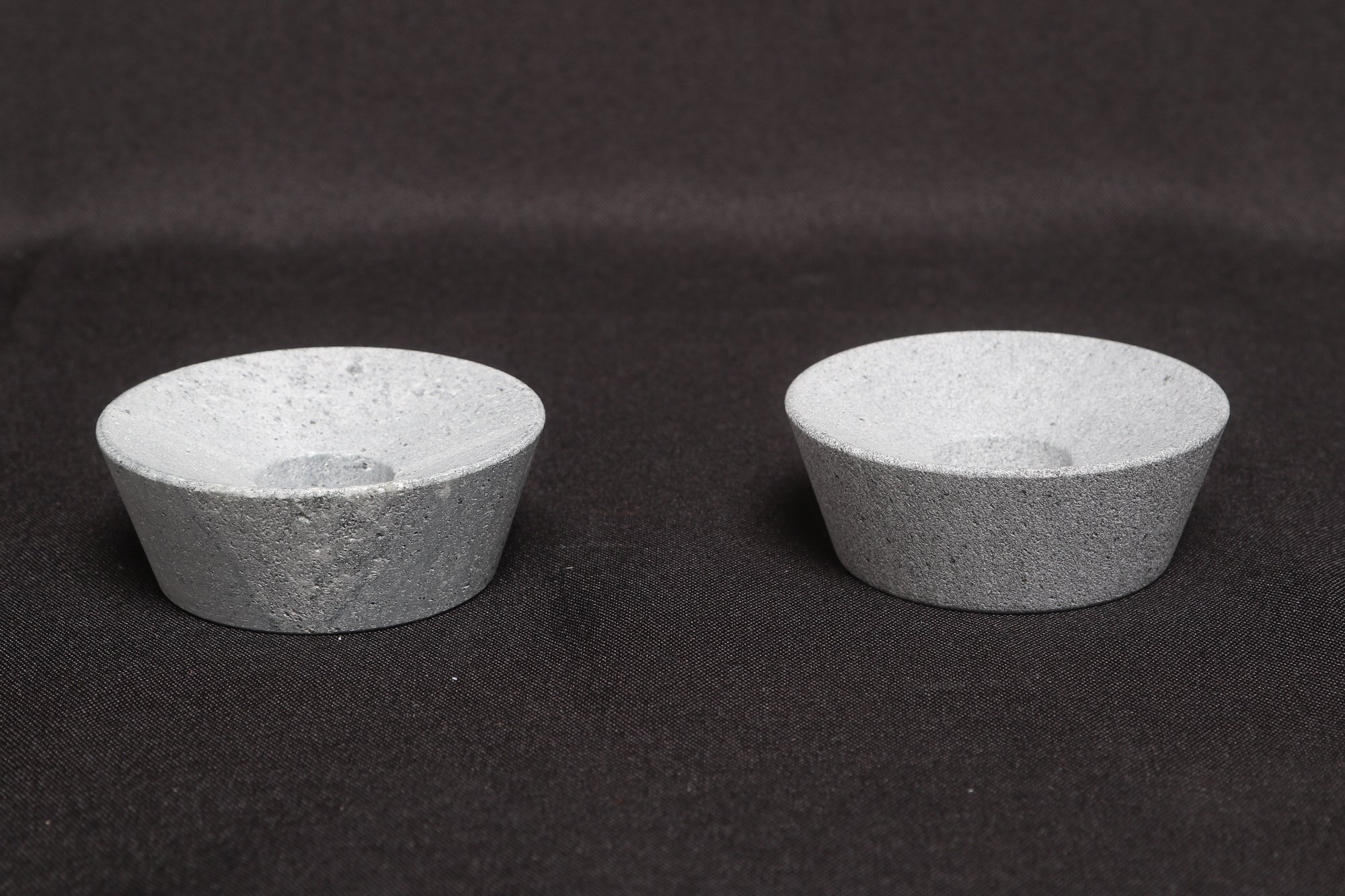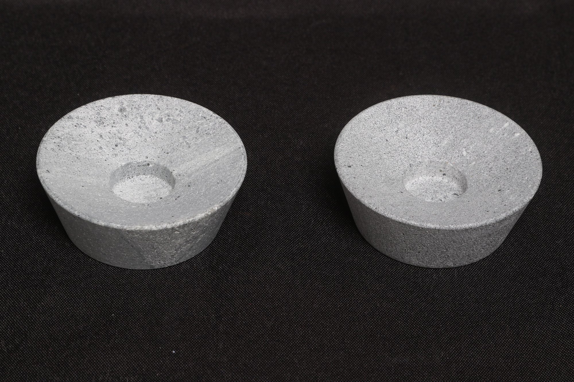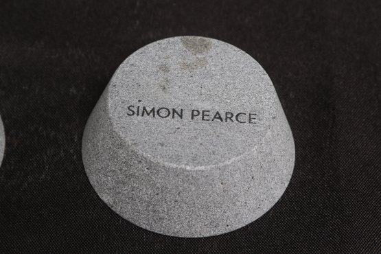 Pair of Simon Pearce minimalist stone candle holders with a clean, modern design. Each features a shallow center for votive or small candles and a smooth, natural finish. Compact size ideal for tabletop décor. Pre-owned with light wear, overall in good condition.