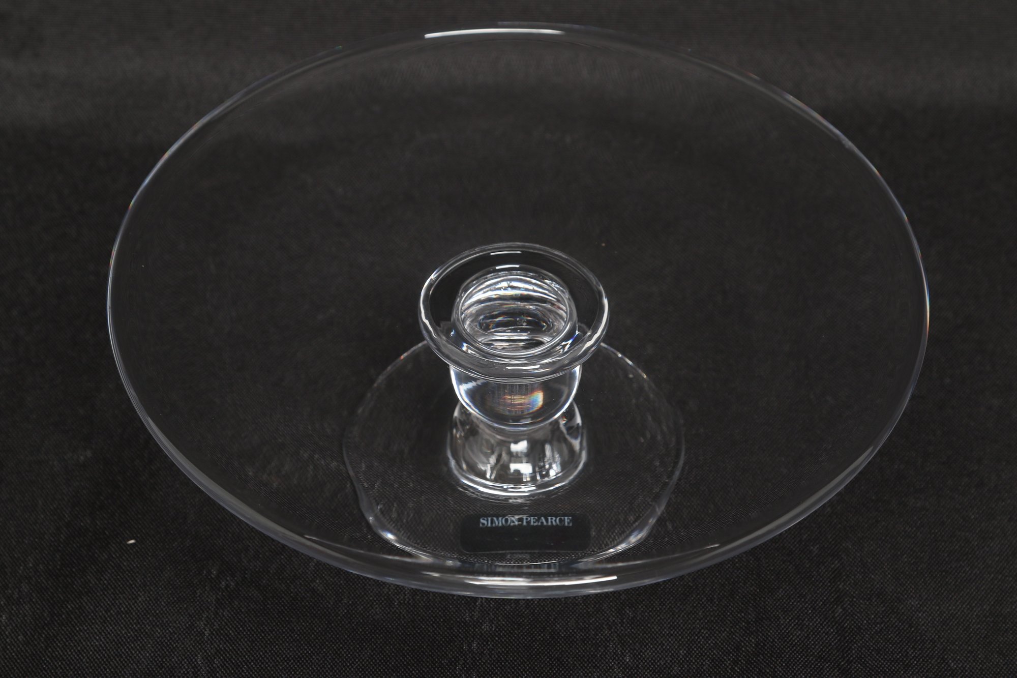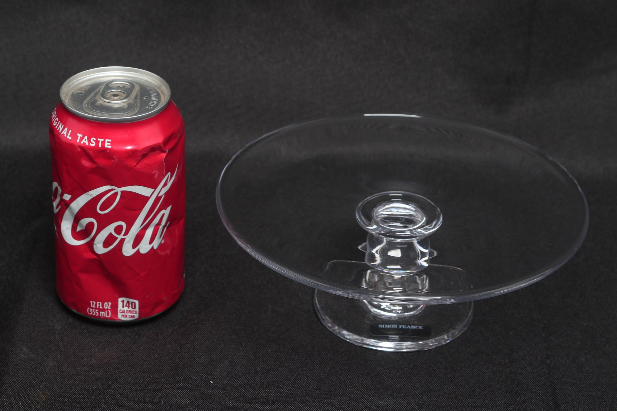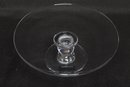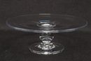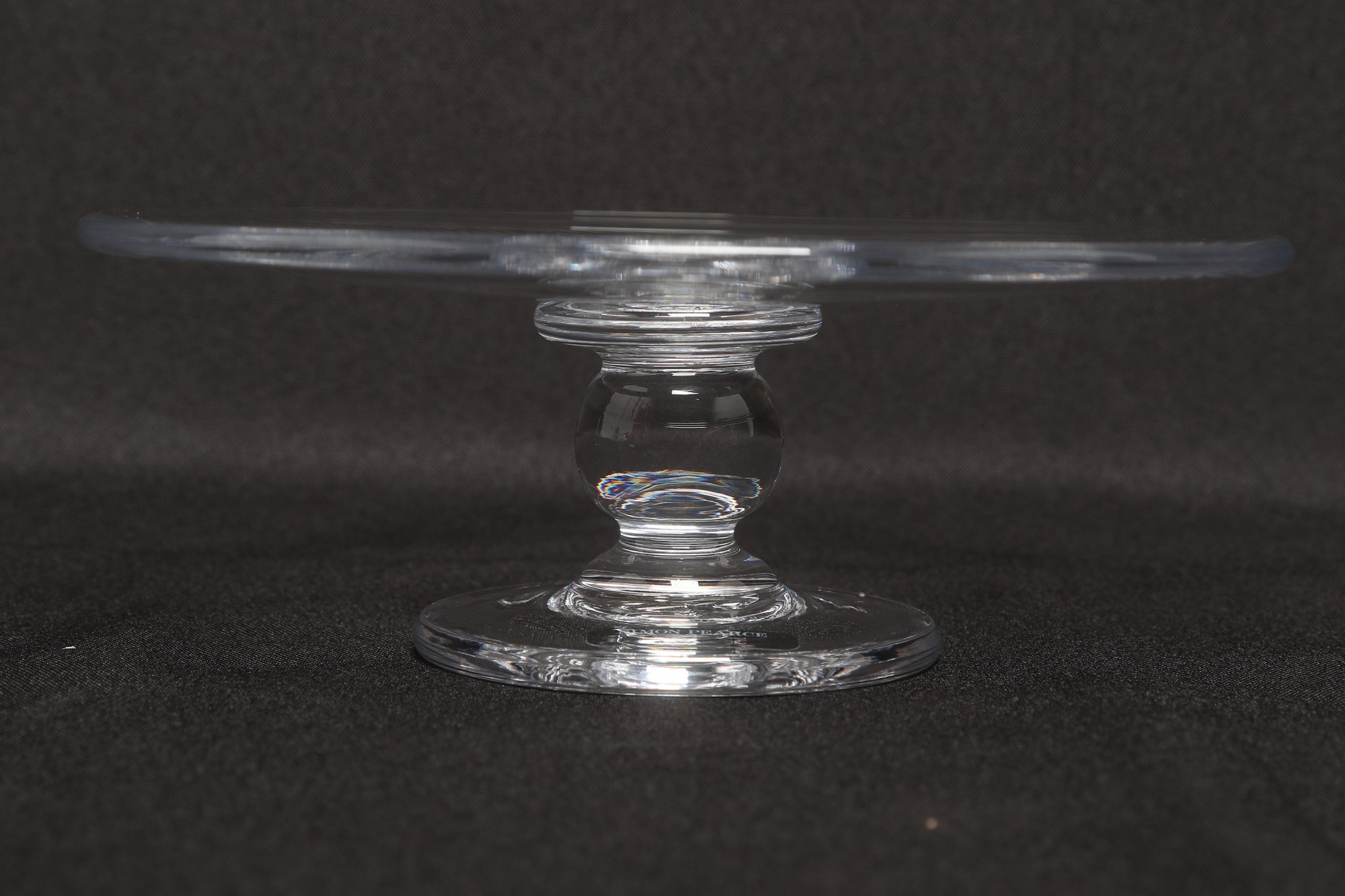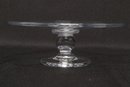 Simon Pearce hand-blown glass cake stand featuring a wide flat plate with pedestal base. Elegant clear glass design ideal for serving cakes, desserts, or display. Pre-owned with light wear, overall in very good condition.
