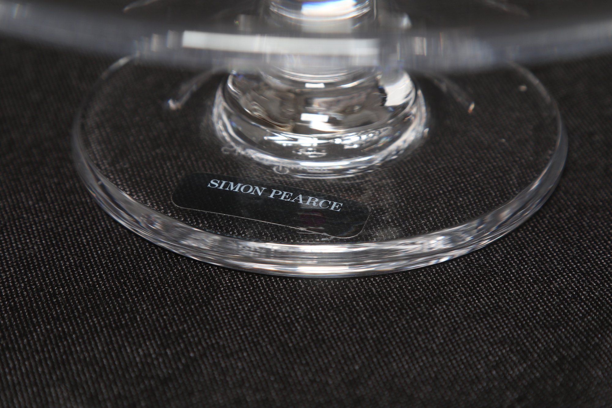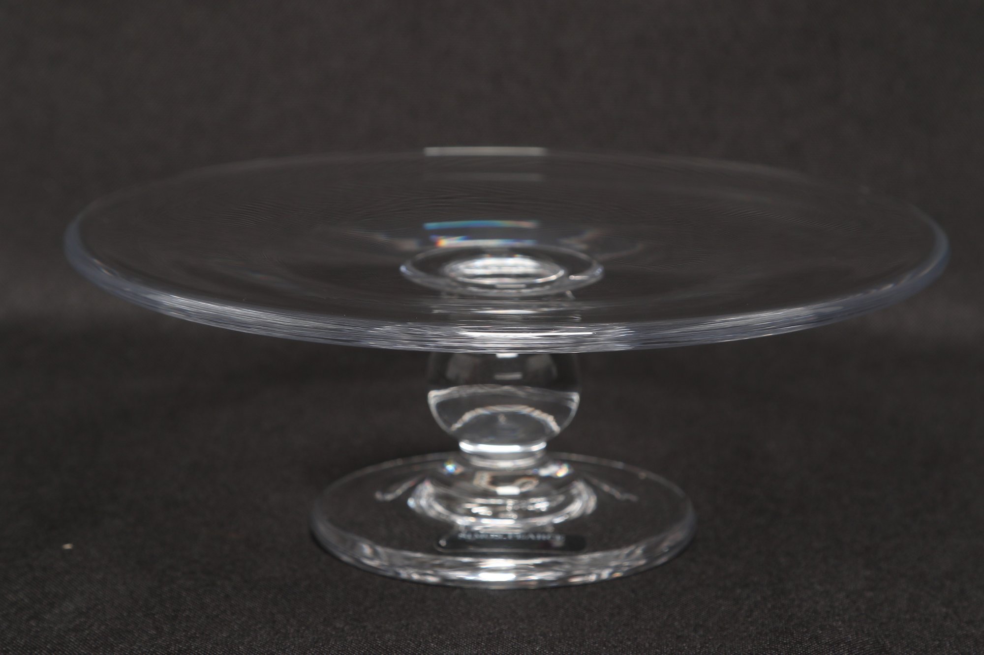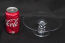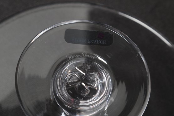 Simon Pearce hand-blown glass cake stand featuring a wide flat plate with pedestal base. Elegant clear glass design ideal for serving cakes, desserts, or display. Pre-owned with light wear, overall in very good condition.