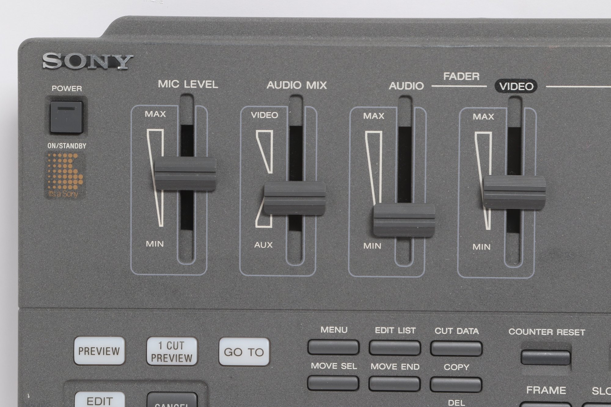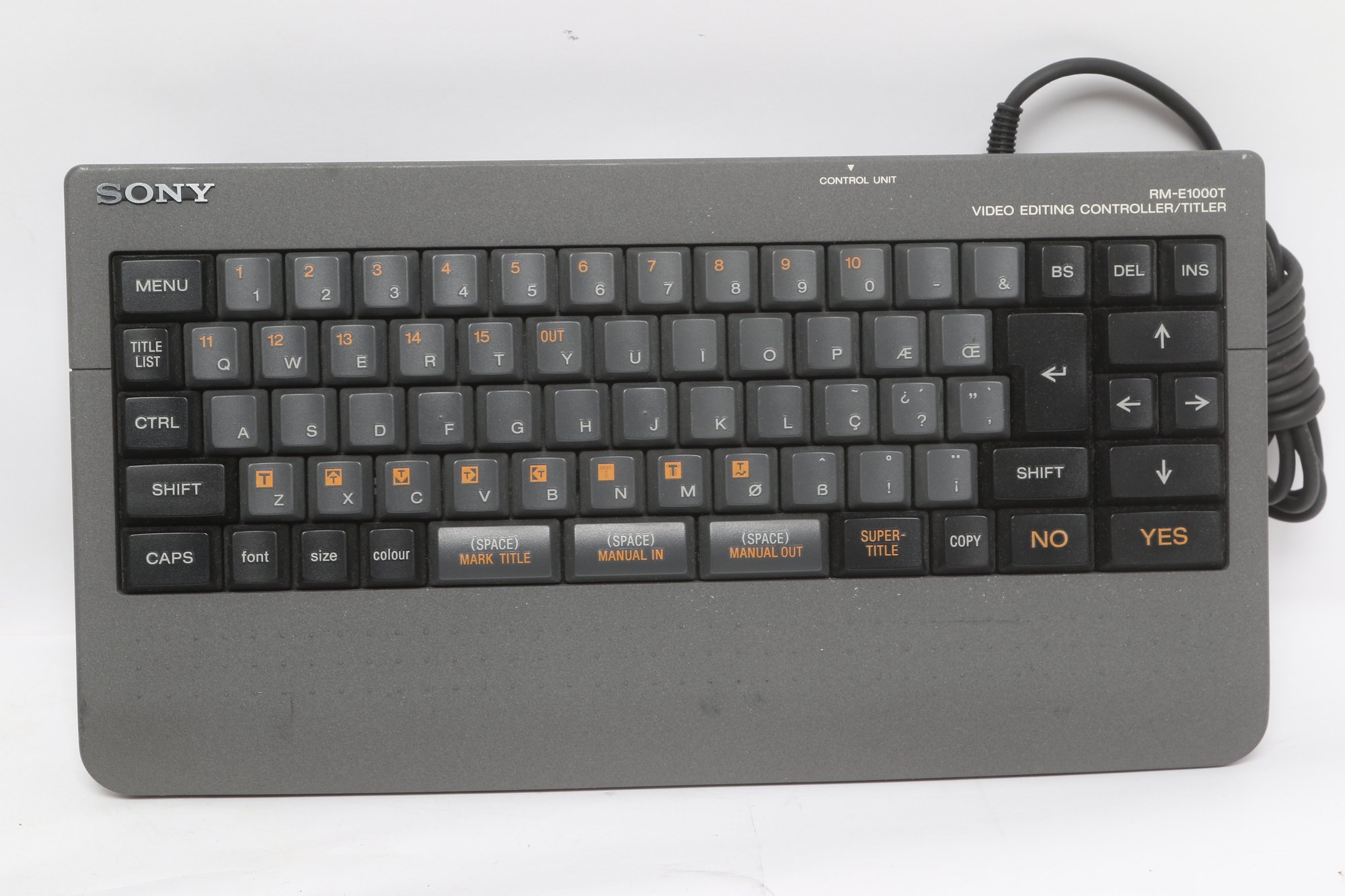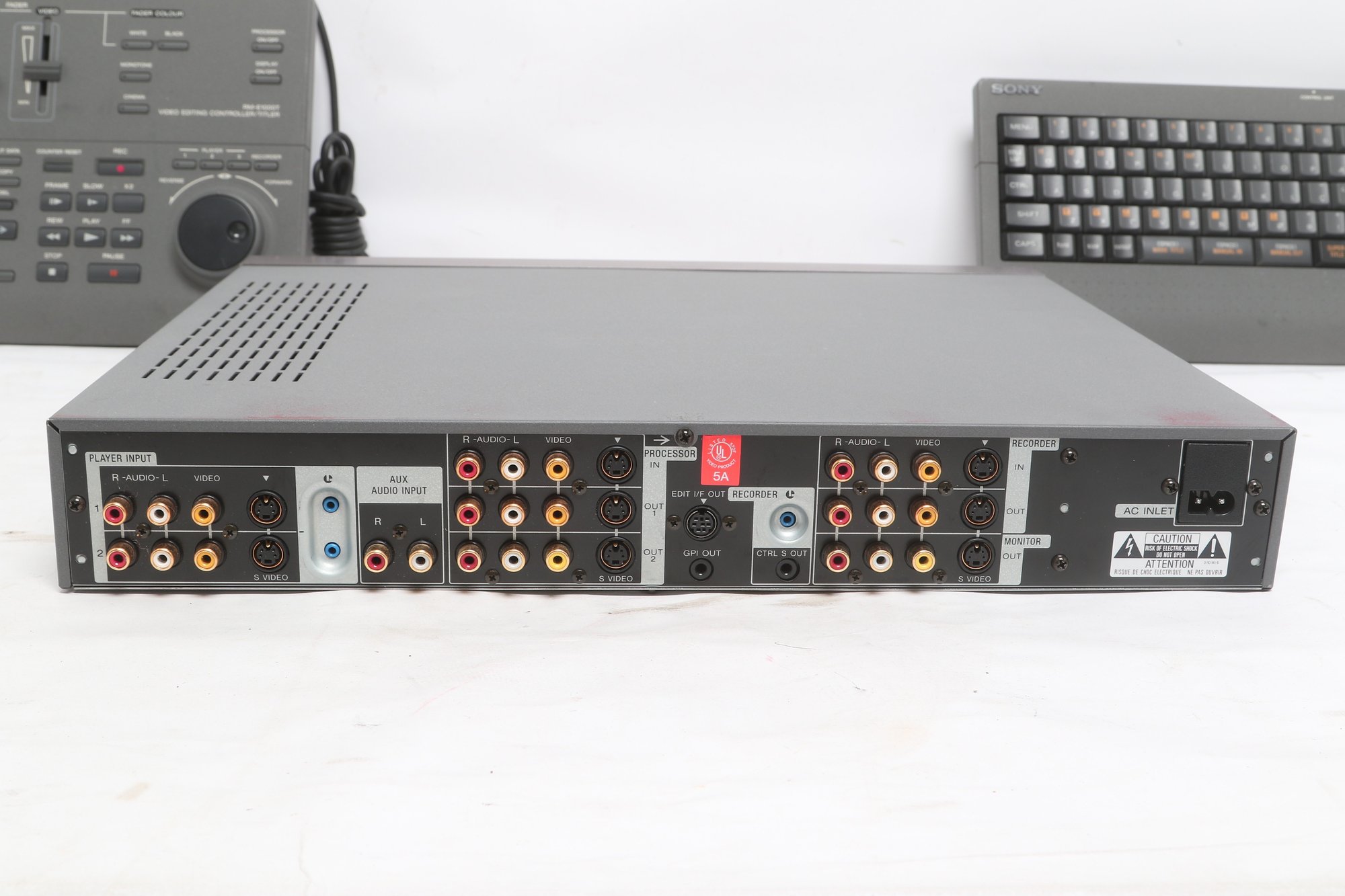 Sony video editing controller system including RM-E1000T unit, control panel, and dedicated keyboard. Designed for professional editing with multiple controls and jog/shuttle dial for precision use. From the estate of famed French fashion designer Thierry Mugler. Pre-owned with visible wear, tested for power.