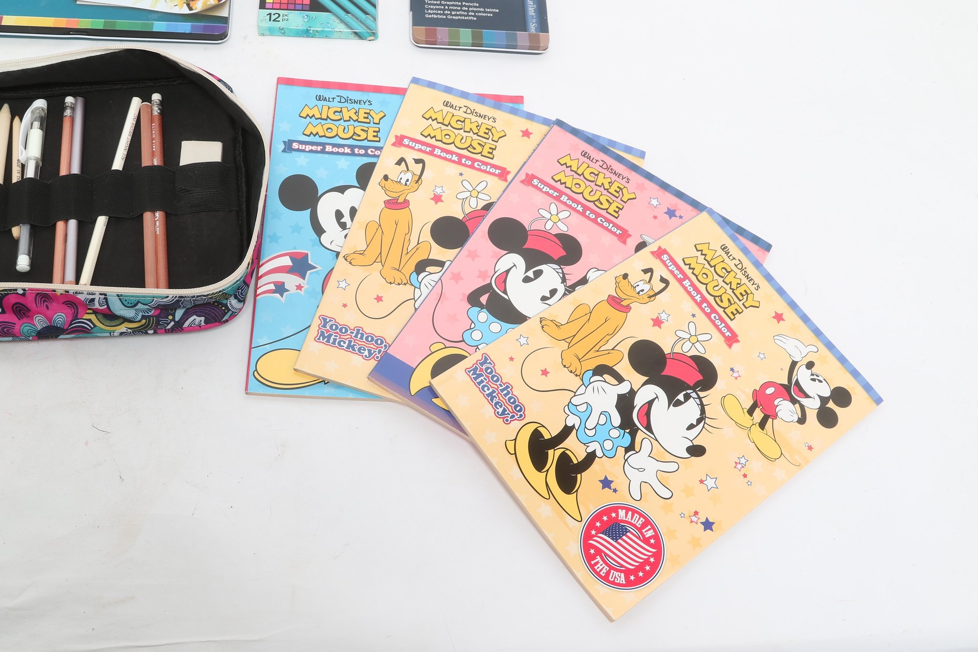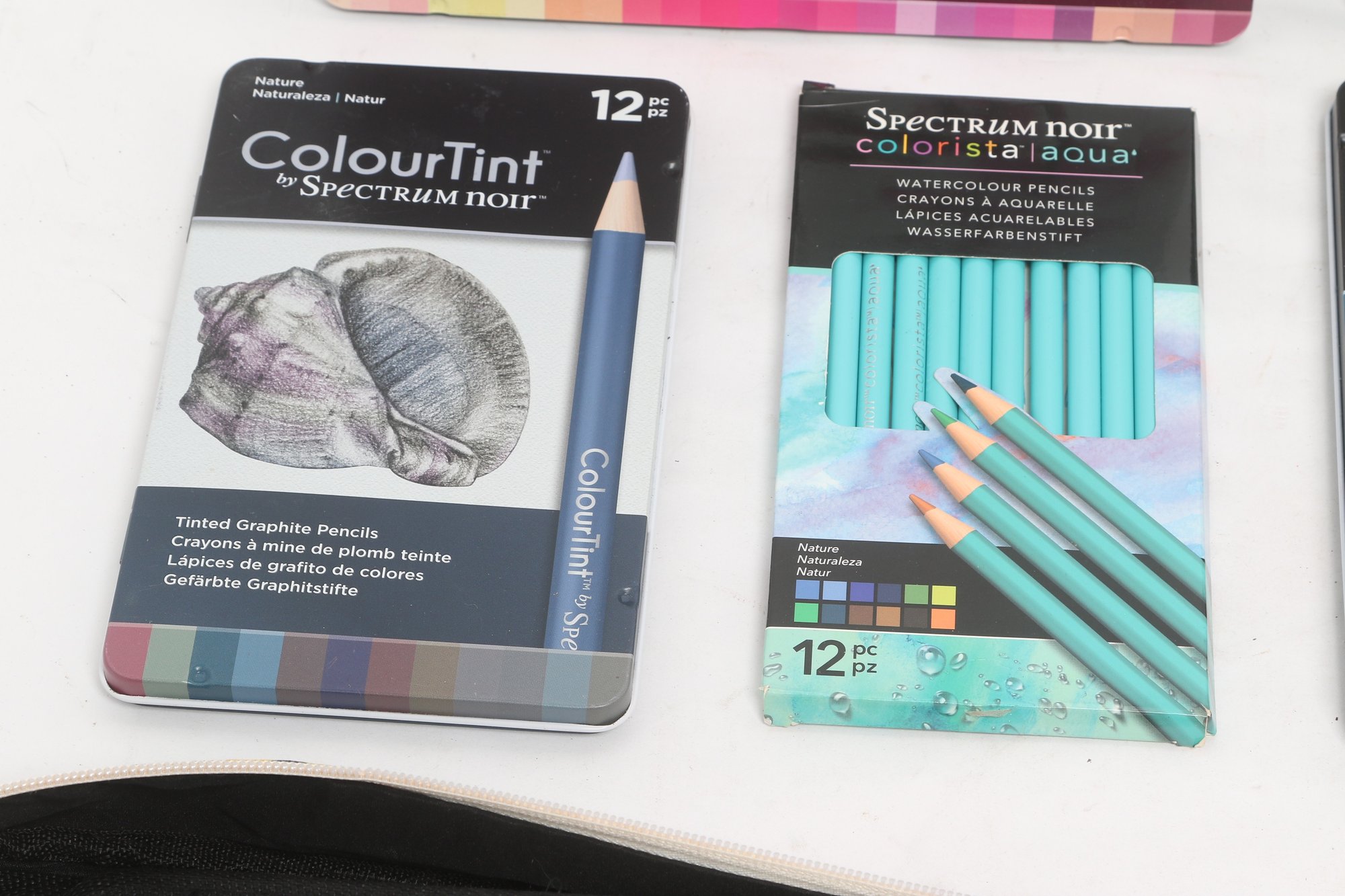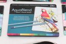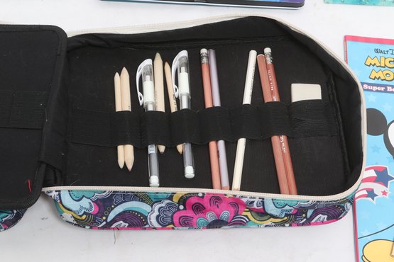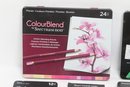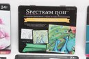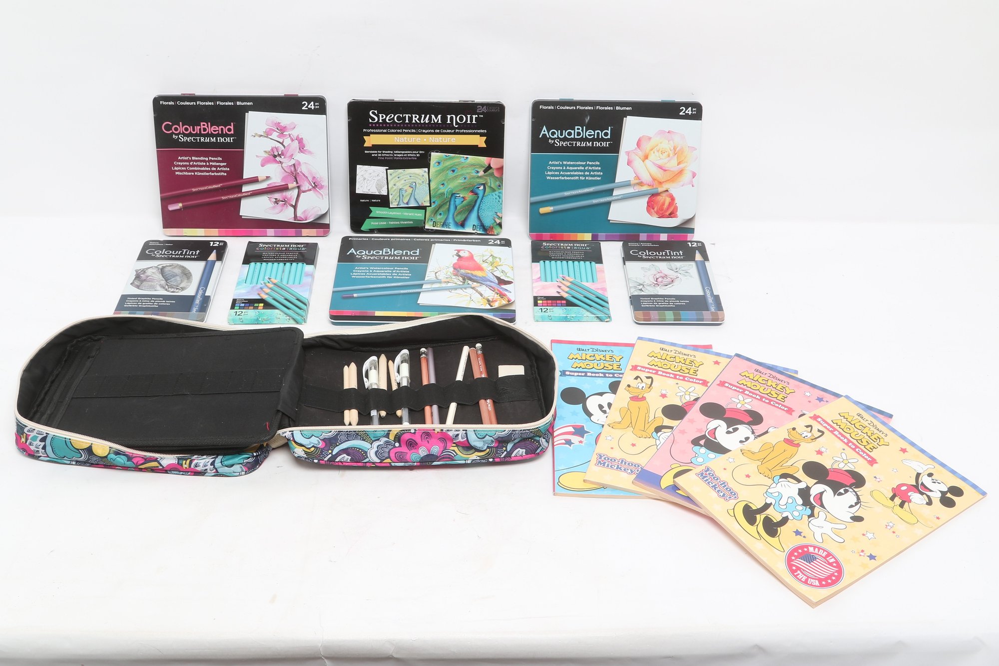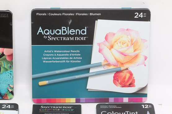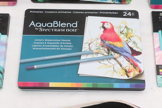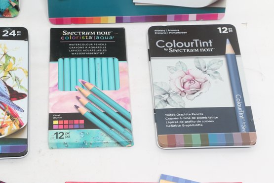 Large lot of Spectrum Noir colored pencil sets including ColourBlend, AquaBlend, ColourTint, and additional accessories, along with carrying cases and several Disney coloring books. Items appear lightly used to unused in original packaging. Great assortment for artists, hobbyists, or beginners.
