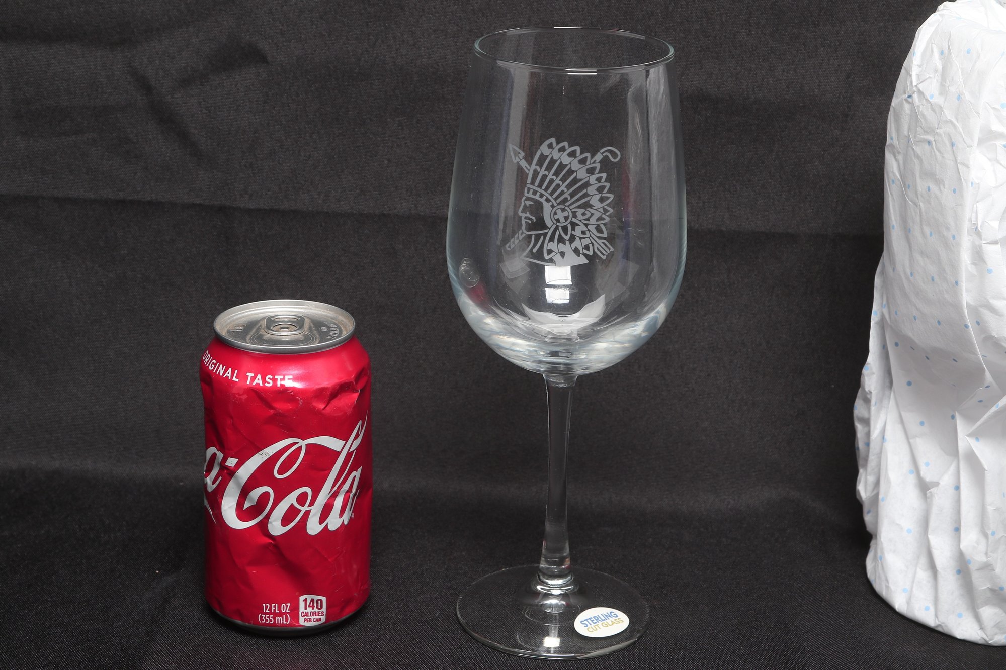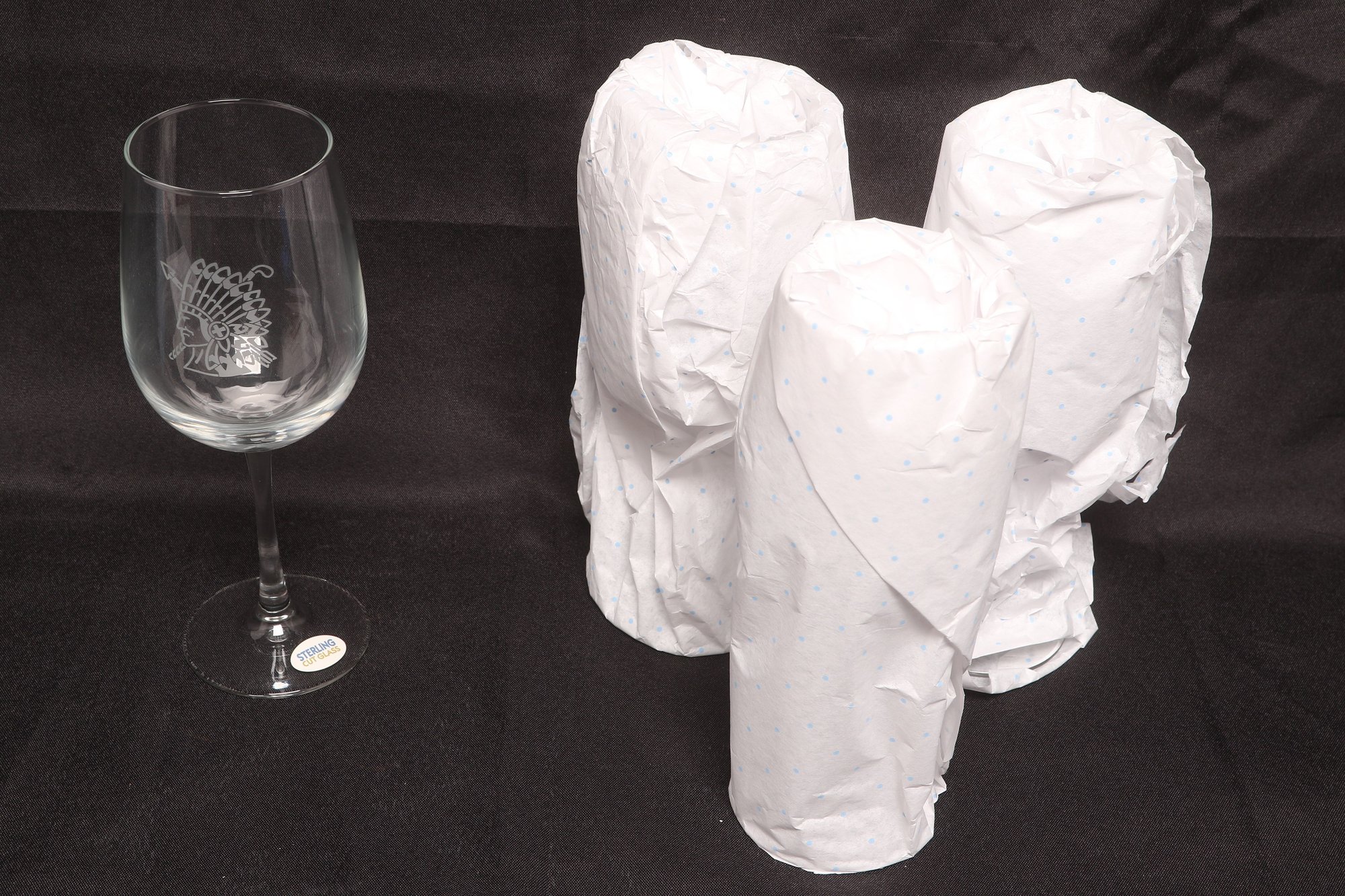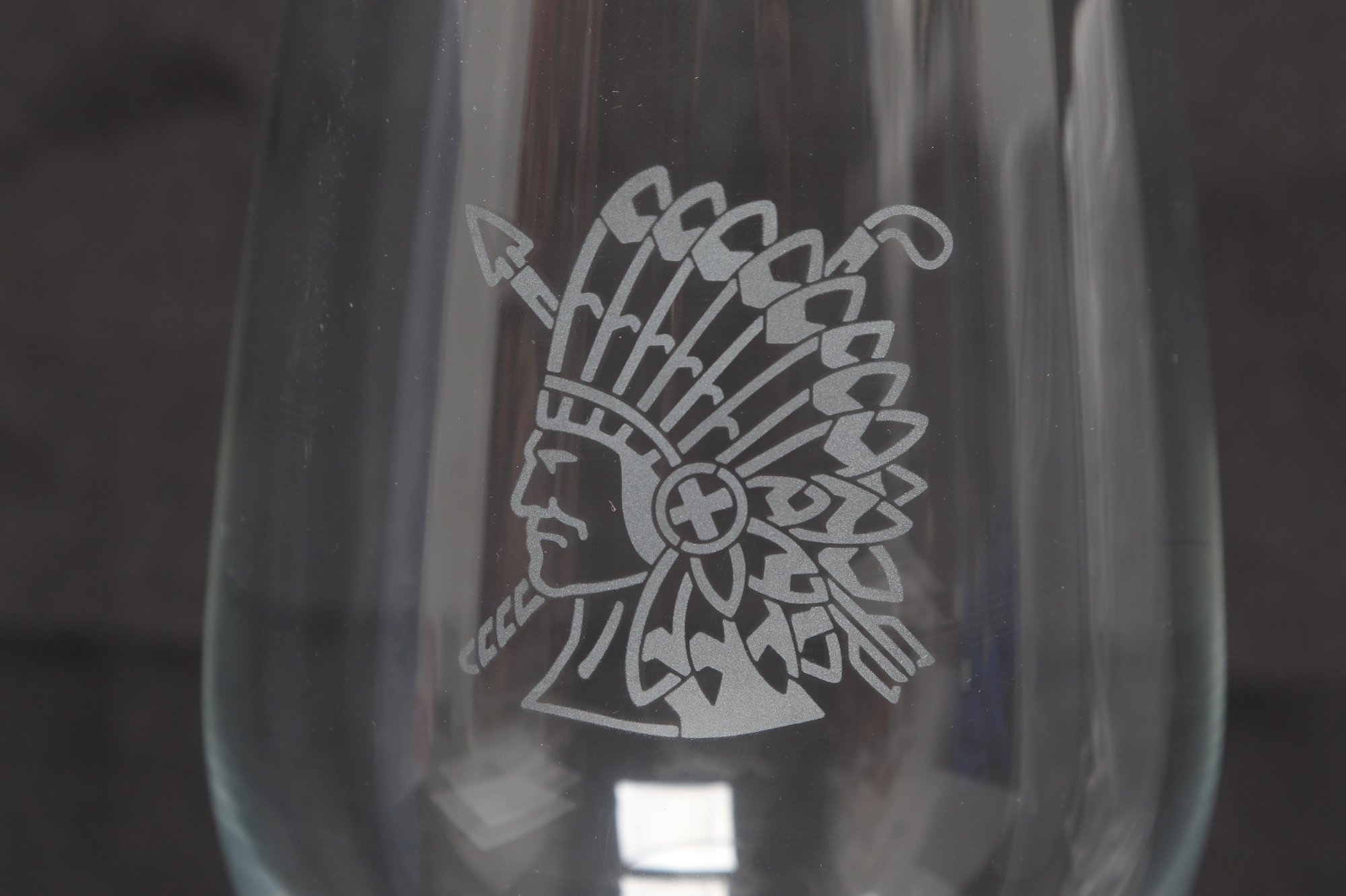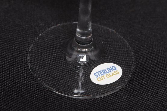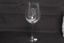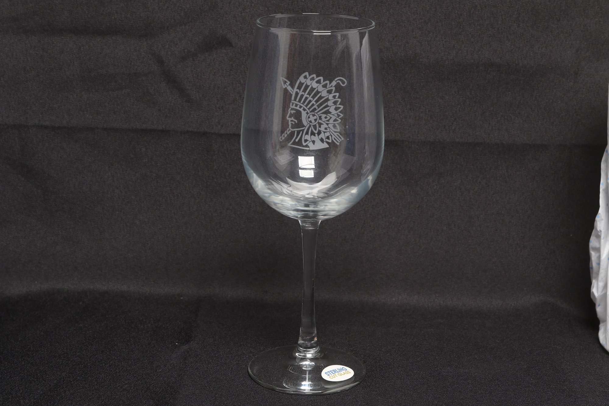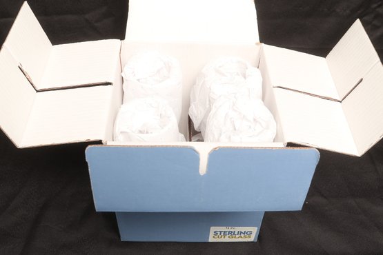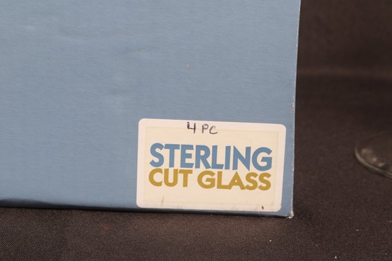 Set of four Sterling Cut Glass goblets featuring an etched Native American profile design. Elegant stemware with clear glass construction, presented in original box. New and unused condition, ideal for entertaining or display.