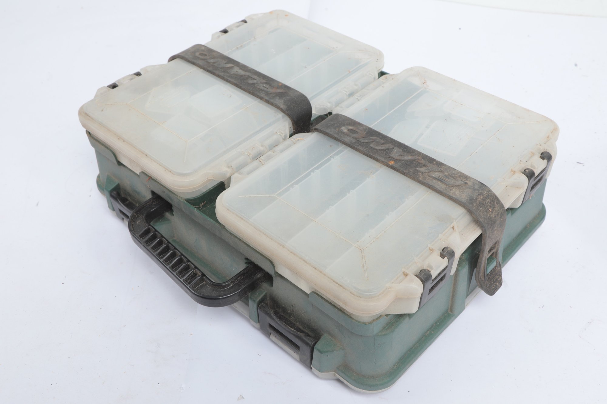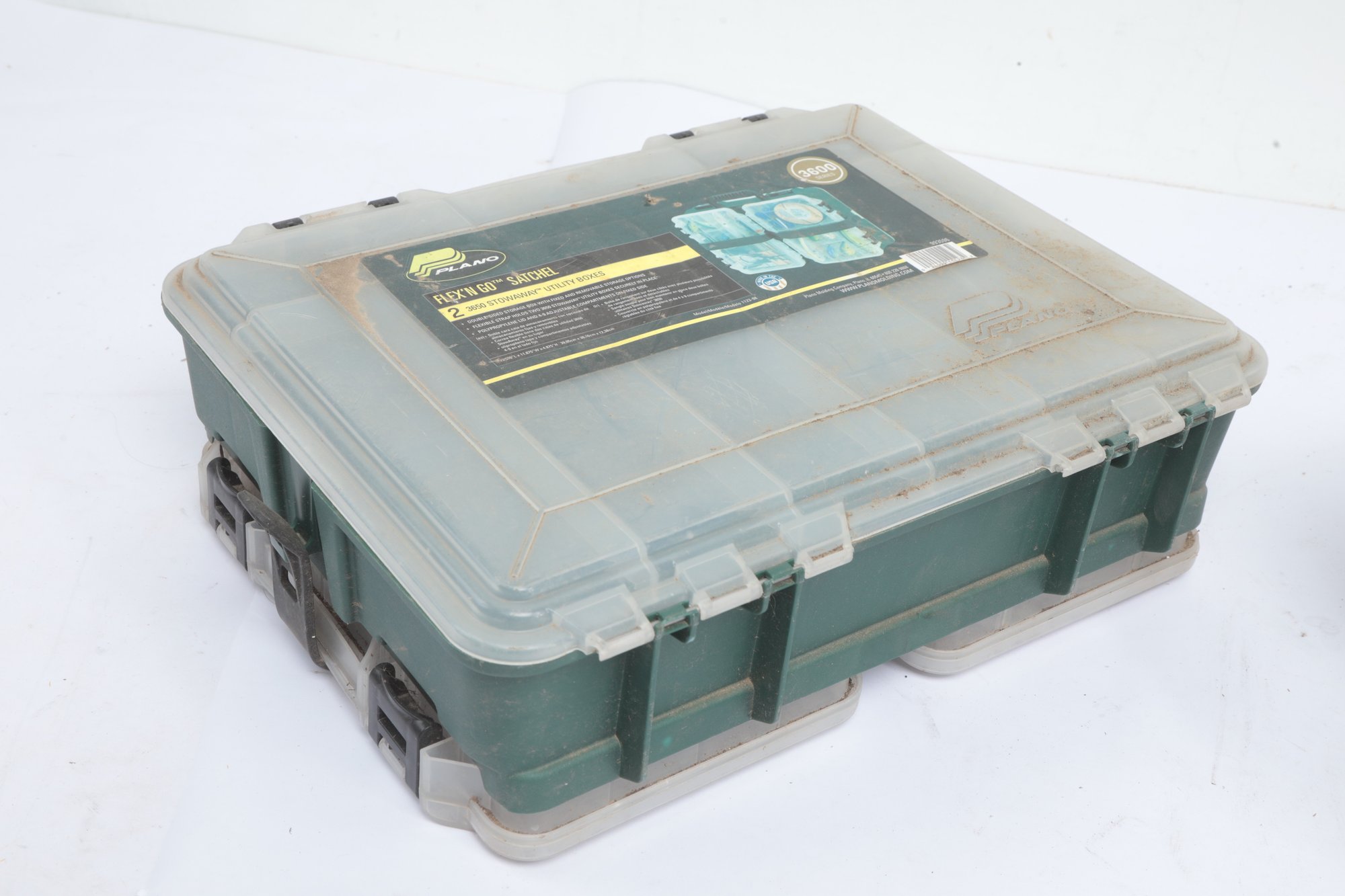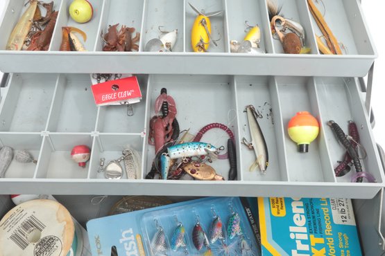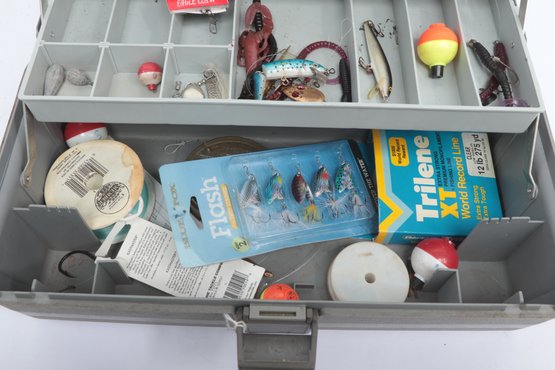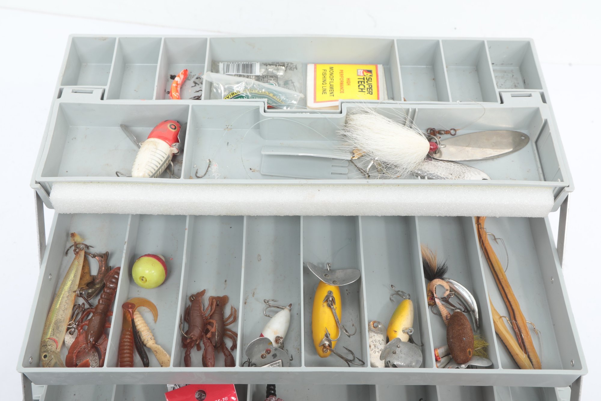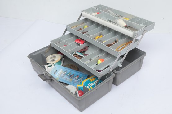 Tackle And Utility Box W/ Lures And Accessories. See pictures carefully for details on contents included with lot and condition.