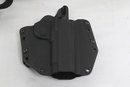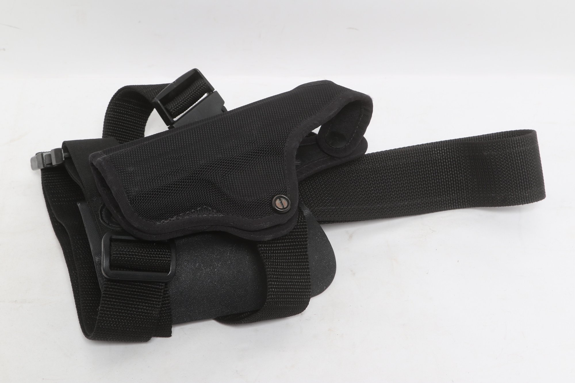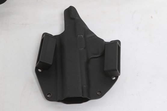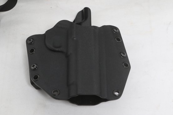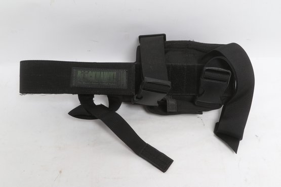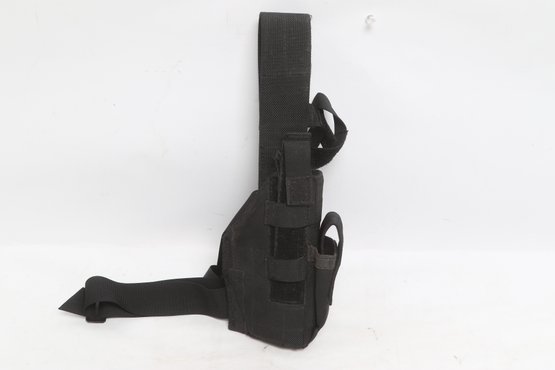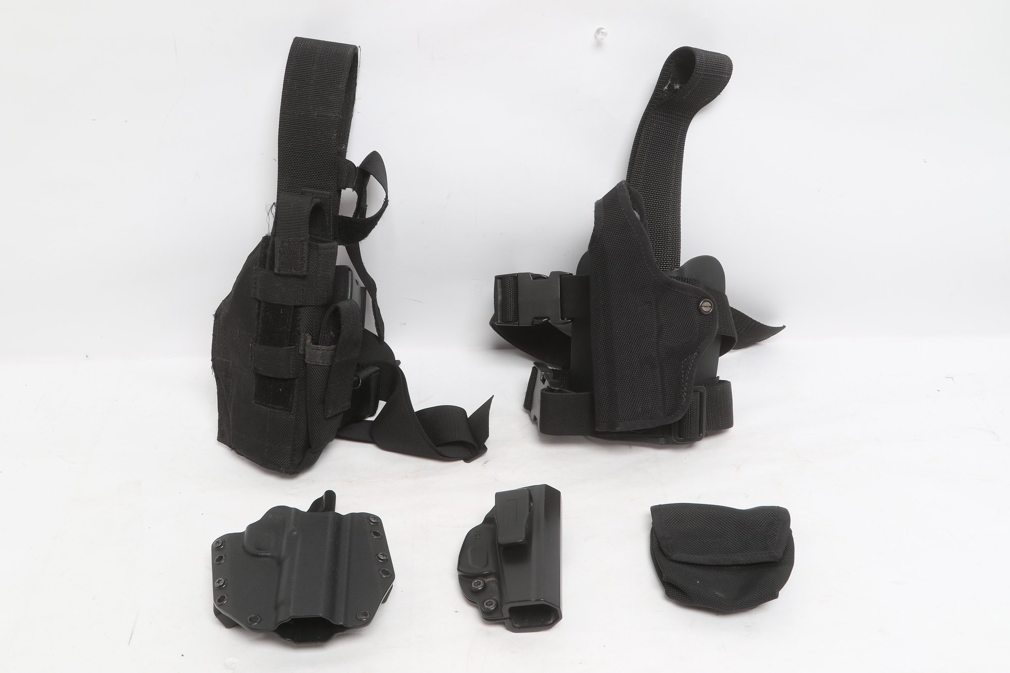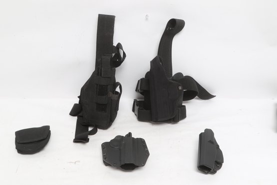 Assorted lot of five tactical holsters and accessories including DeSantis, Blackhawk, and SCY brands. Includes two drop leg holsters and two kydex holsters along with additional accessory. Durable construction in nylon and polymer. Pre-owned with light wear, suitable for range use or duty gear.
