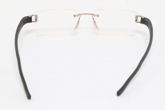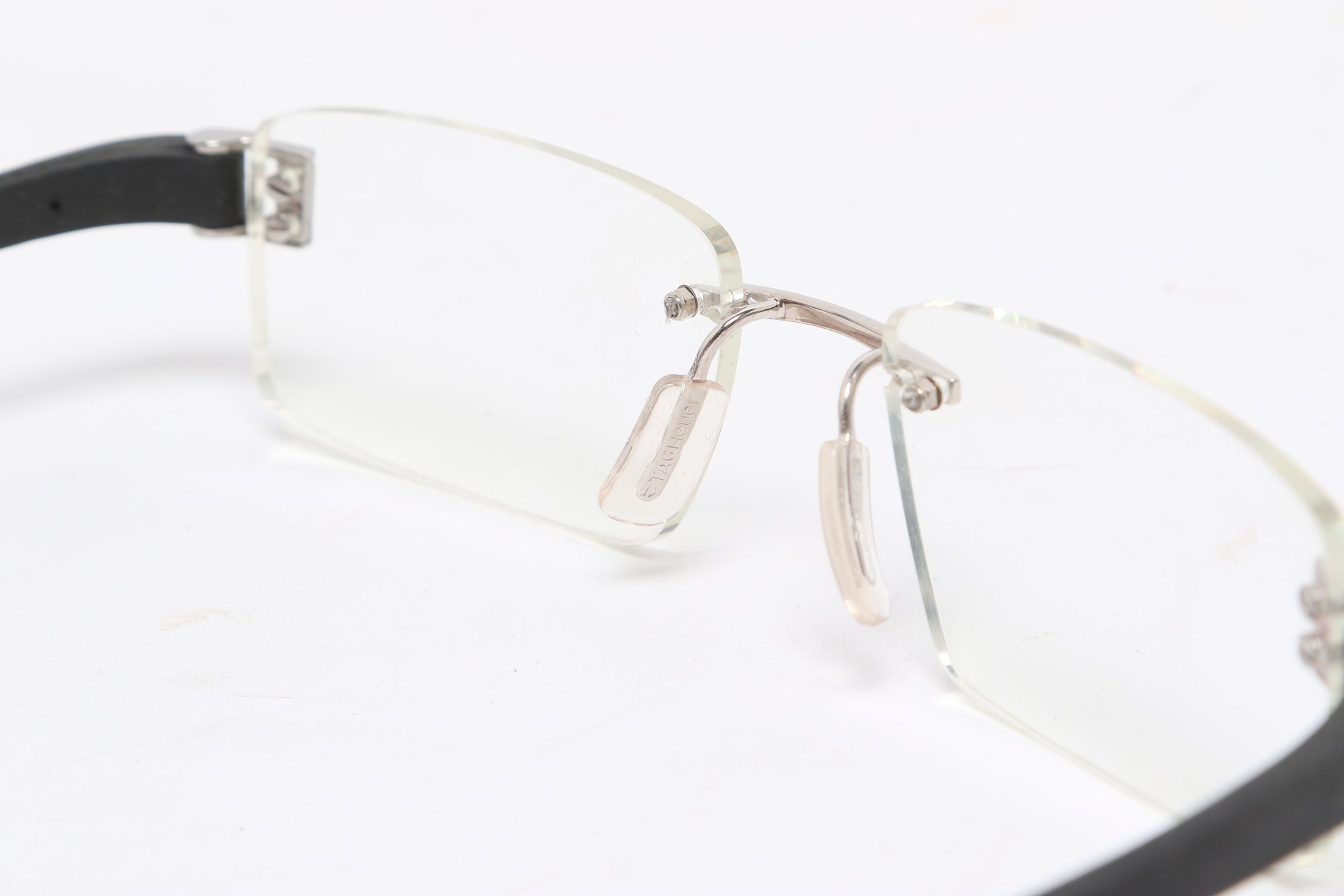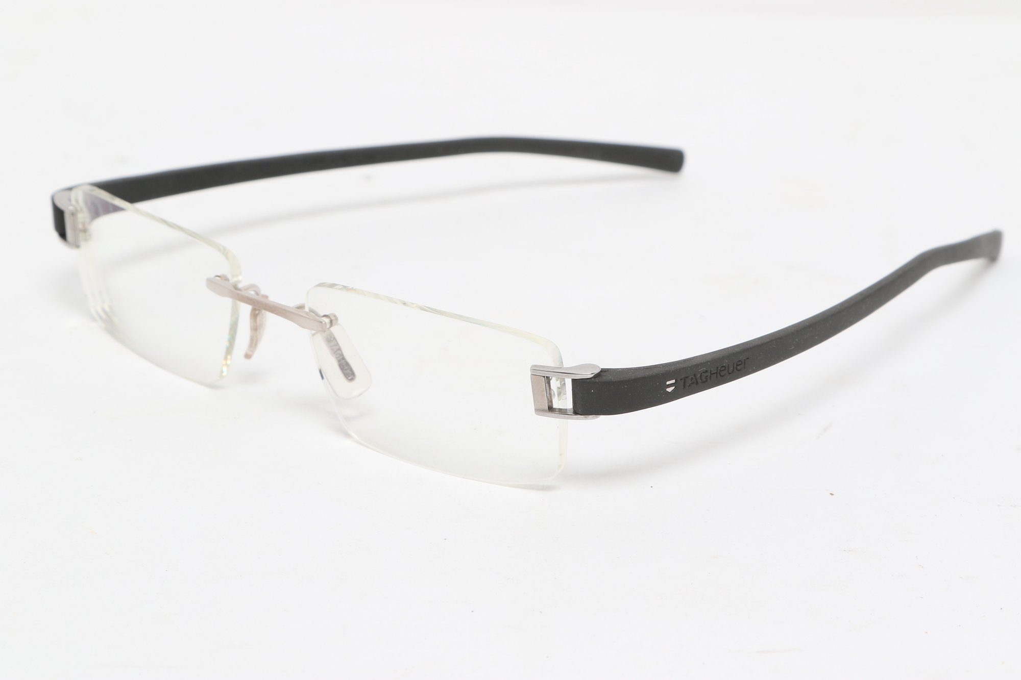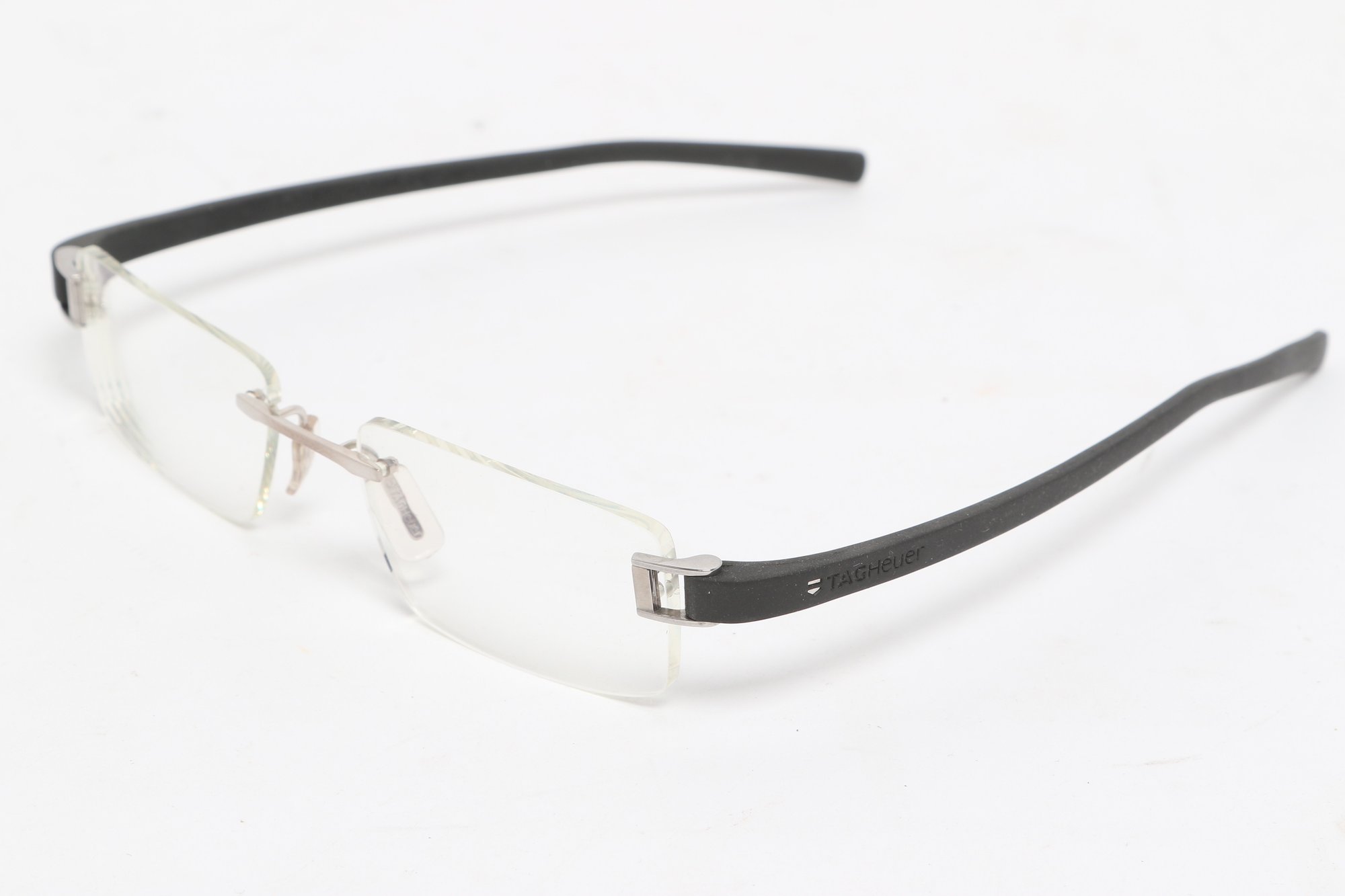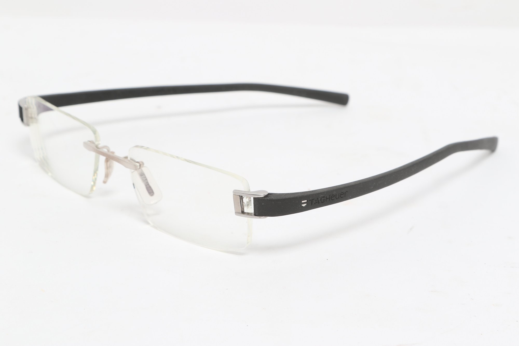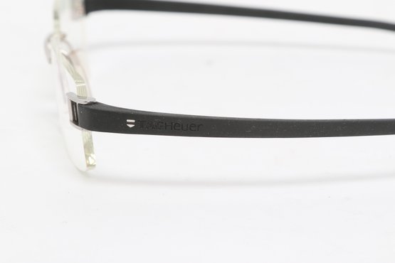 Tag Heuer TH 7101 rimless eyeglasses featuring sleek black temples and lightweight design. Currently fitted with prescription lenses (frames only value); lenses should be replaced. Pre-owned with light wear.