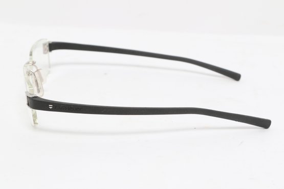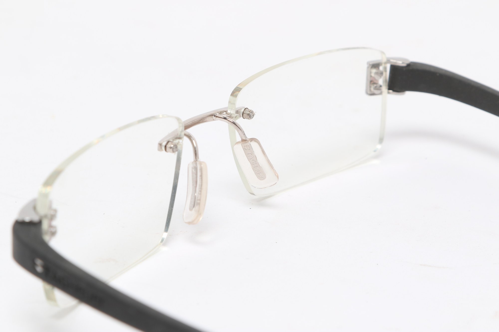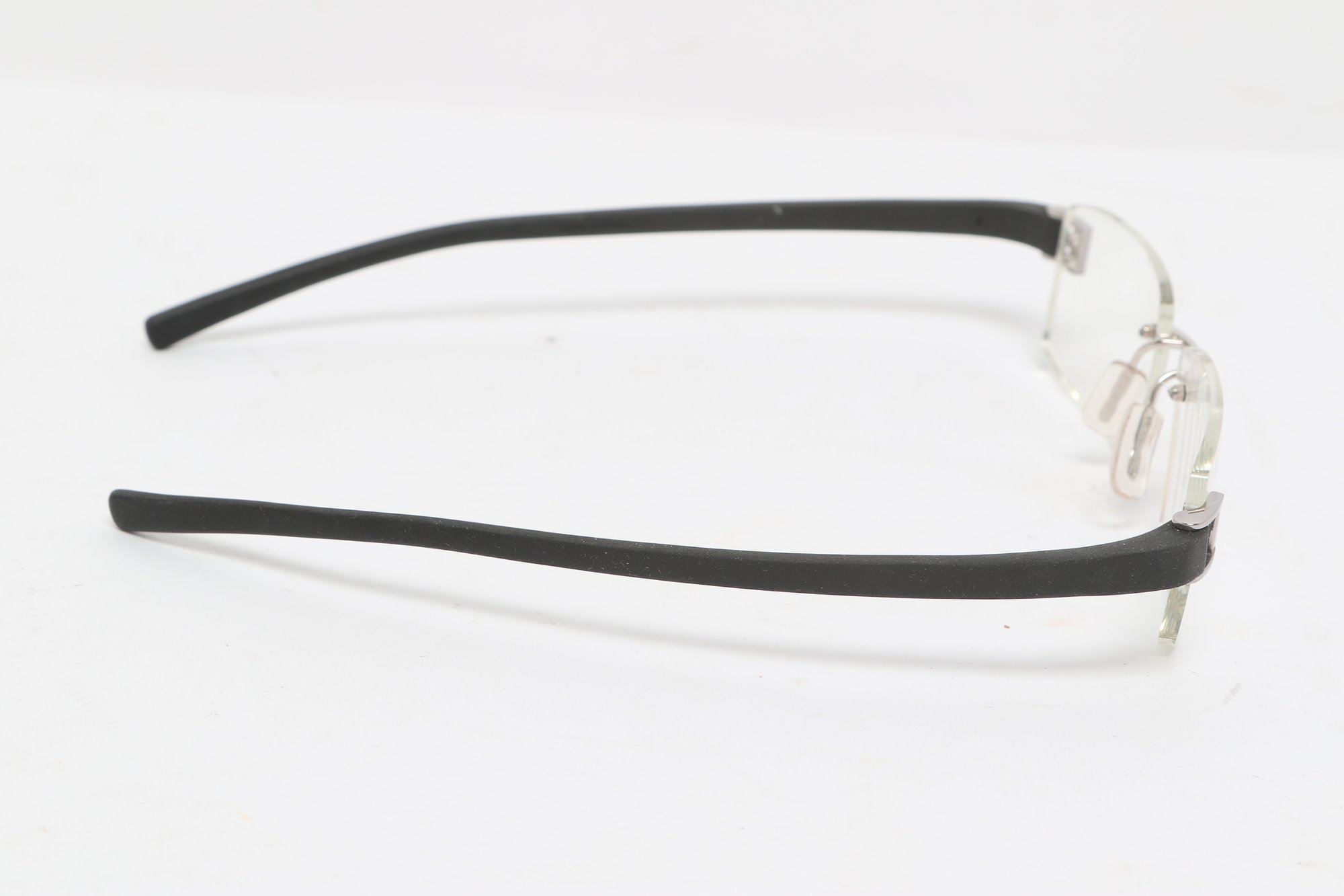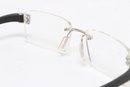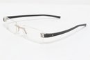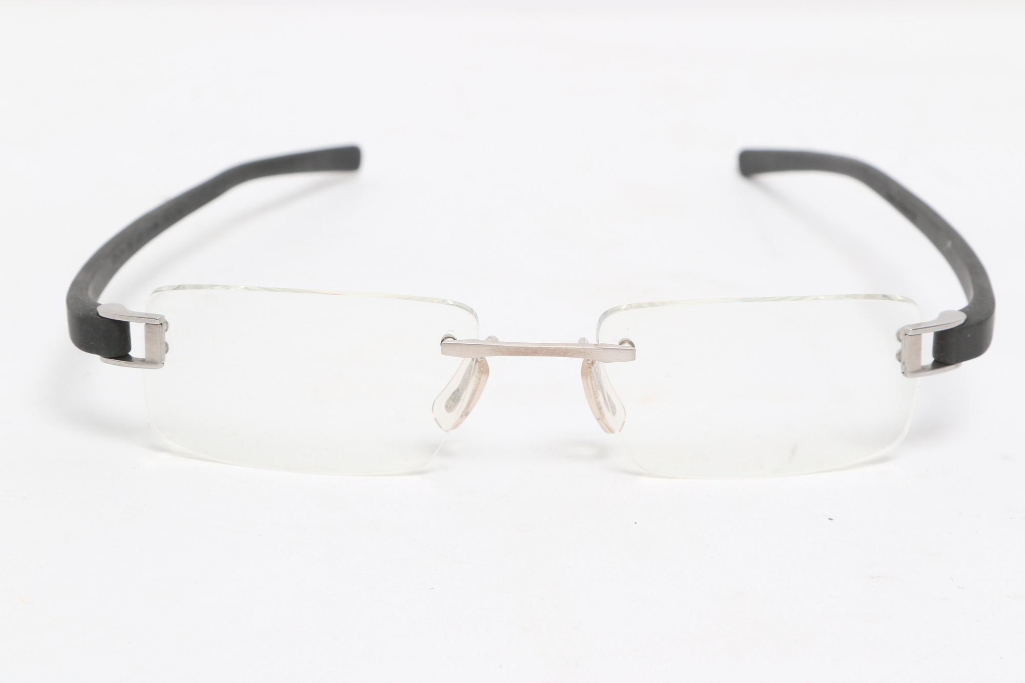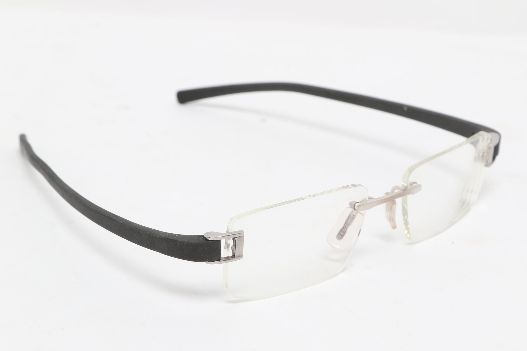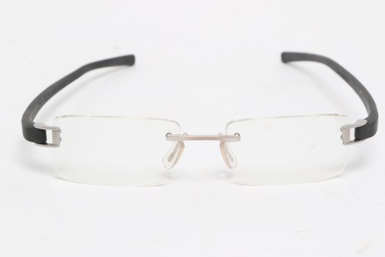 Tag Heuer TH 7101 rimless eyeglasses featuring sleek black temples and lightweight design. Currently fitted with prescription lenses (frames only value); lenses should be replaced. Pre-owned with light wear.