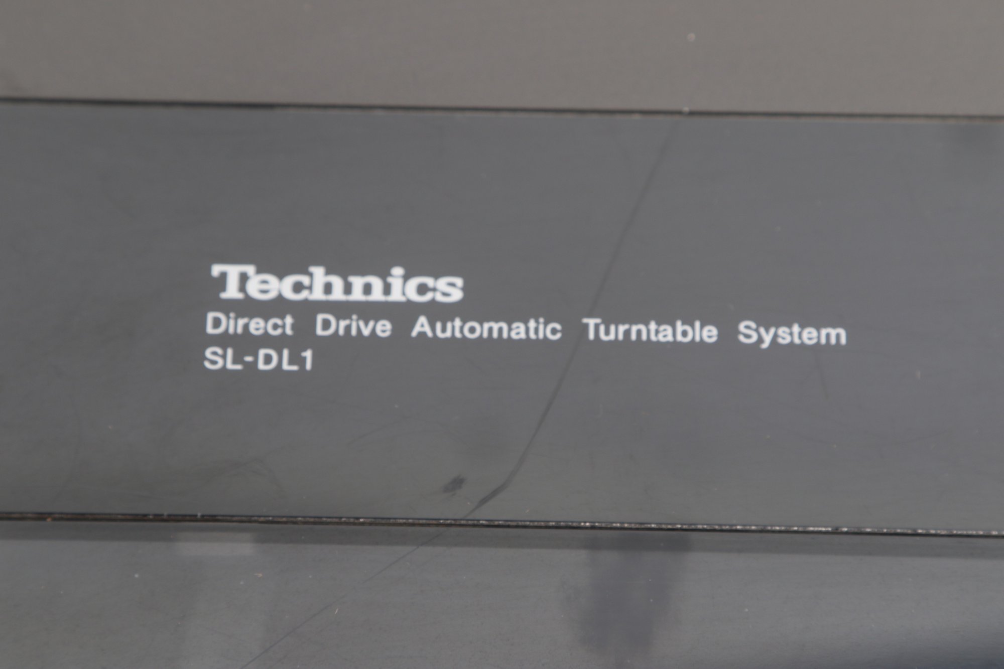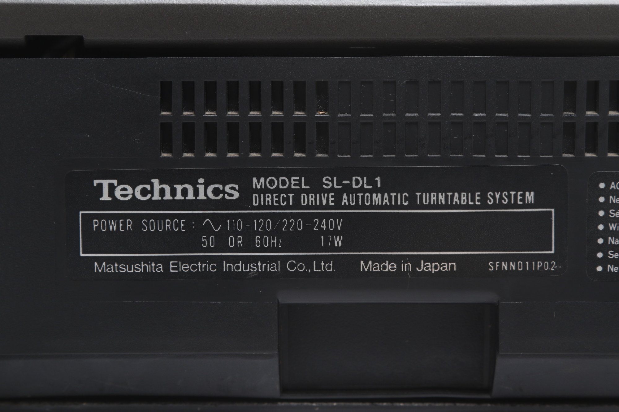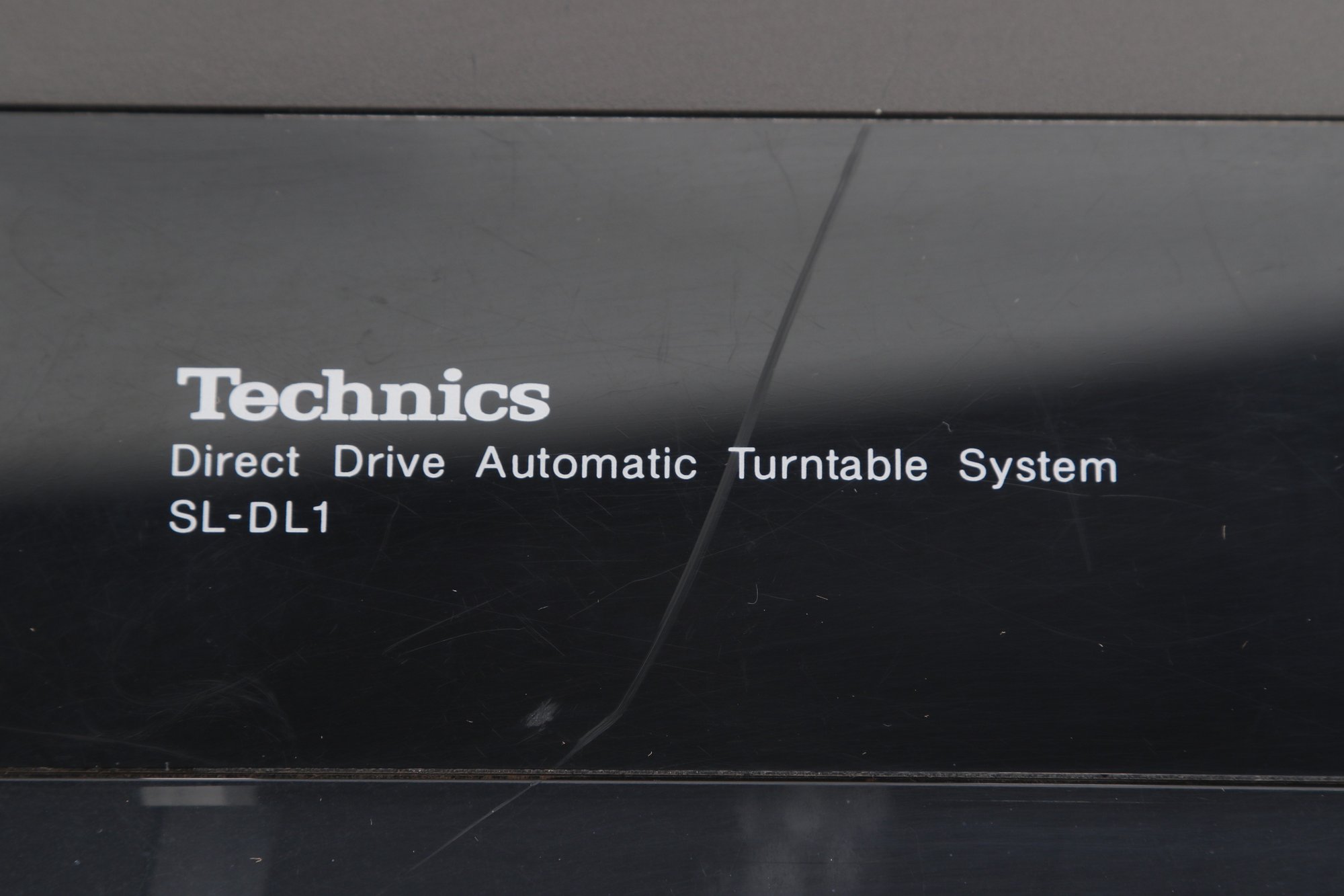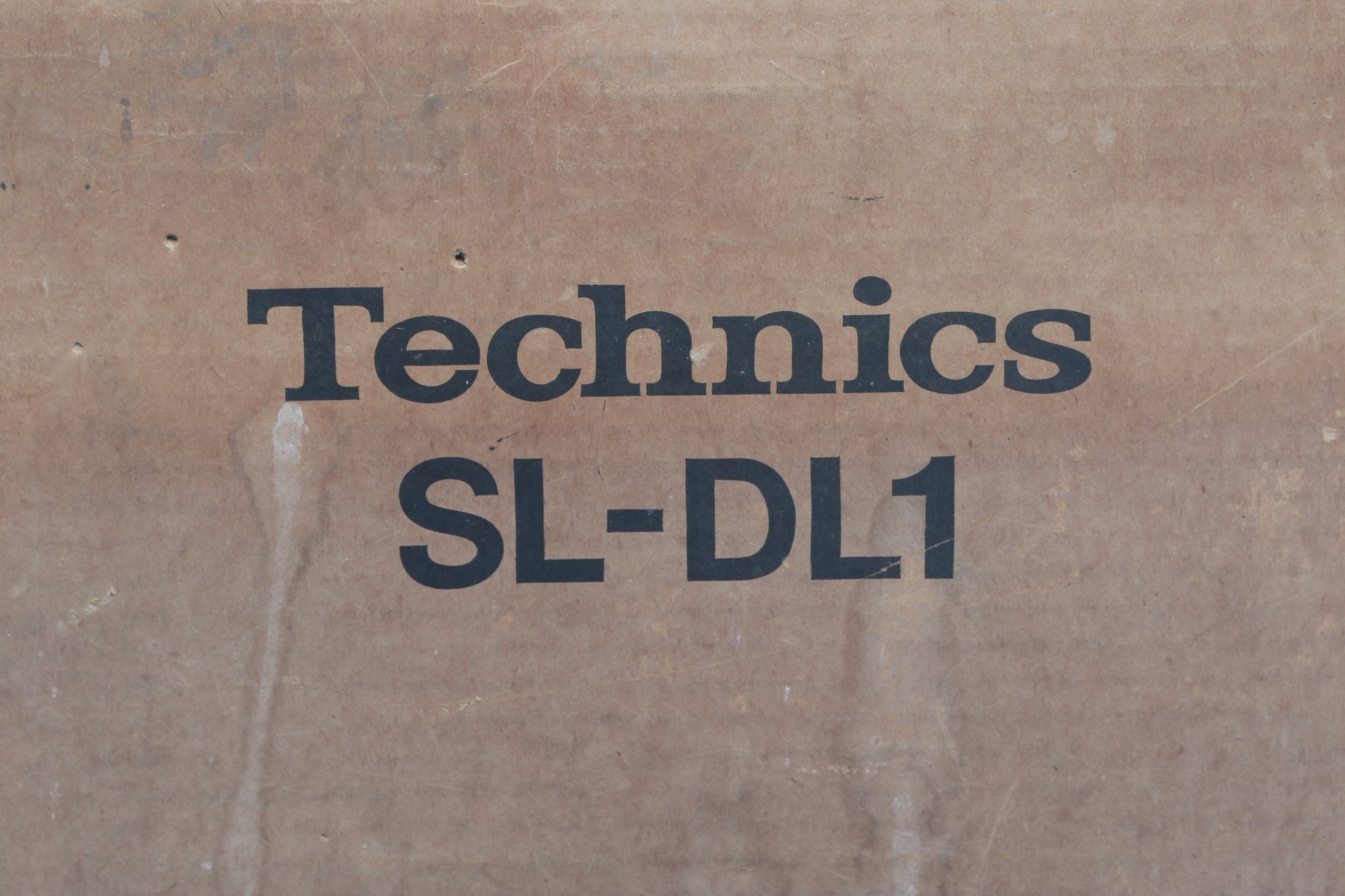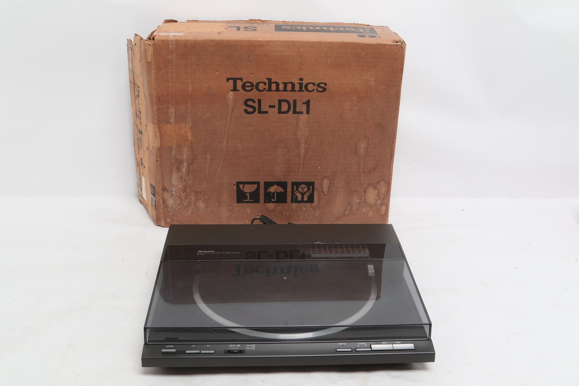 Vintage Technics SL-DL1 direct drive linear tracking turntable, made in Japan. Features fully automatic operation with sleek low-profile design and dust cover. Tested and functions as intended. Includes original box showing storage wear. Pre-owned with light cosmetic wear consistent with age.