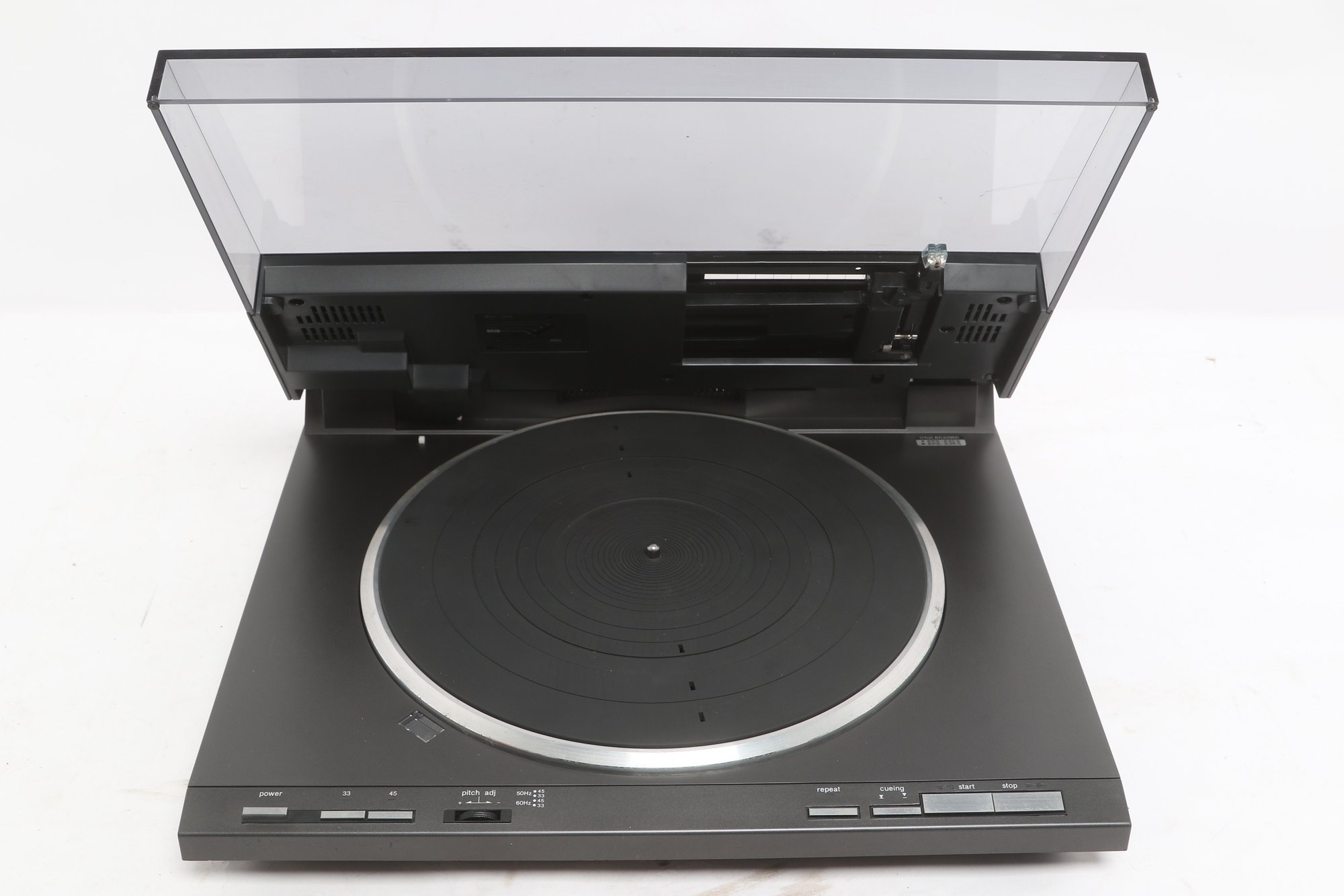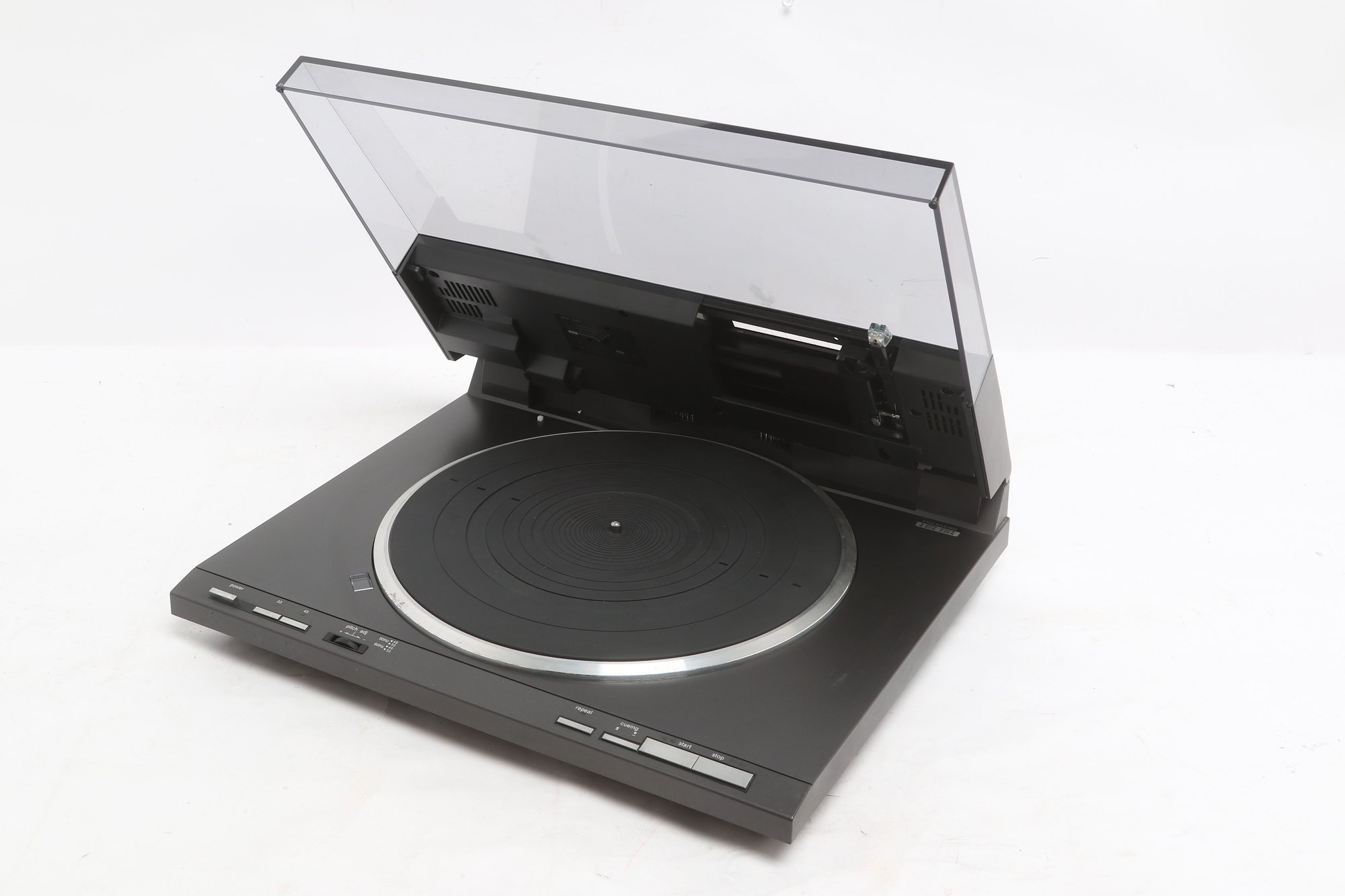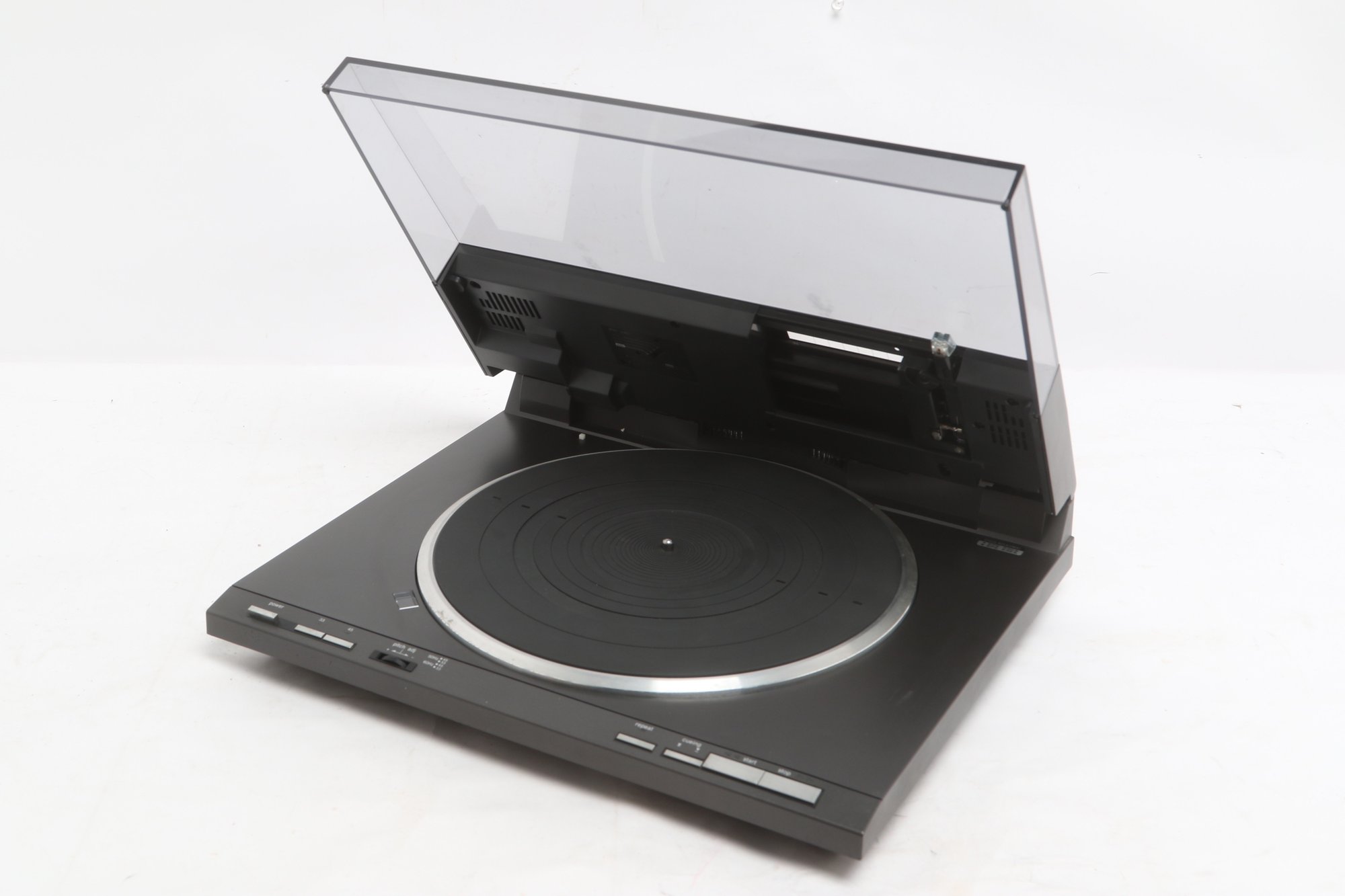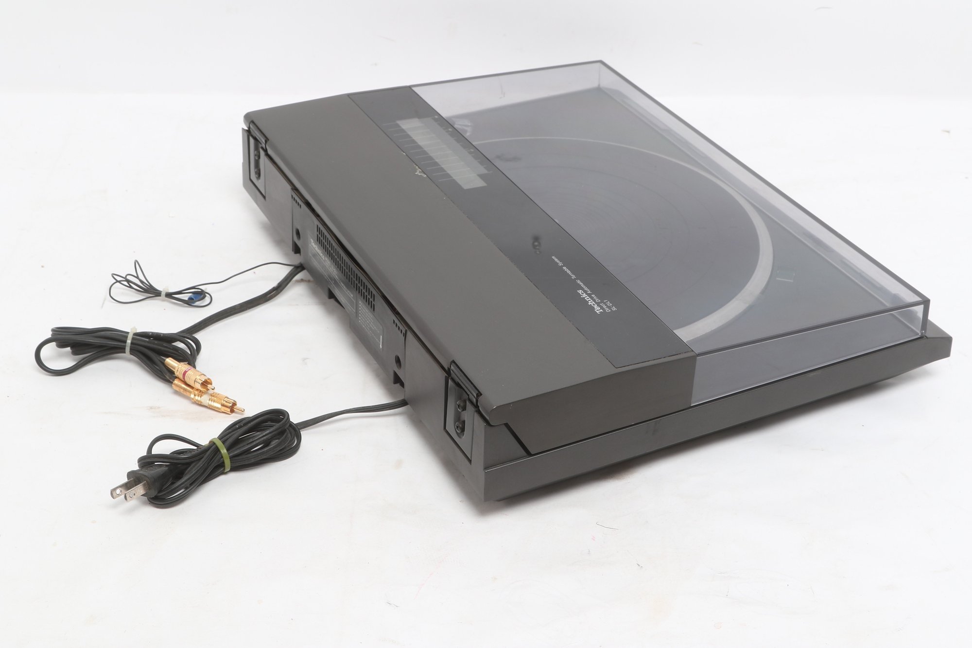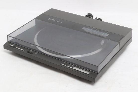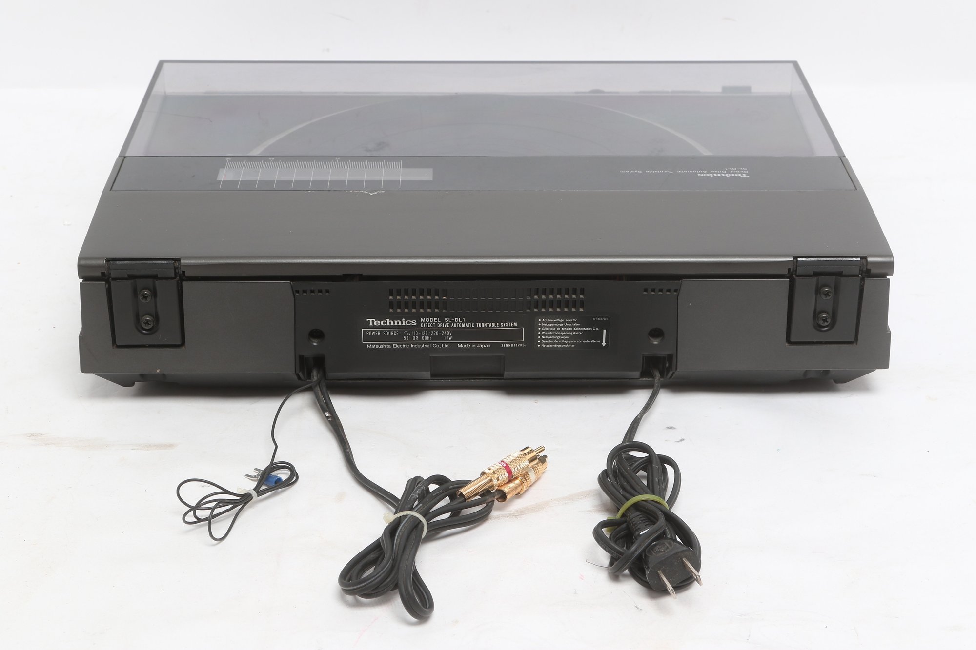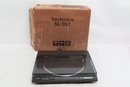 Vintage Technics SL-DL1 direct drive linear tracking turntable, made in Japan. Features fully automatic operation with sleek low-profile design and dust cover. Tested and functions as intended. Includes original box showing storage wear. Pre-owned with light cosmetic wear consistent with age.