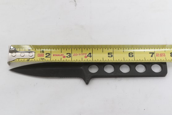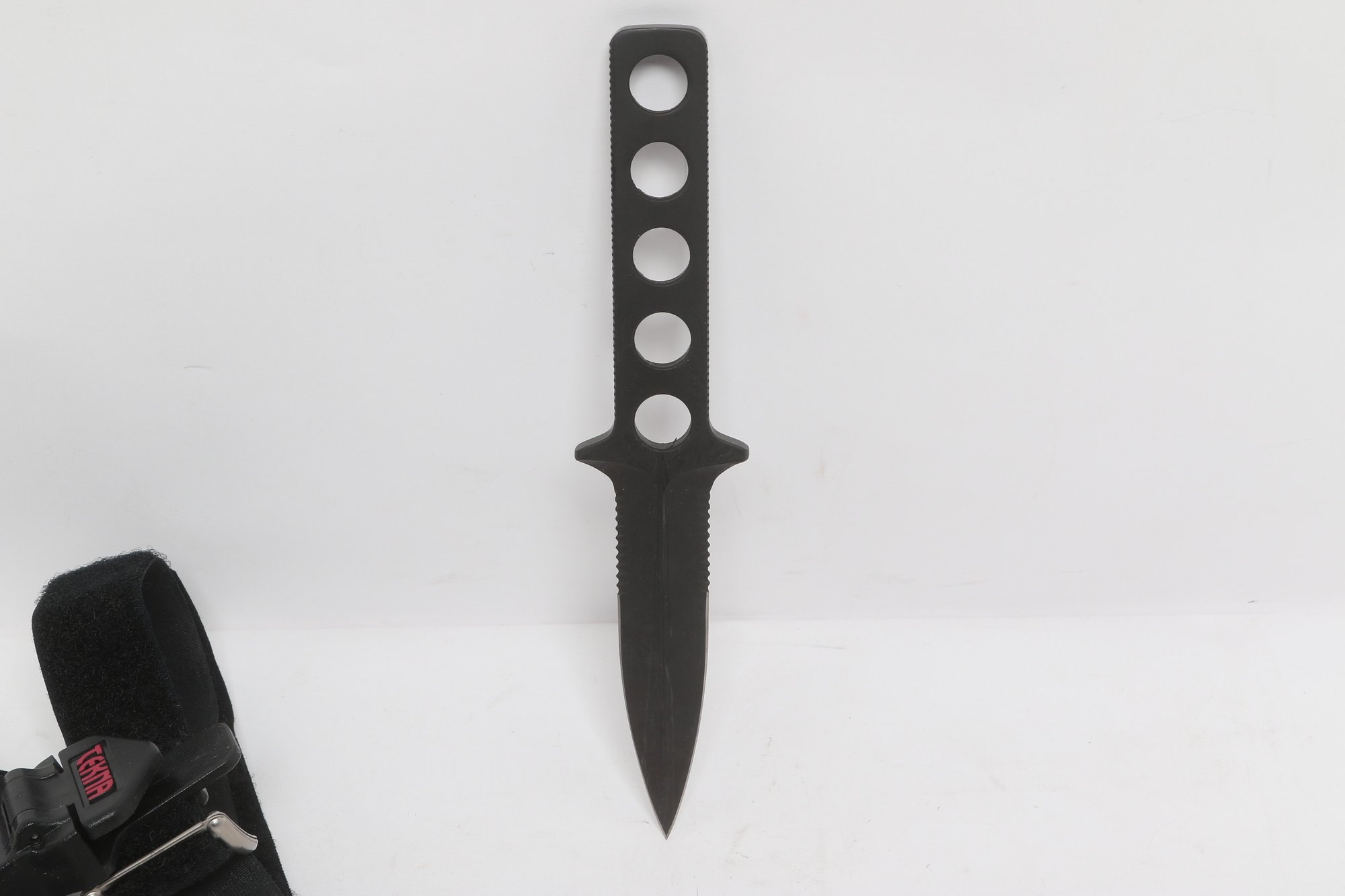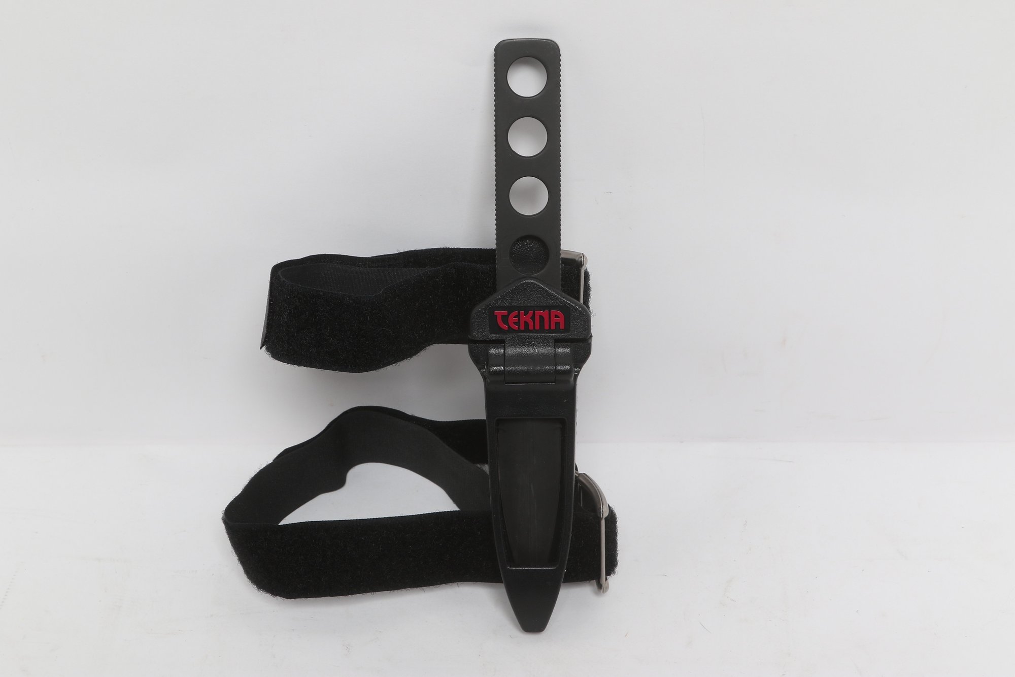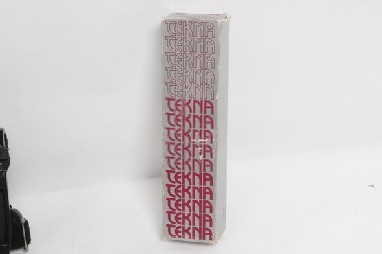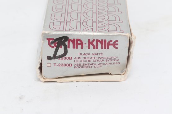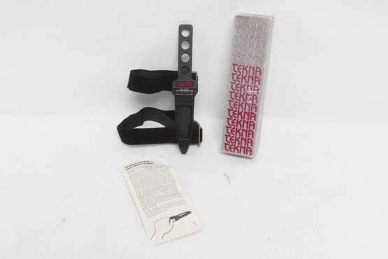 Tekna Knife model T-2300B featuring a black matte blade with skeletonized handle, includes original box, sheath, and instructions. Compact survival/boot knife with ABS sheath and strap system. Light wear; overall good condition.
