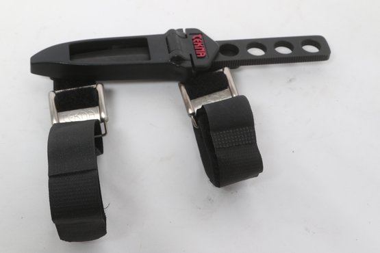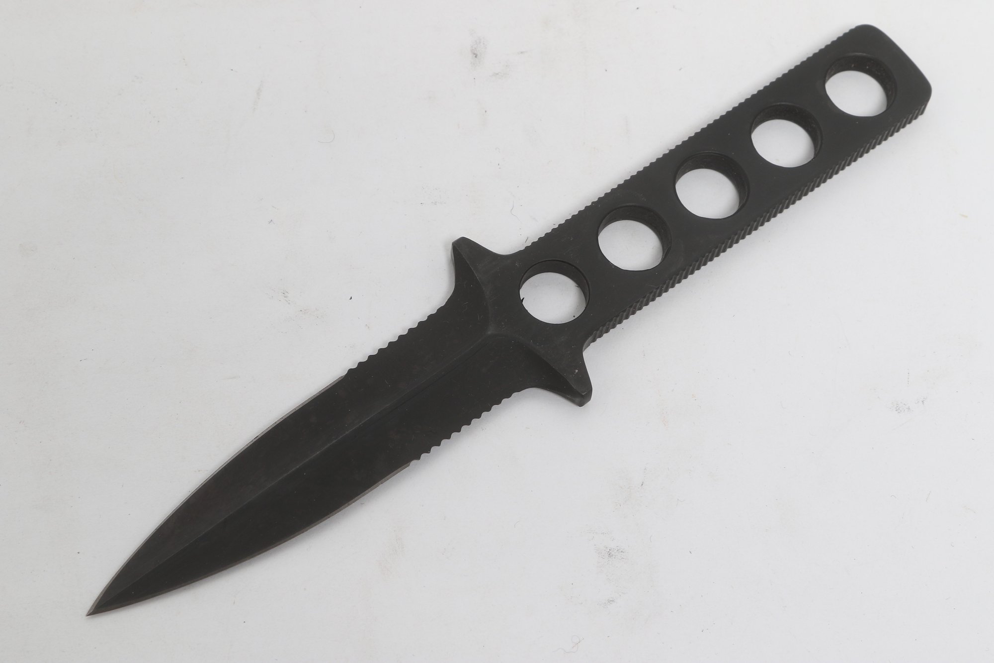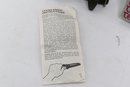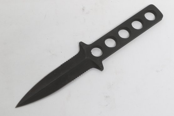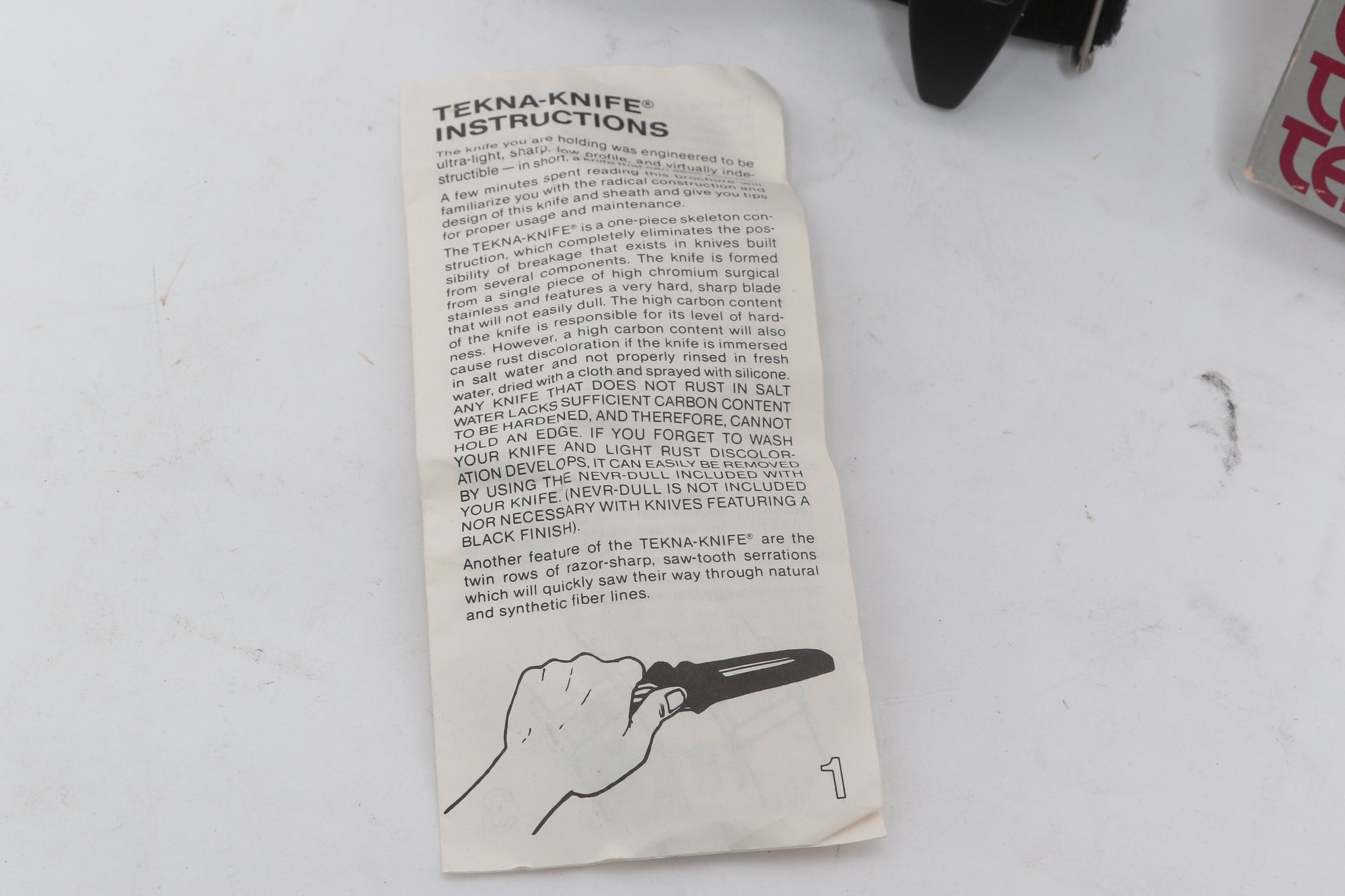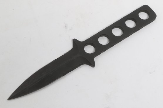 Tekna Knife model T-2300B featuring a black matte blade with skeletonized handle, includes original box, sheath, and instructions. Compact survival/boot knife with ABS sheath and strap system. Light wear; overall good condition.