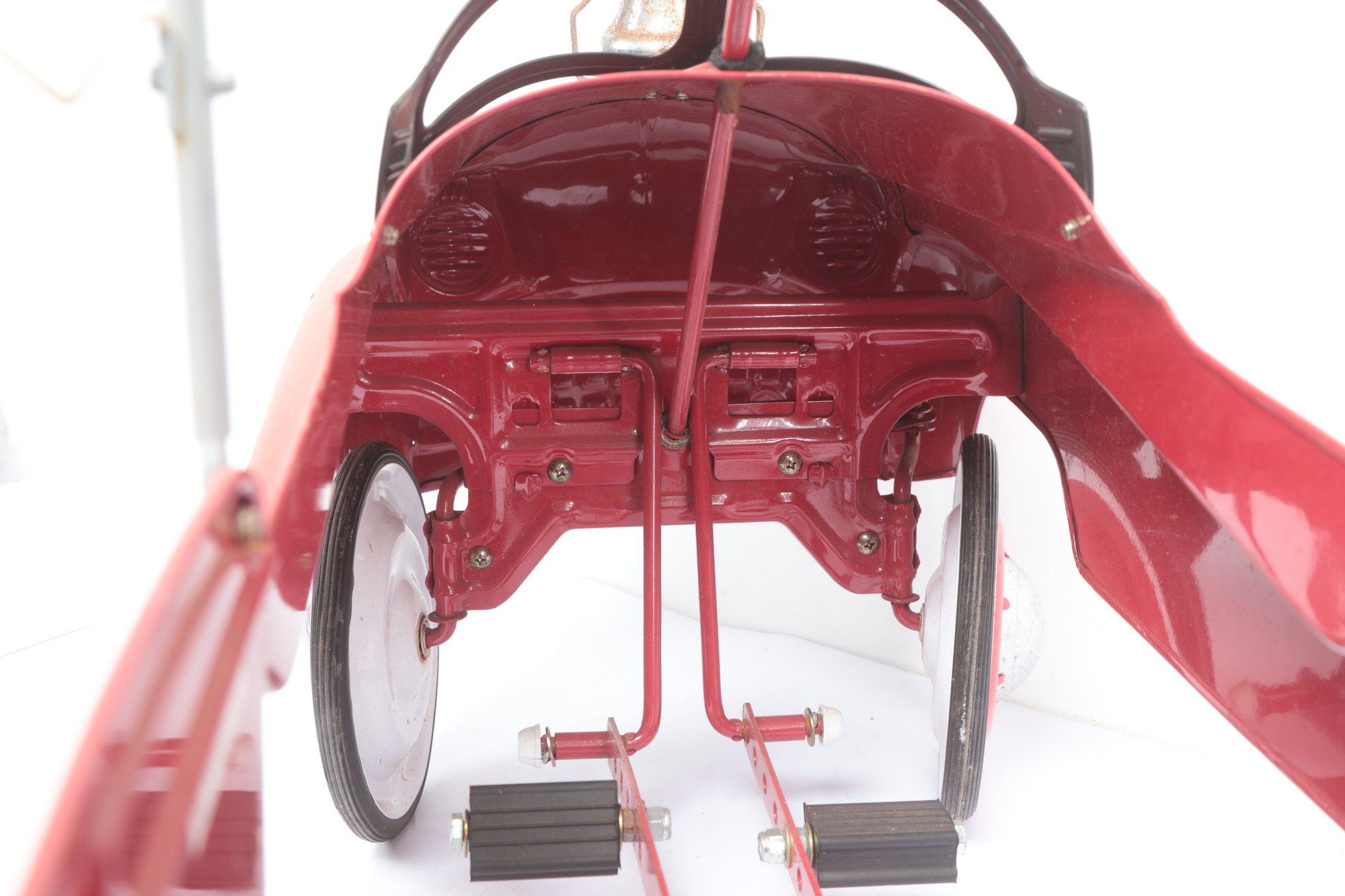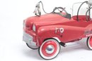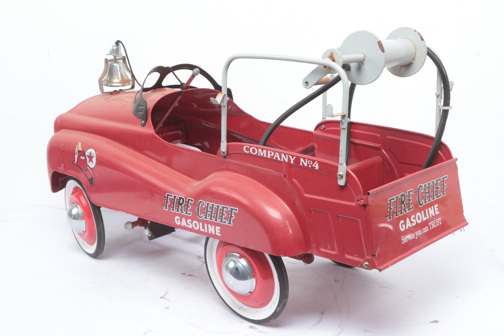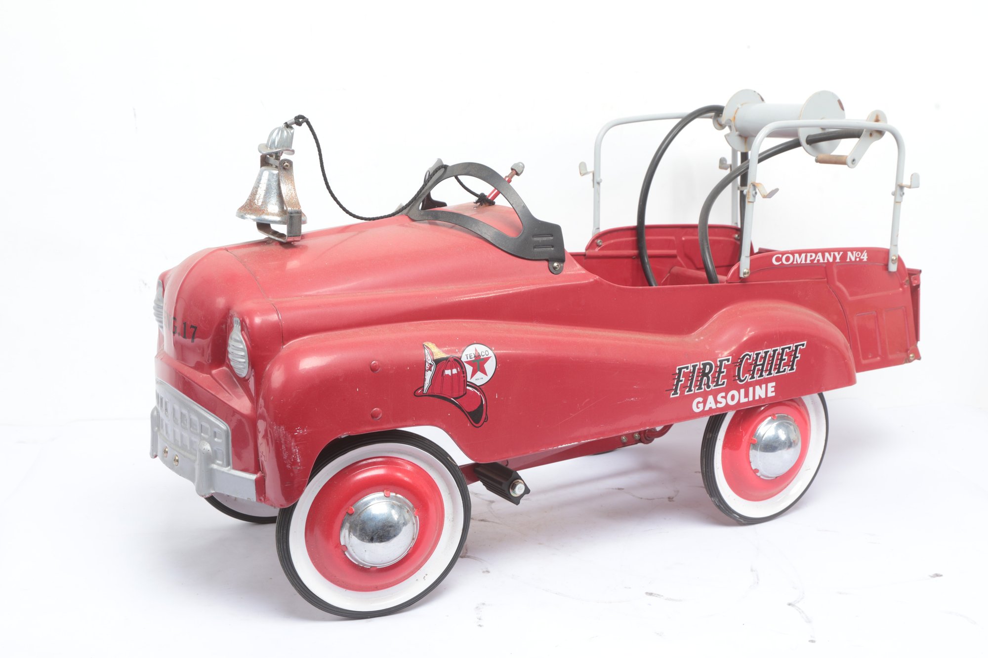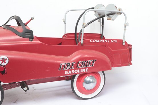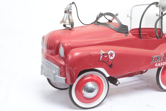 Texaco Fire Chief Fire Engine Pedal Car with wear consistent with age and use. Missing parts and has some sticker peeling, see pictures carefully for details on size and condition.