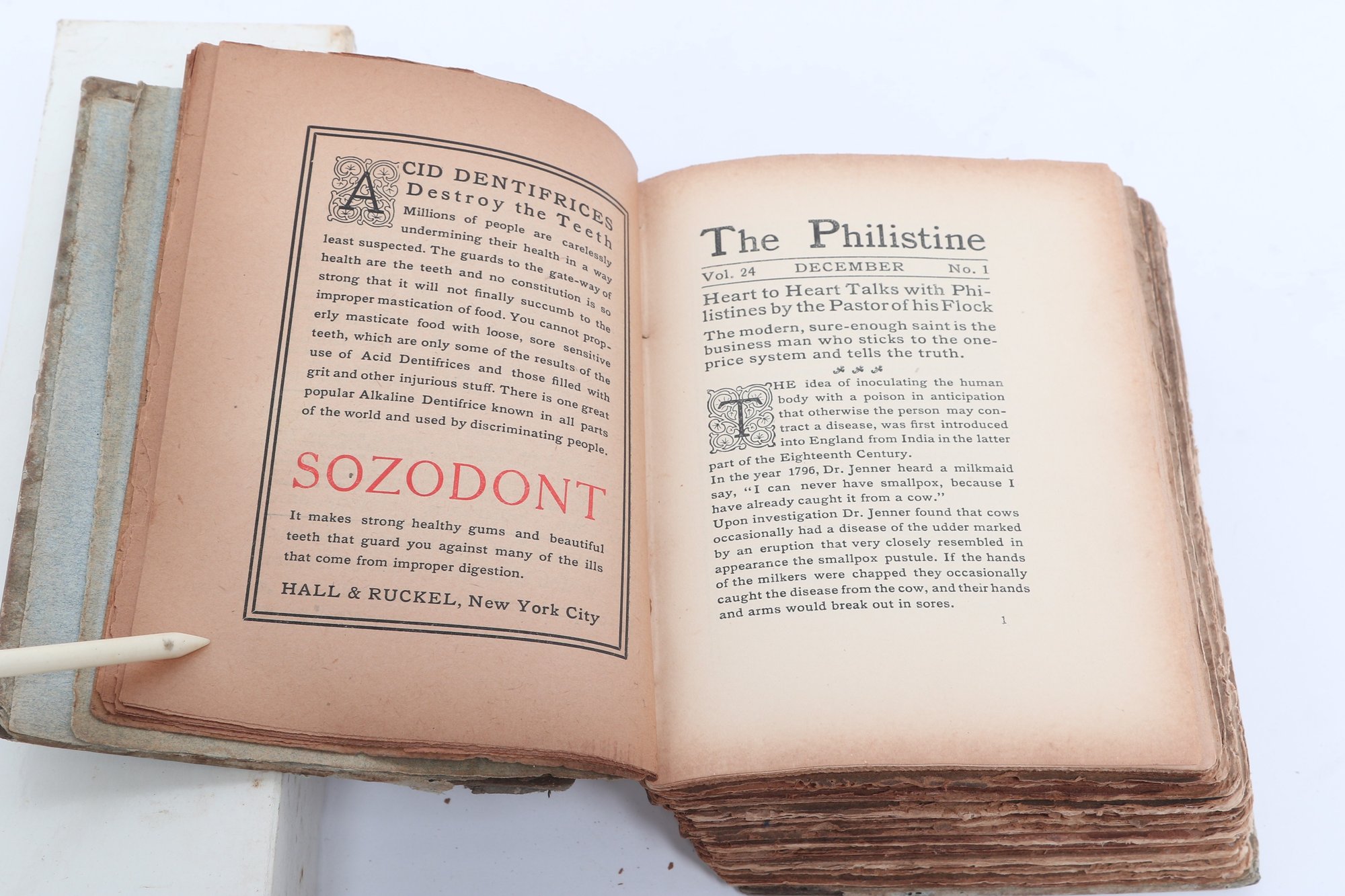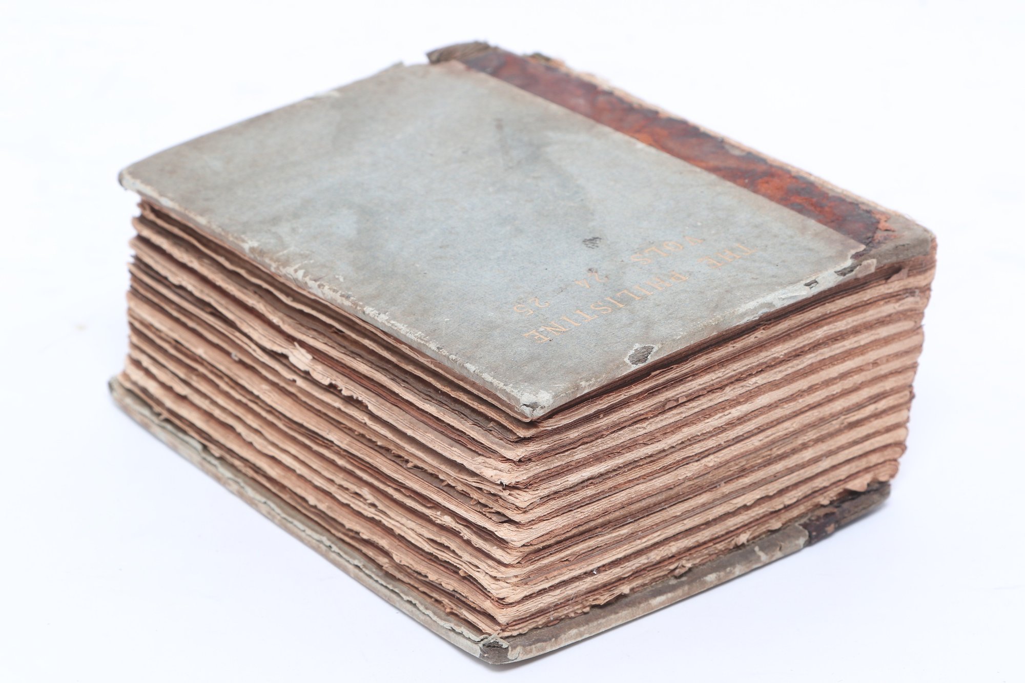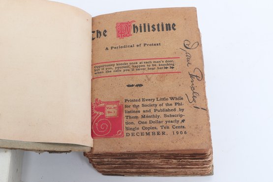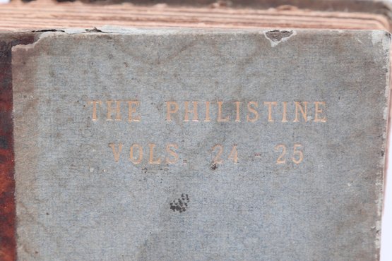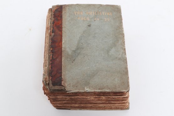 Antique copy of The Philistine, volumes 24–25, associated with Elbert Hubbard and the Roycroft movement. Hardcover shows significant age, wear, and cover damage; interior pages appear intact. A collectible piece of early 20th-century literature.