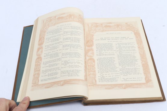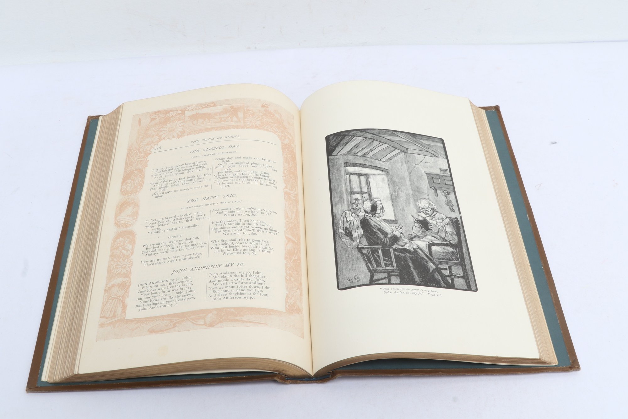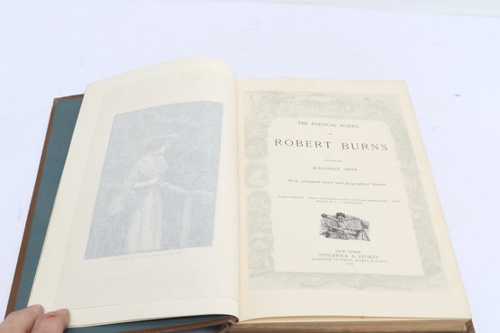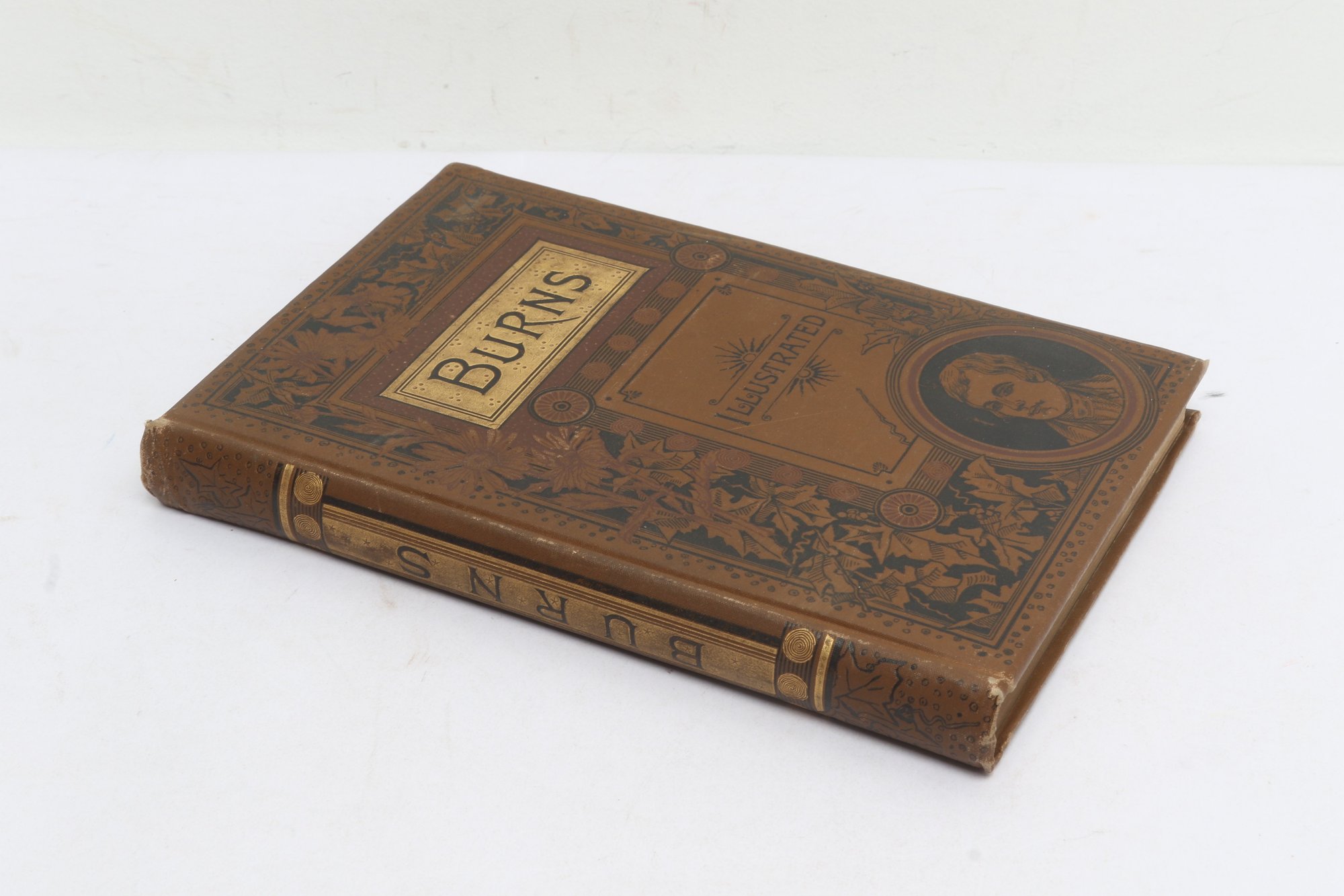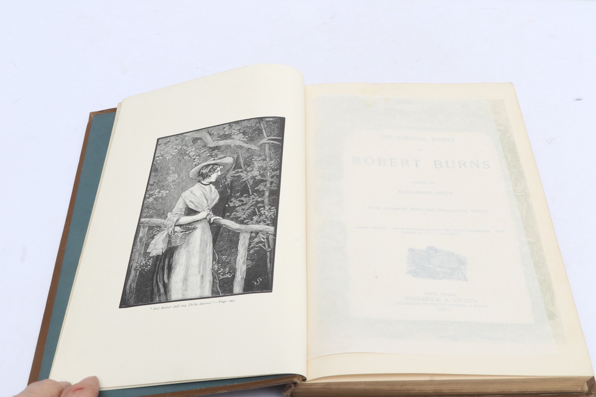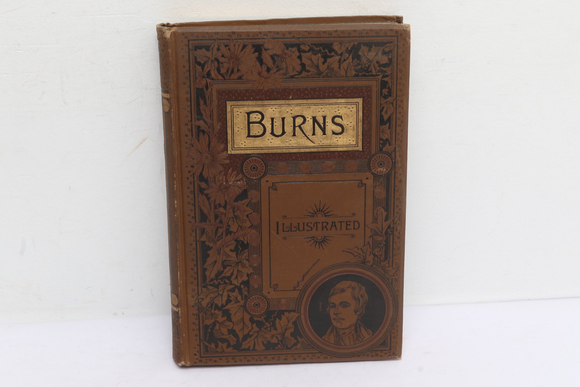 BURNS, Robert. The Poetical Works of Robert Burns. Edited by Alexander Smith. With Glossarial Index and Biographical Memoir. New York: Frederick A. Stokes, 1882. Octavo, decorative brown binding with elaborate Victorian gilt-stamped designs including Burns portrait medallion and floral motifs. Family edition fully illustrated with wood engravings, successor to White, Stokes & Allen. Binding shows wear to extremities and rubbing, interior clean with tissue-guarded frontispiece.