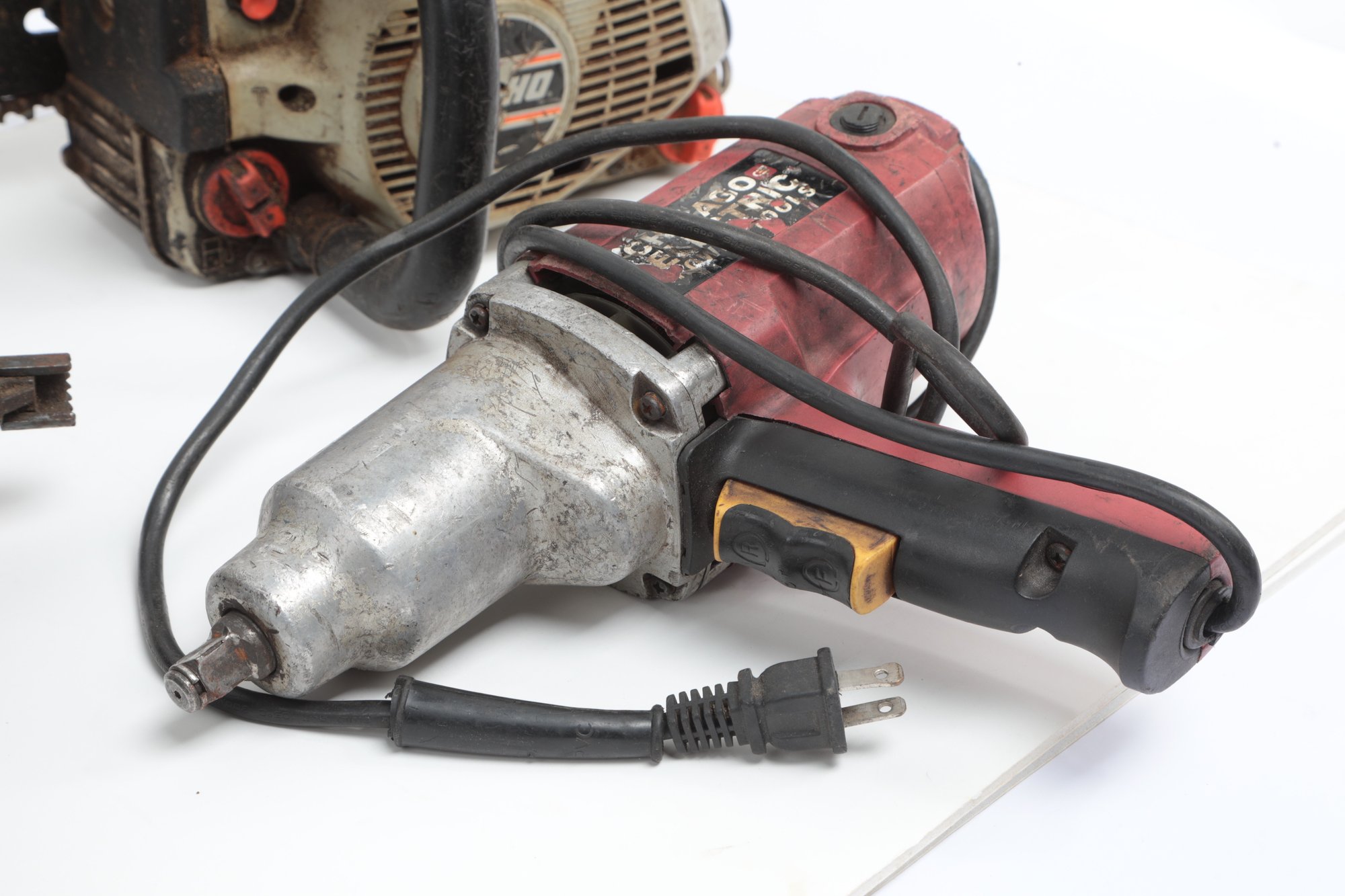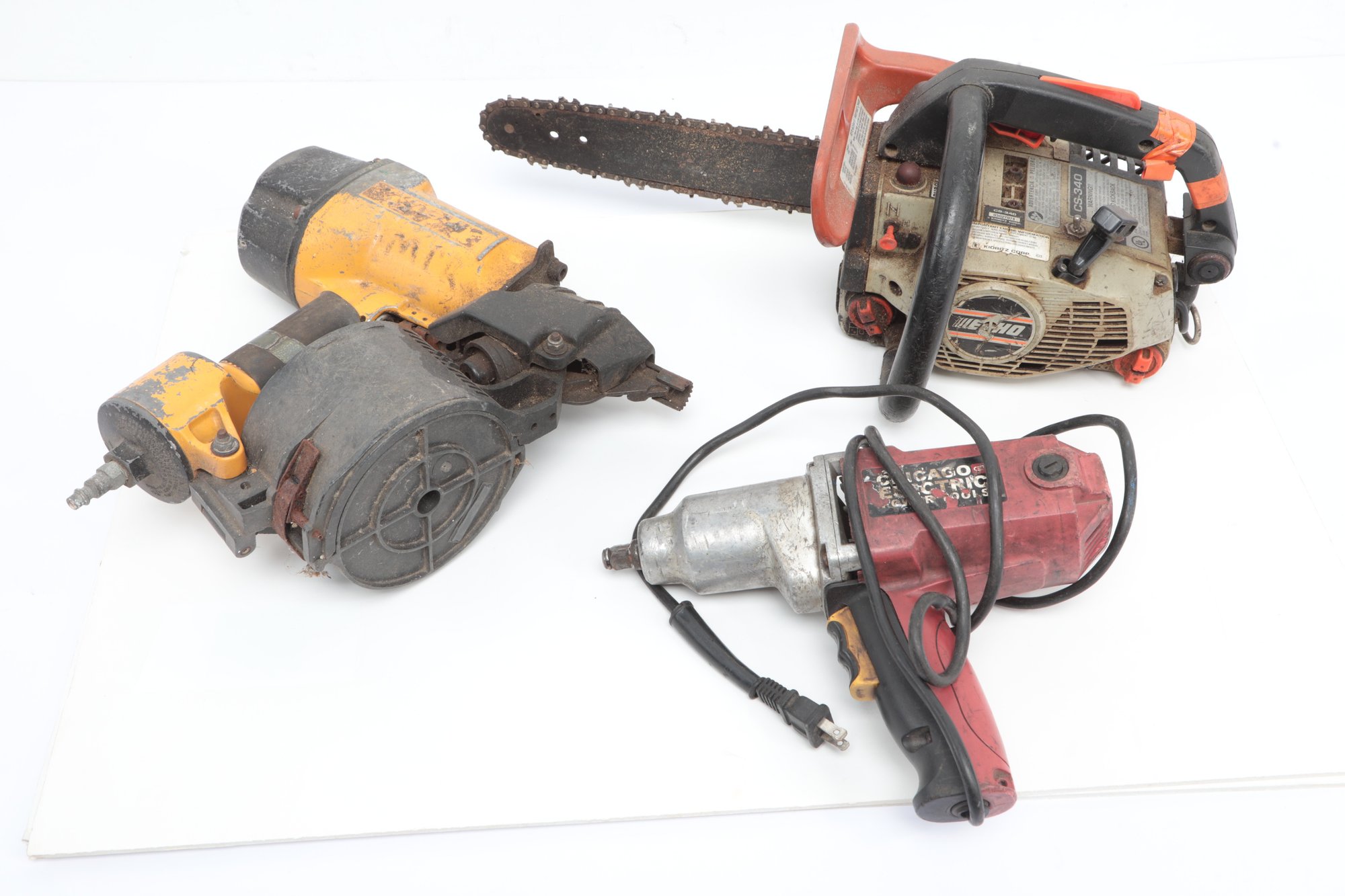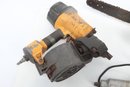 Three Assorted Power Tools Including Chainsaw. Tools are untested sold as is. Chainsaw needs service/repair. See pictures carefully for details on contents included with lot and condition.