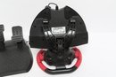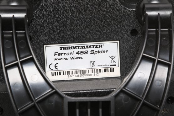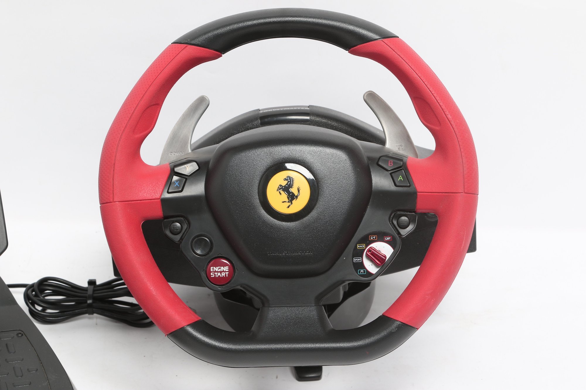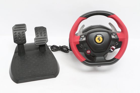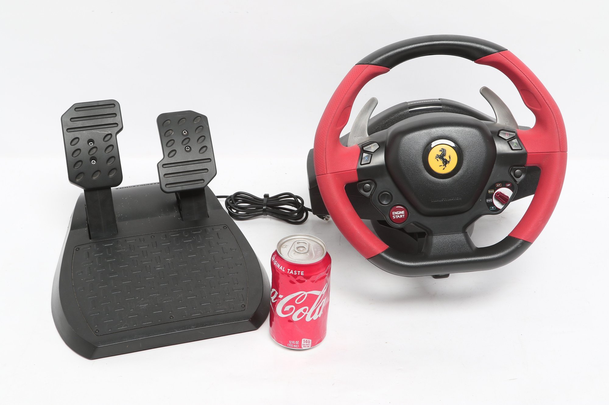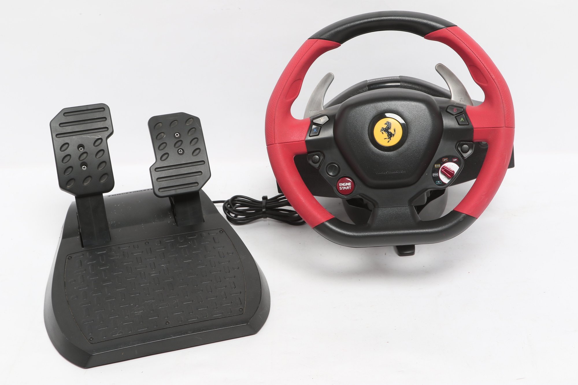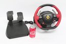 Thrustmaster Ferrari 458 Spider racing wheel with matching pedal set, designed for immersive driving gameplay. Features Ferrari branding, ergonomic grip, and responsive controls. Includes wired connection; shows light use wear. Untested, sold as-is.