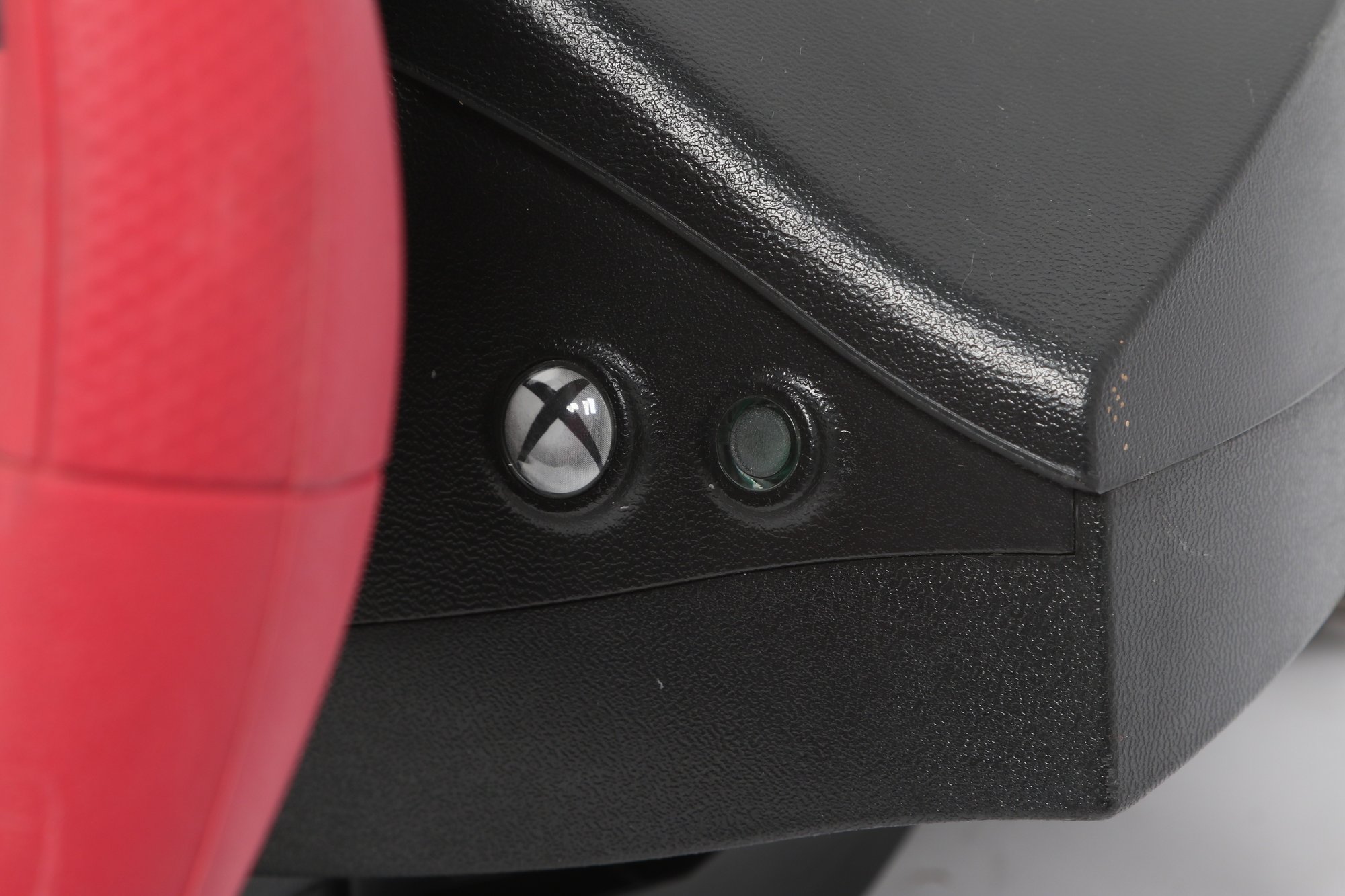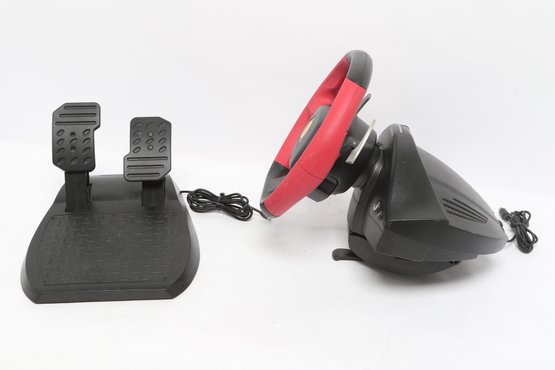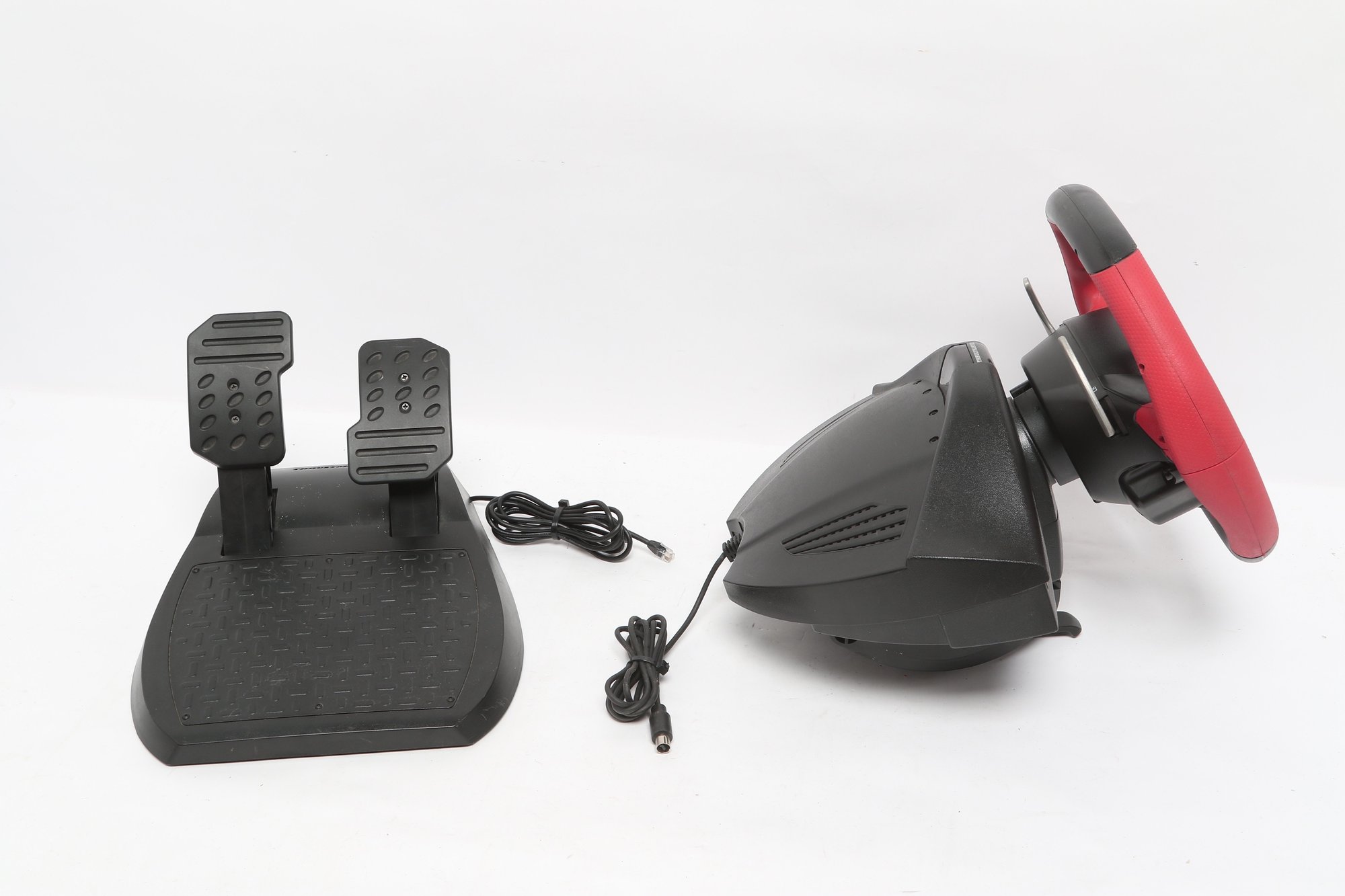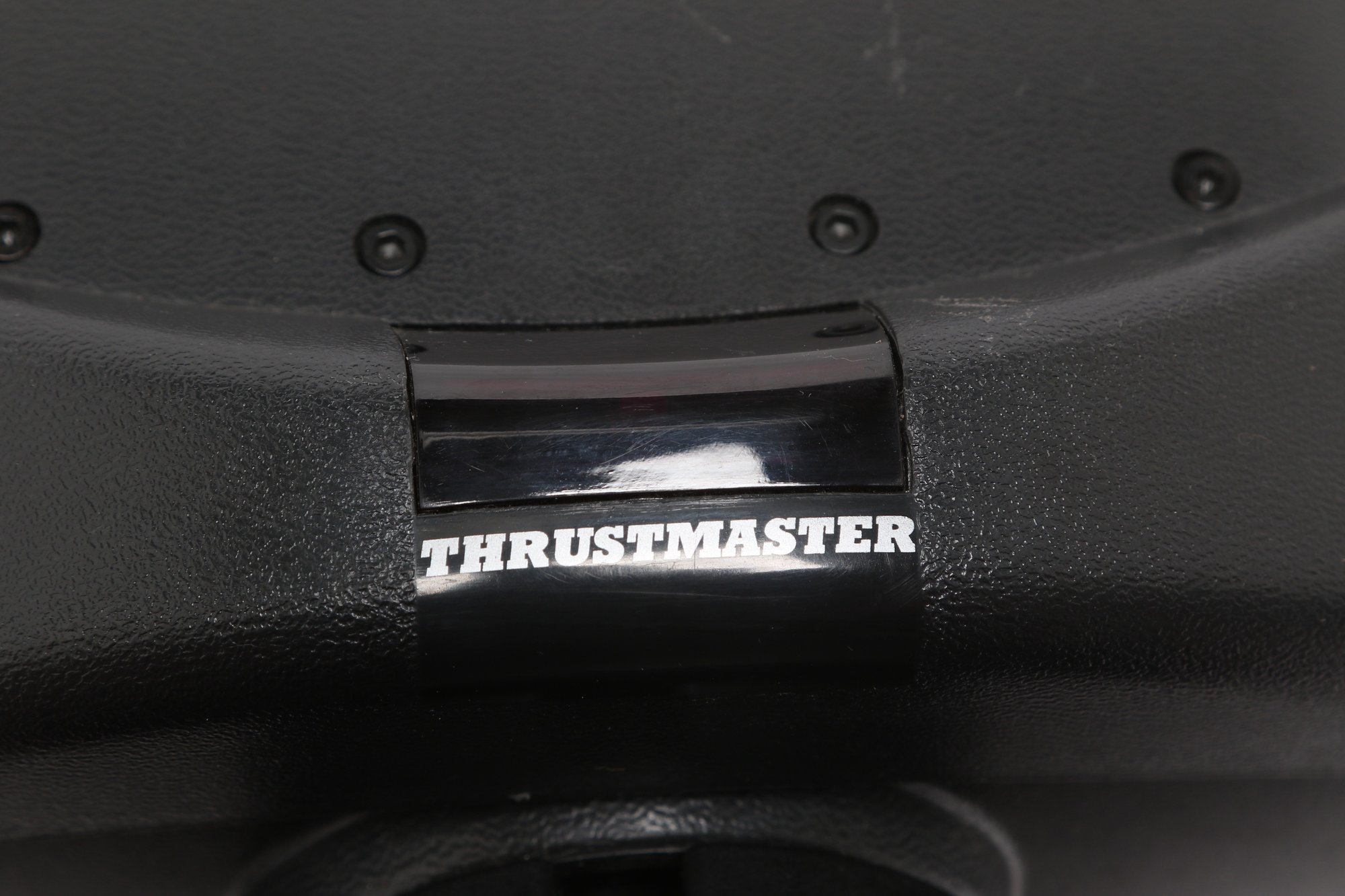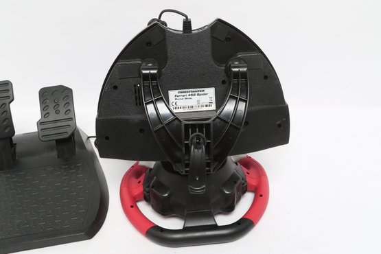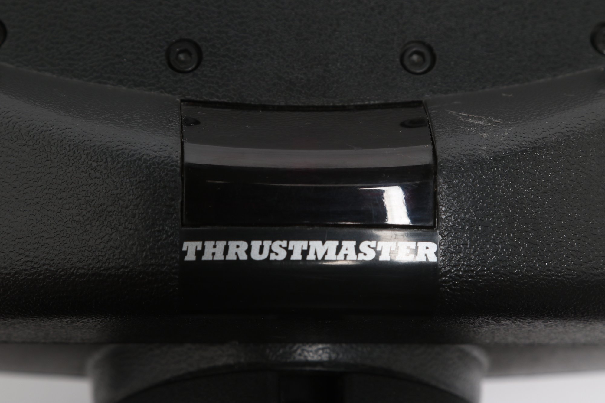 Thrustmaster Ferrari 458 Spider racing wheel with matching pedal set, designed for immersive driving gameplay. Features Ferrari branding, ergonomic grip, and responsive controls. Includes wired connection; shows light use wear. Untested, sold as-is.