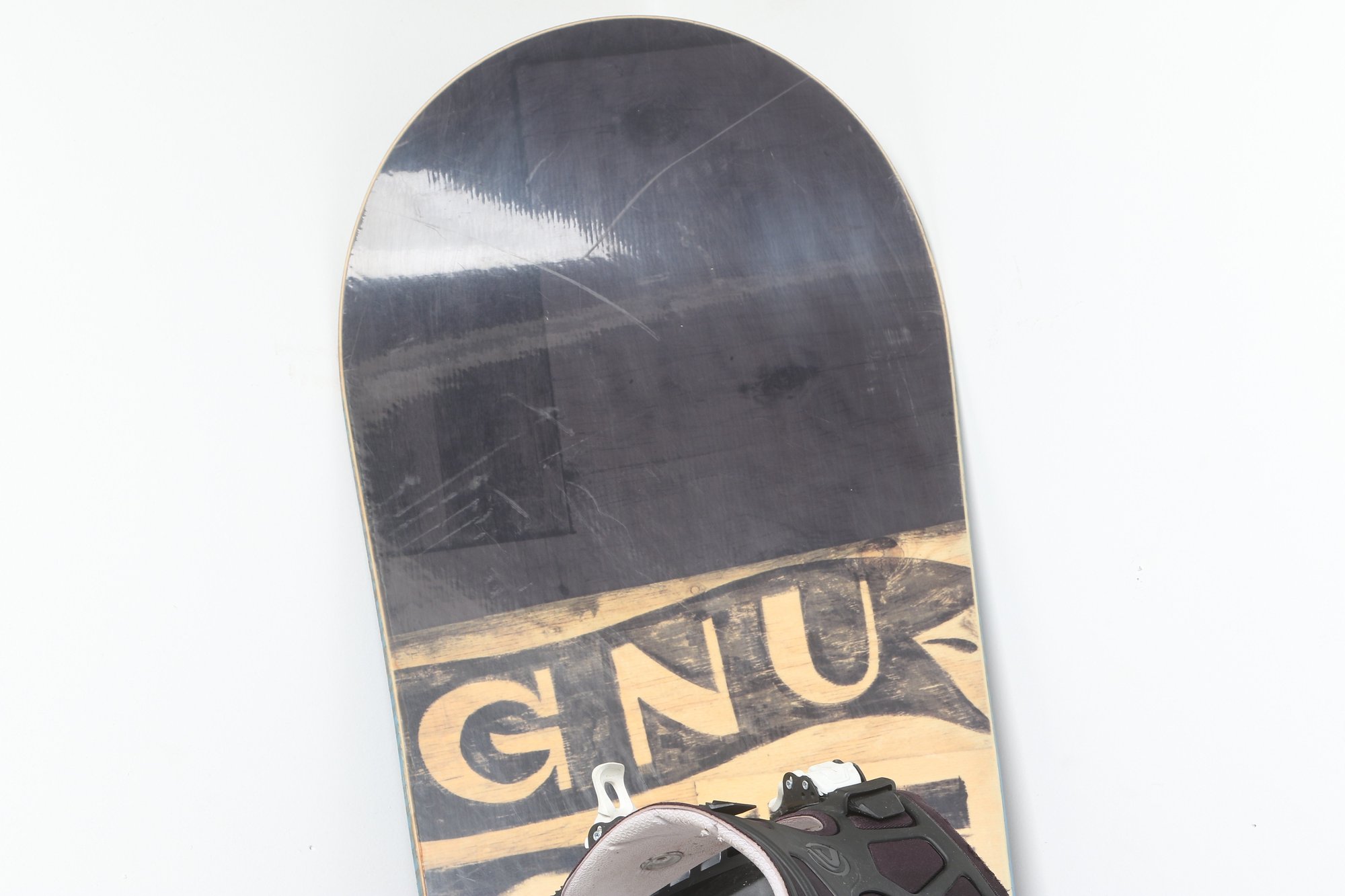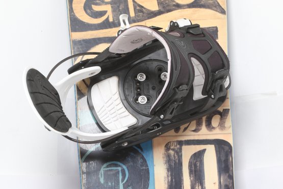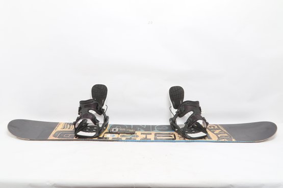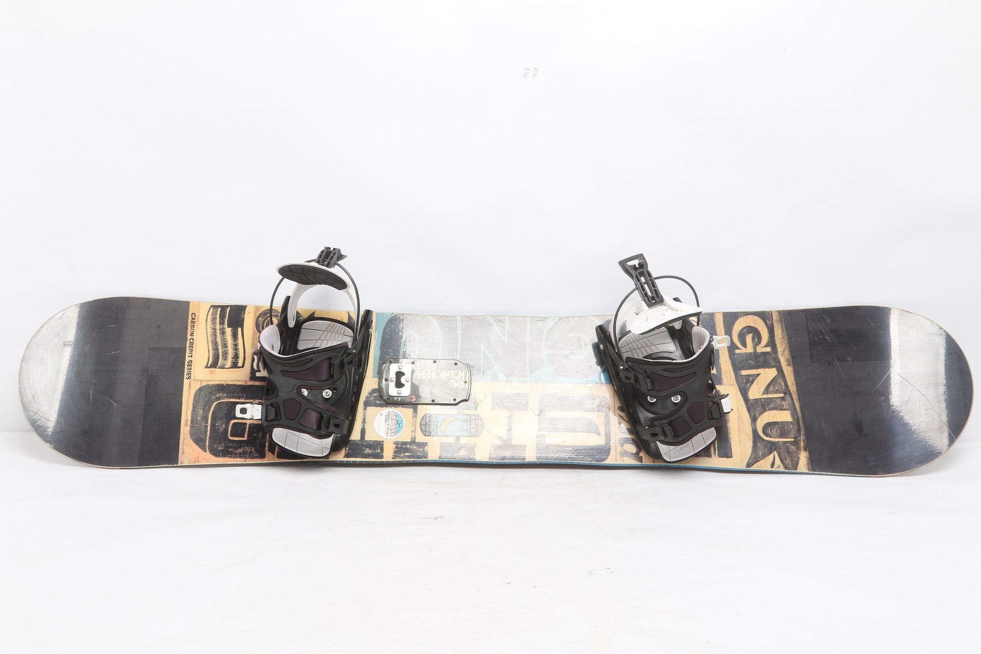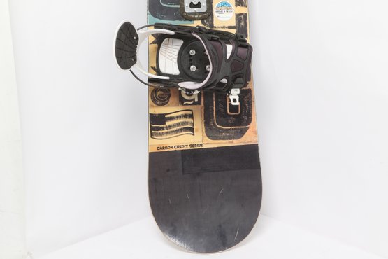 GNU Carbon Credit Series snowboard equipped with bindings, featuring a versatile all-mountain design. Shows moderate use with surface wear and scuffing consistent with normal riding. A solid setup for beginners to intermediate riders looking for a reliable board.