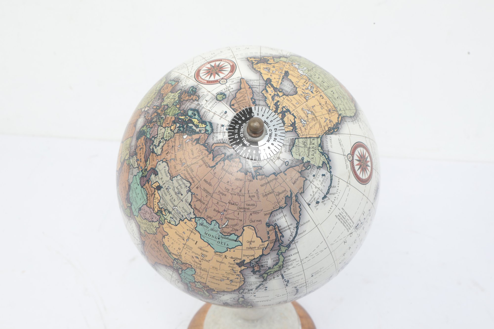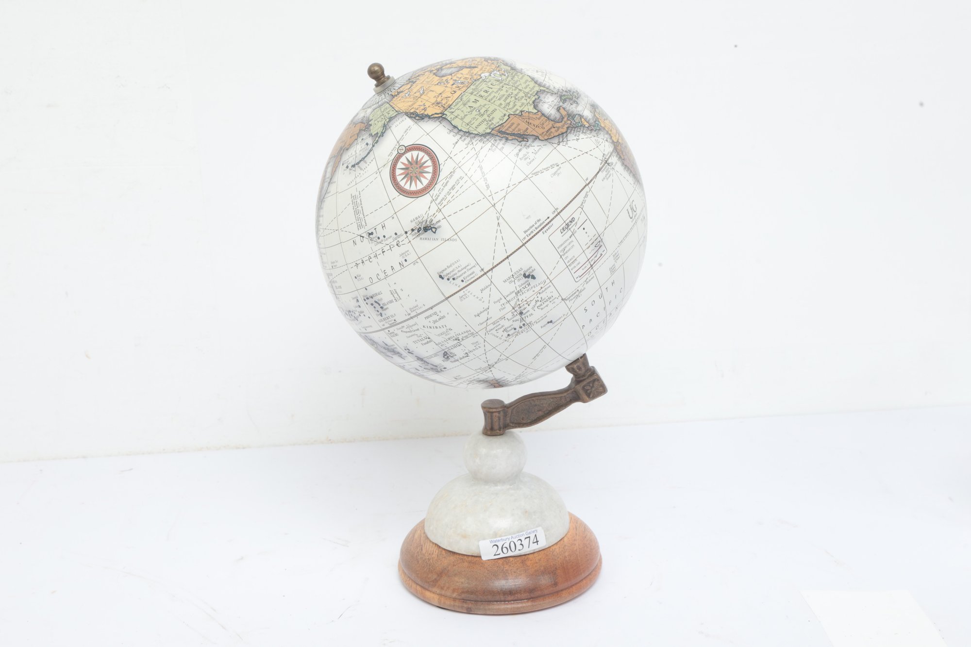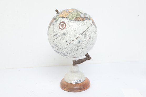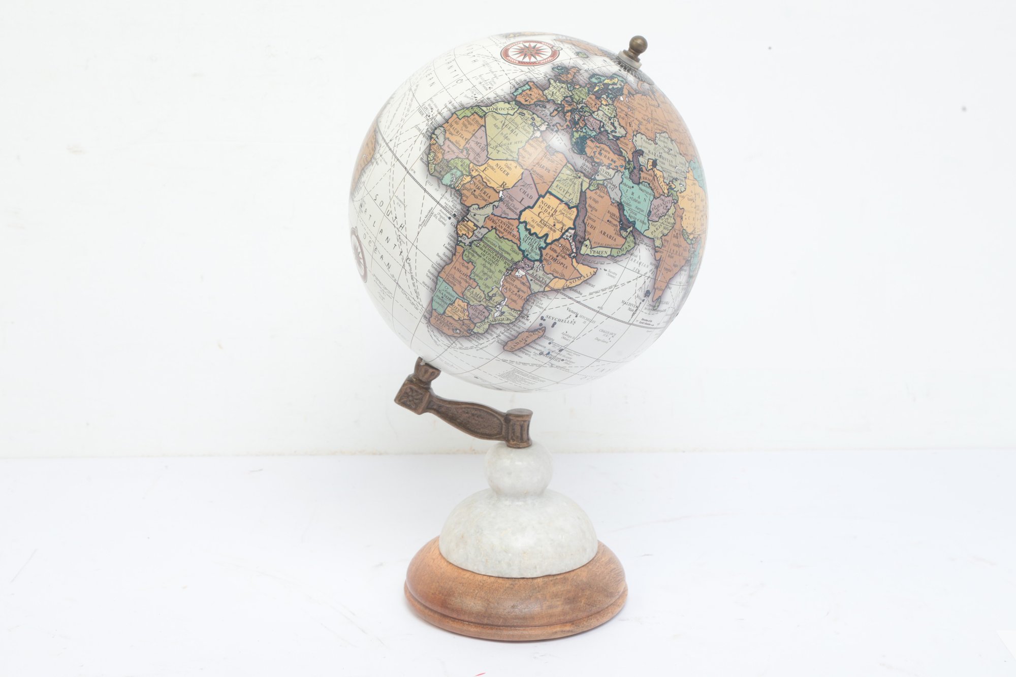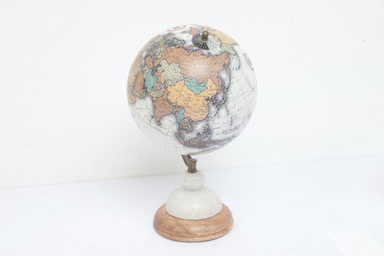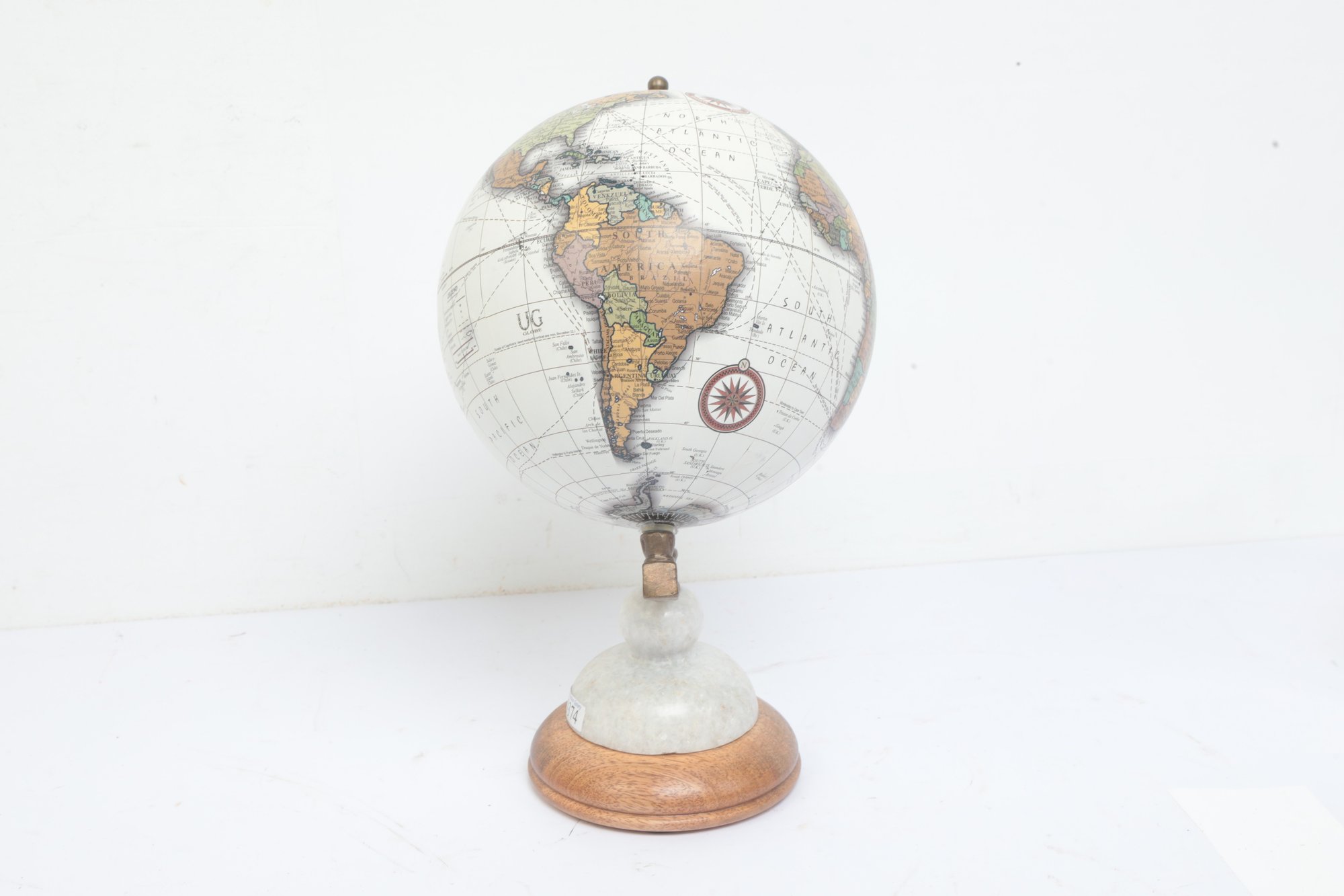 UG World Globe W/ Marble Wood Base. Measures approximately 13.5" tall. See pictures carefully for details on size and condition.