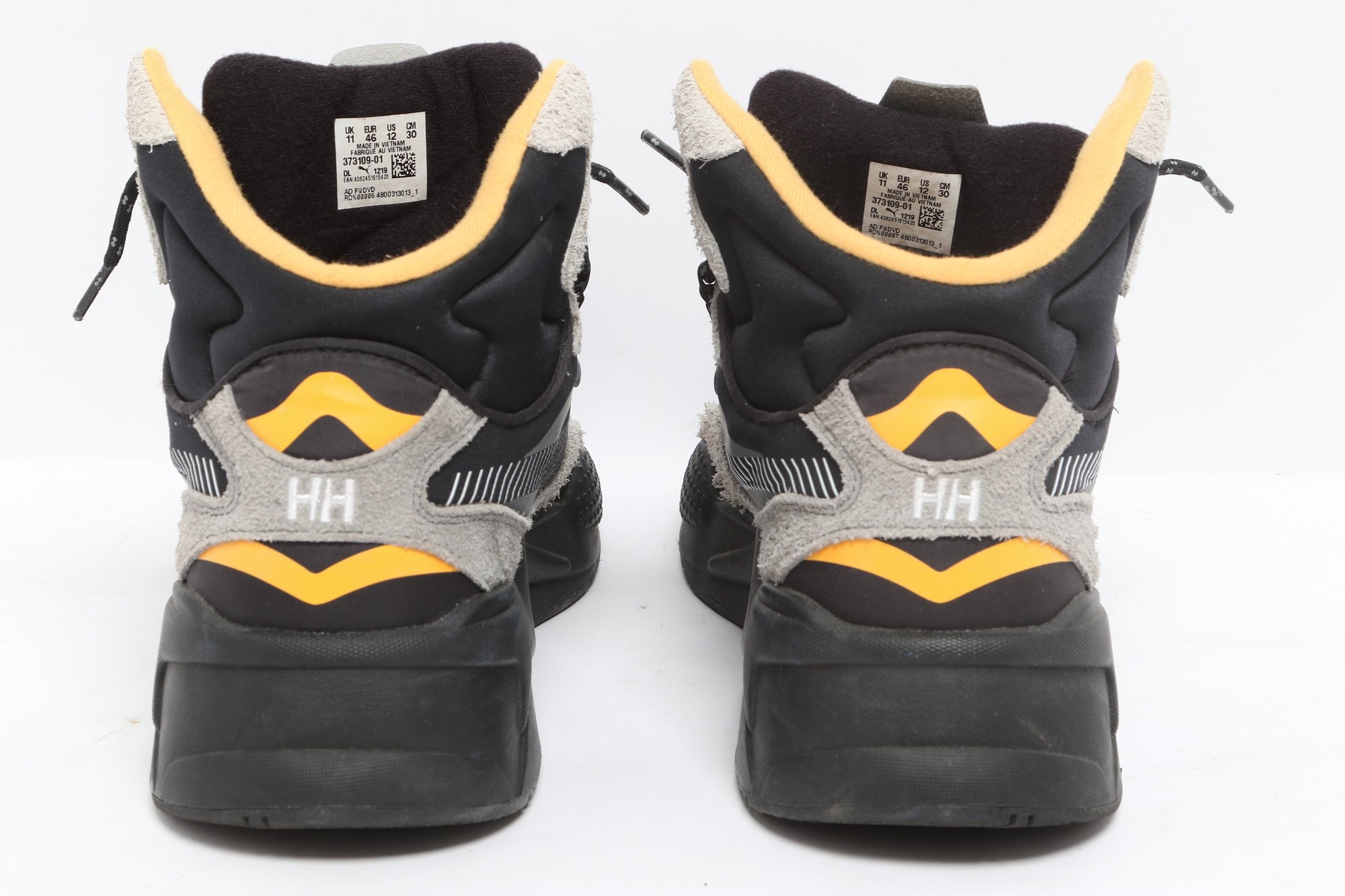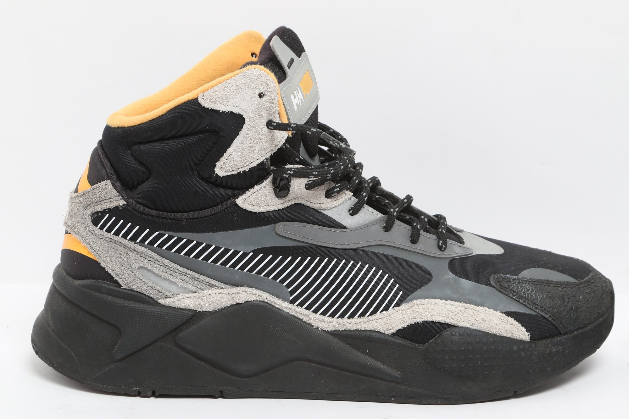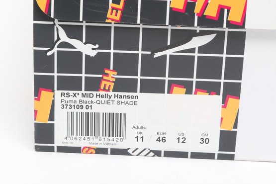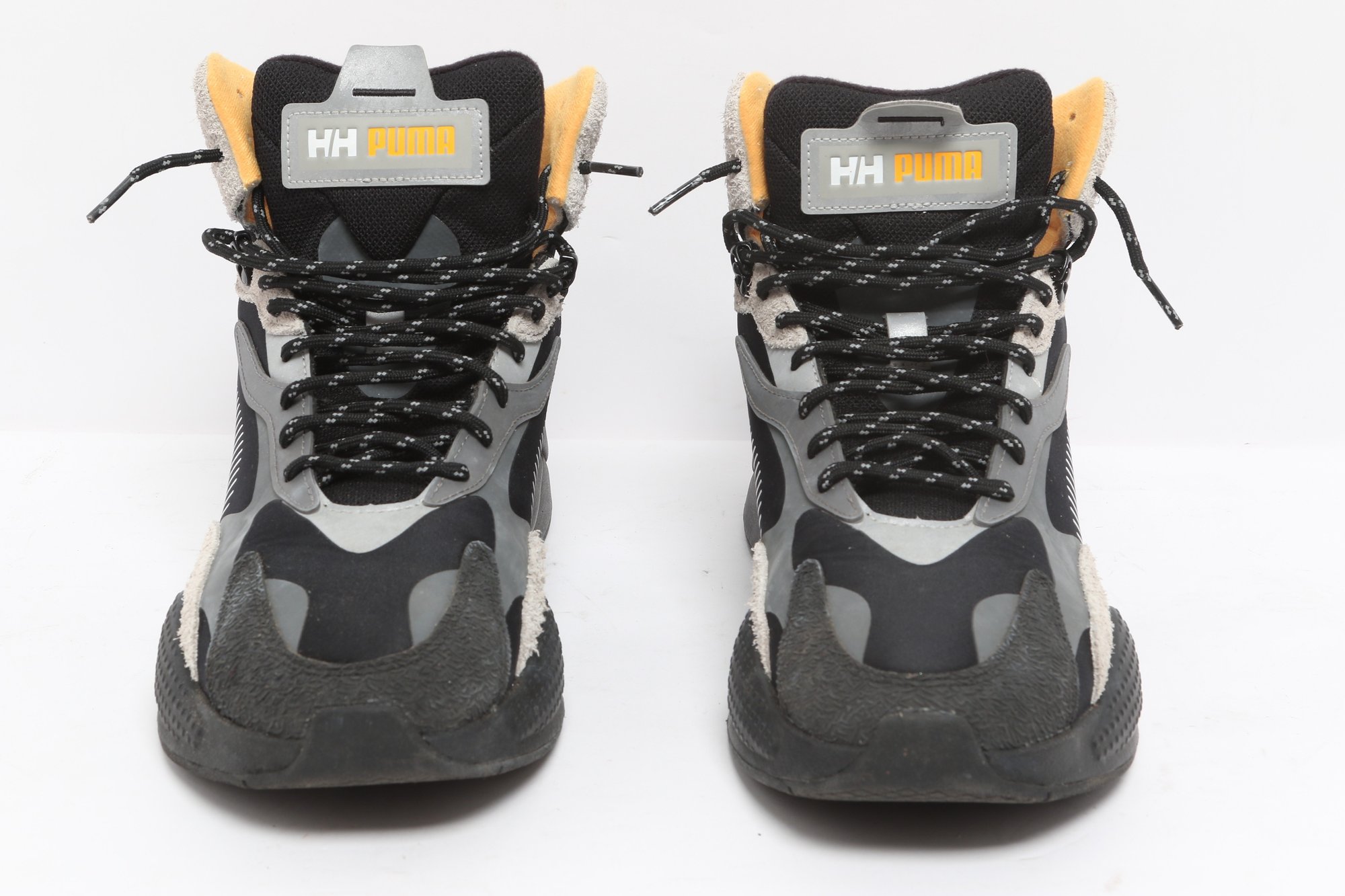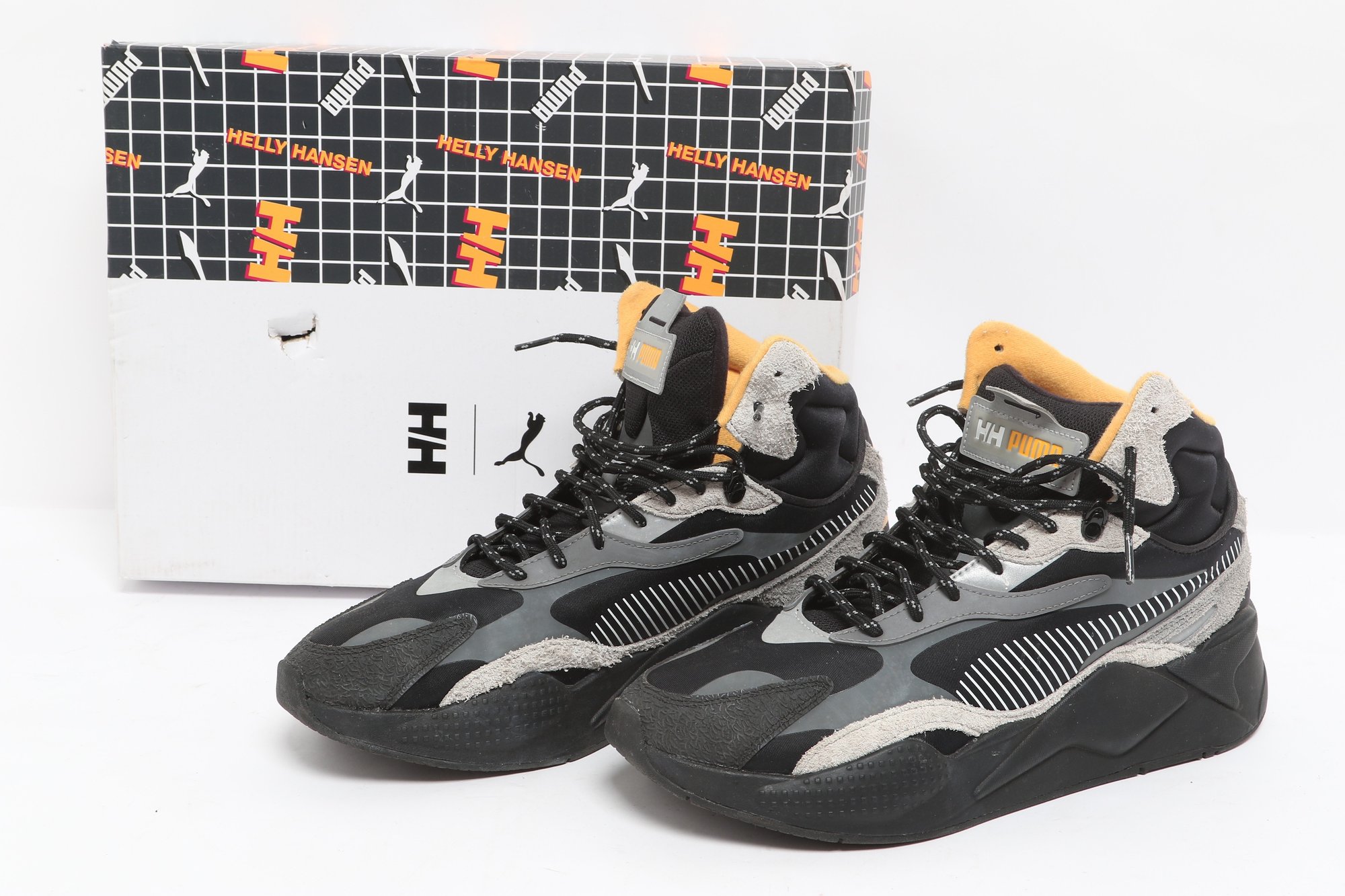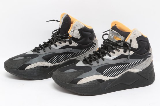 Puma RS-X Mid Helly Hansen collaboration sneakers in men’s size 12, featuring a bold black, gray, and orange design. Includes original box; pre-owned with light wear, ideal for casual or athletic style.