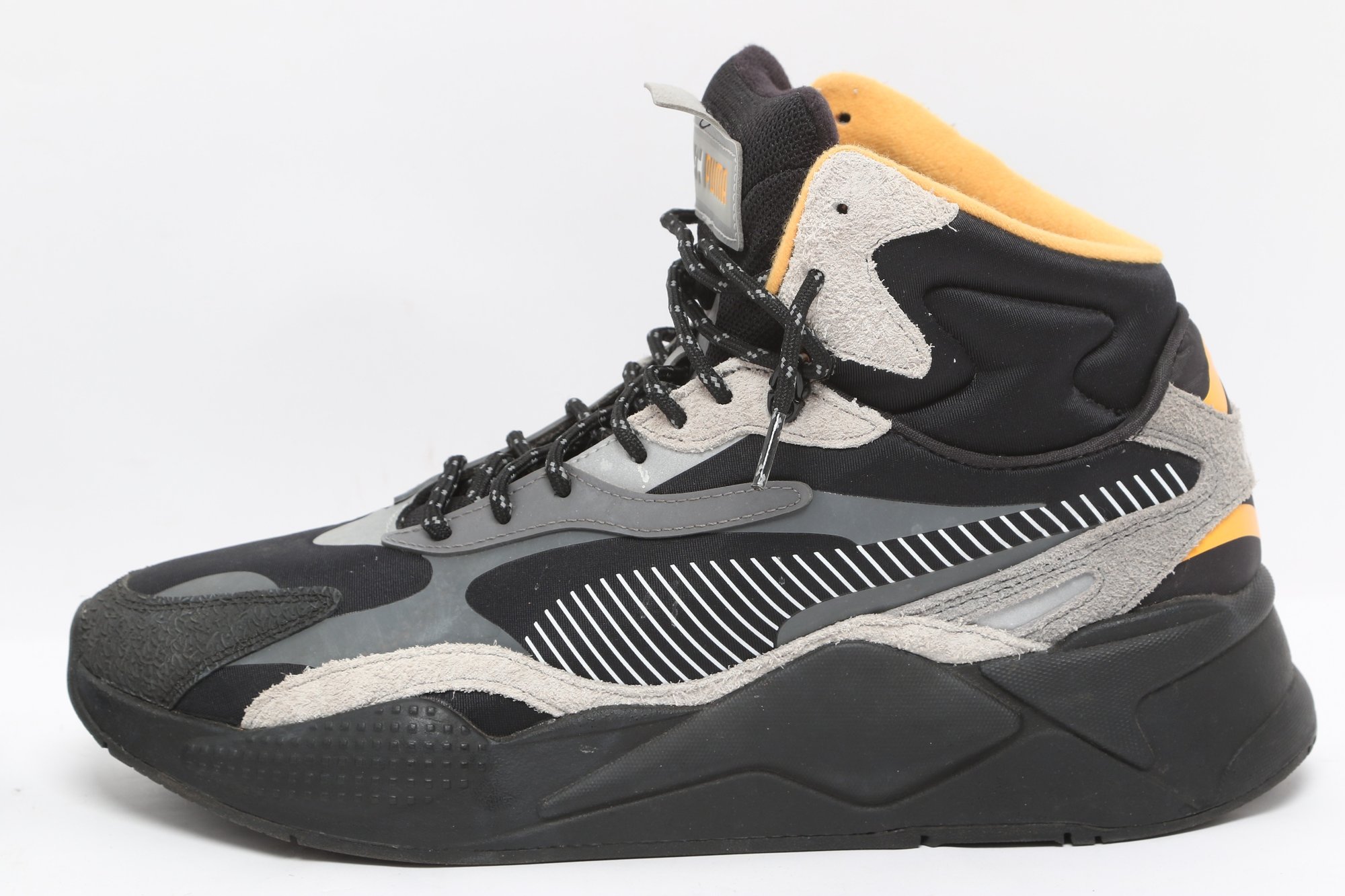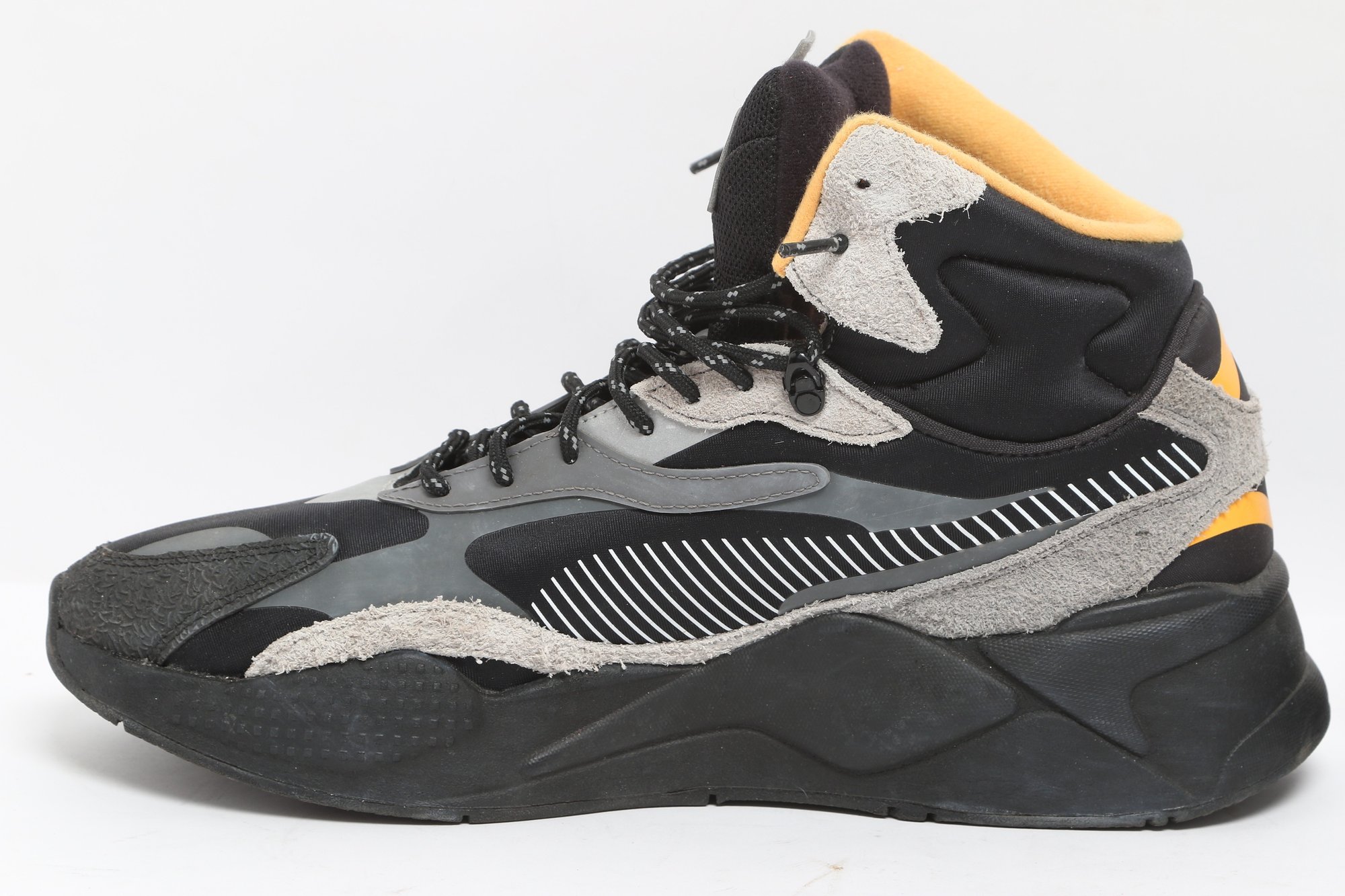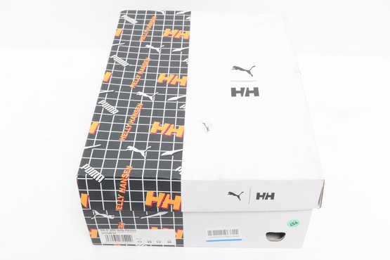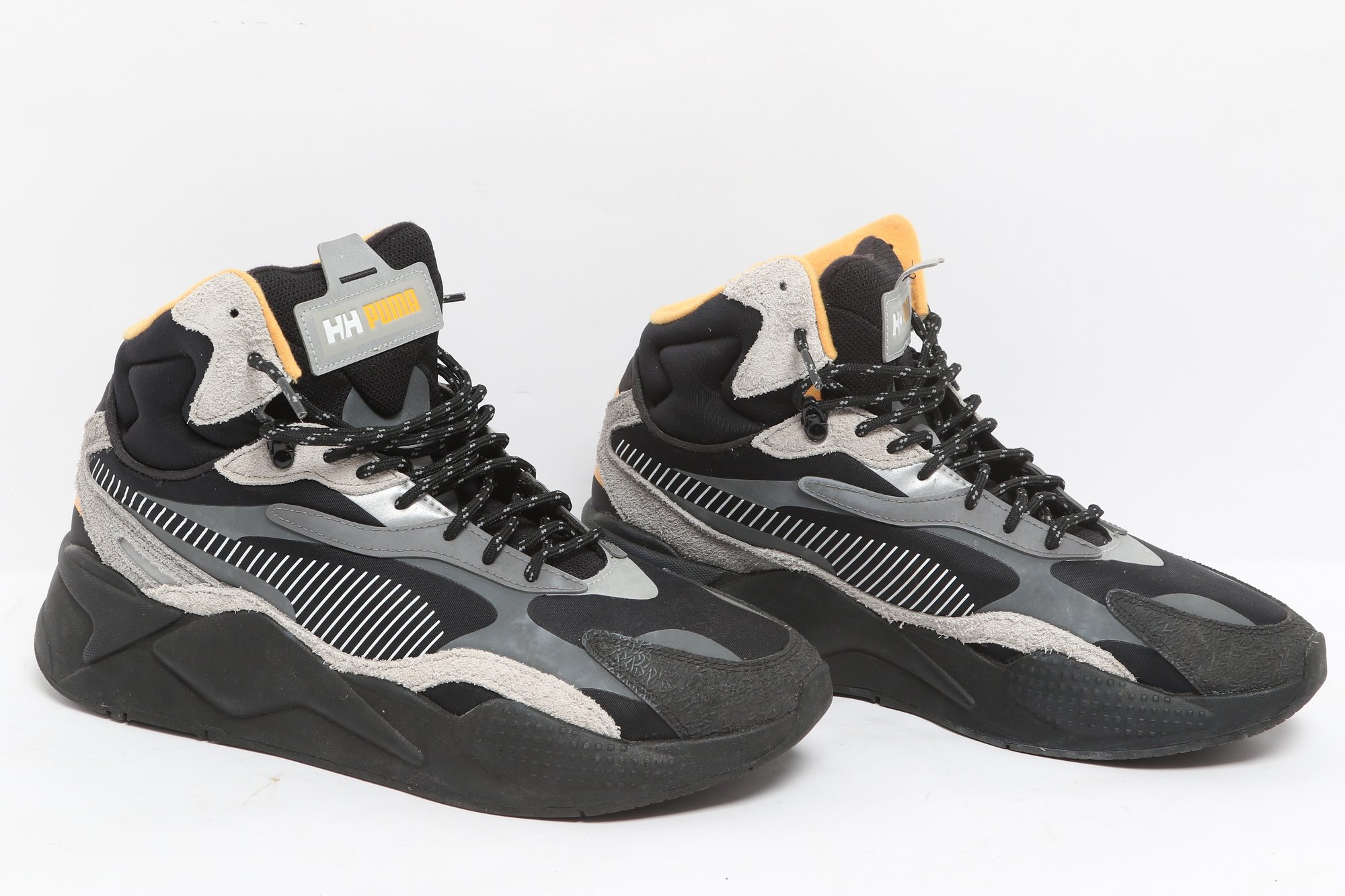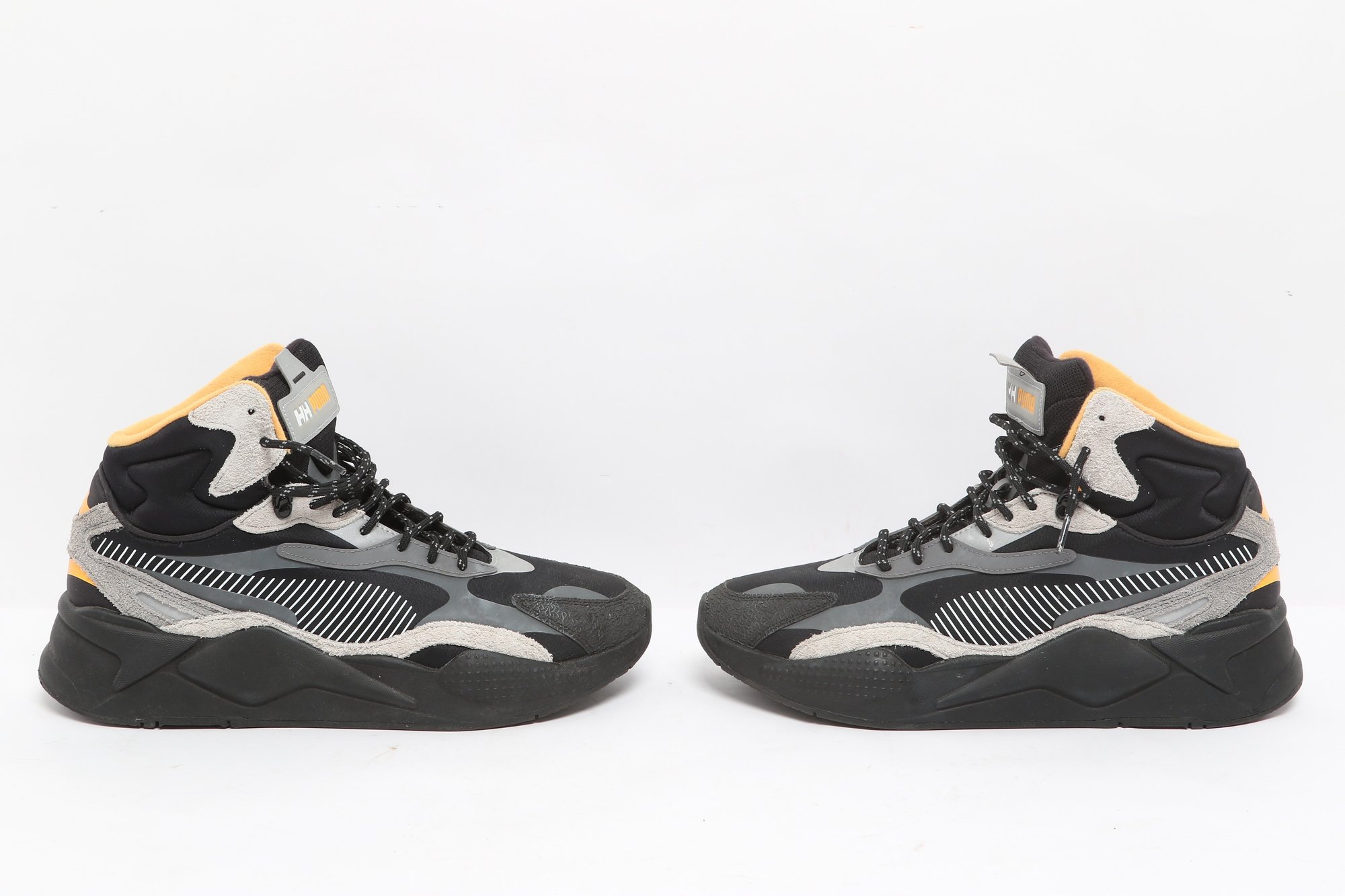 Puma RS-X Mid Helly Hansen collaboration sneakers in men’s size 12, featuring a bold black, gray, and orange design. Includes original box; pre-owned with light wear, ideal for casual or athletic style.