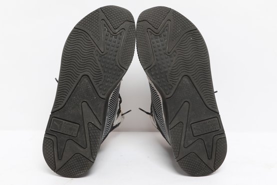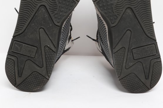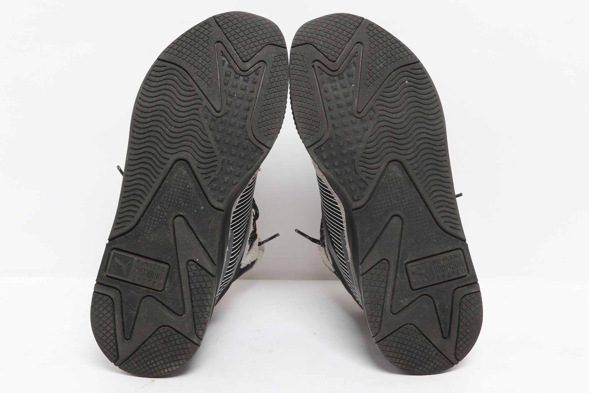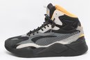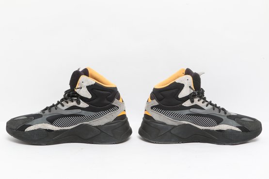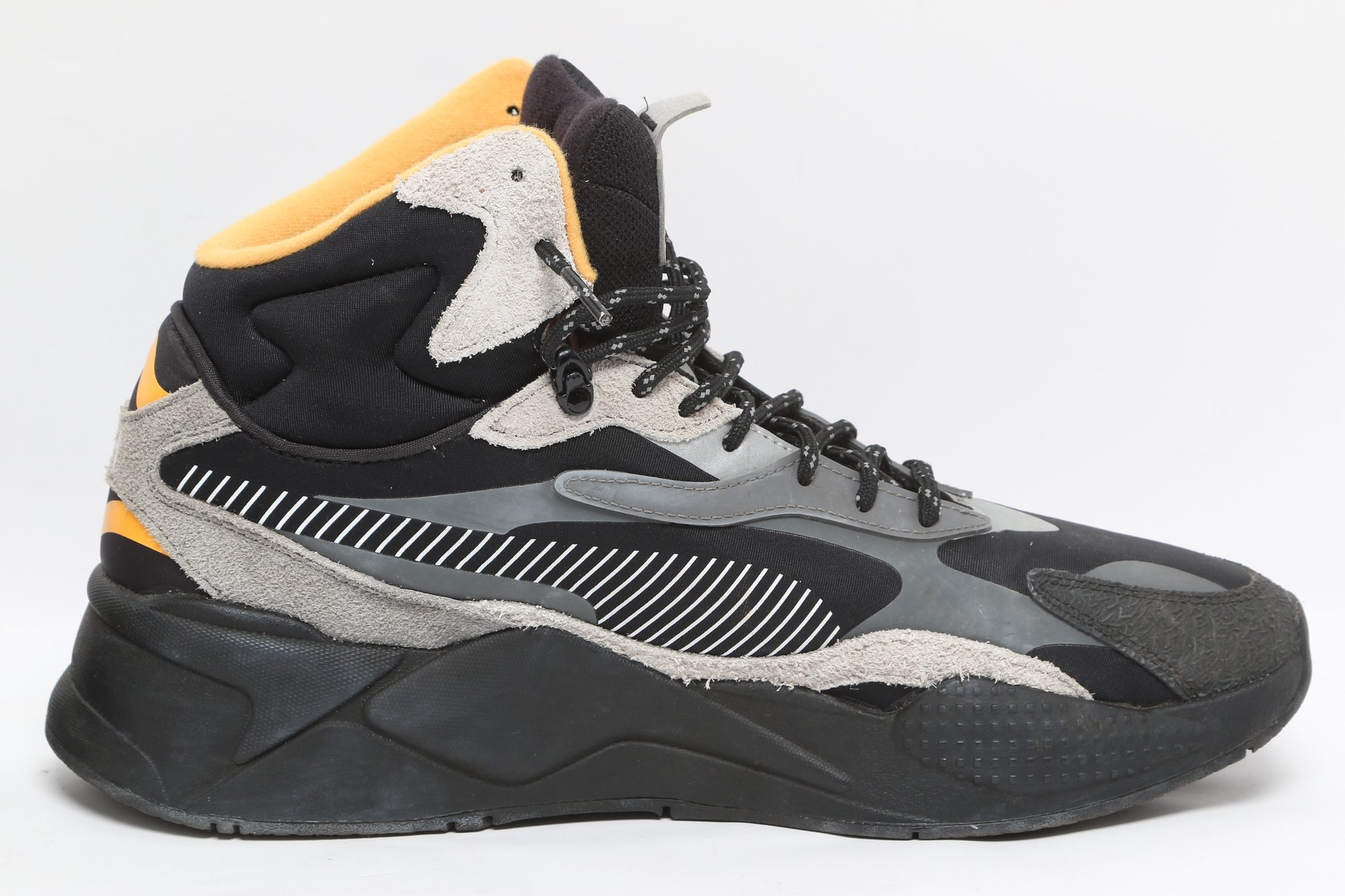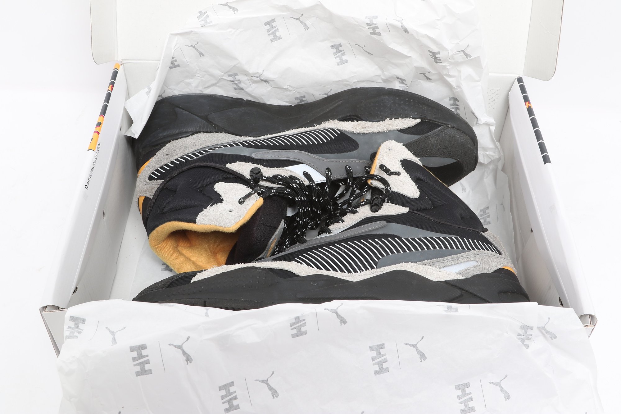 Puma RS-X Mid Helly Hansen collaboration sneakers in men’s size 12, featuring a bold black, gray, and orange design. Includes original box; pre-owned with light wear, ideal for casual or athletic style.