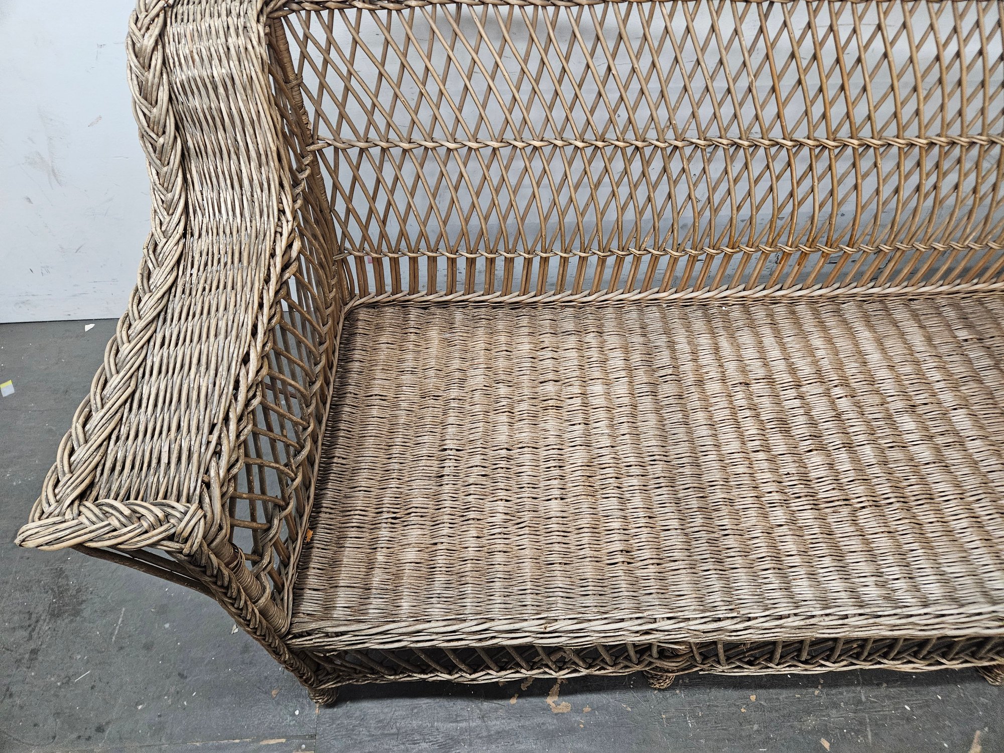 overall still in nice condition. original finish, can be painted if you like. Only 6 cushions are included (without the 2 on the sides which are resting against the armrests. Those 2 cushions belong to the wicker chair listed in different listing ).