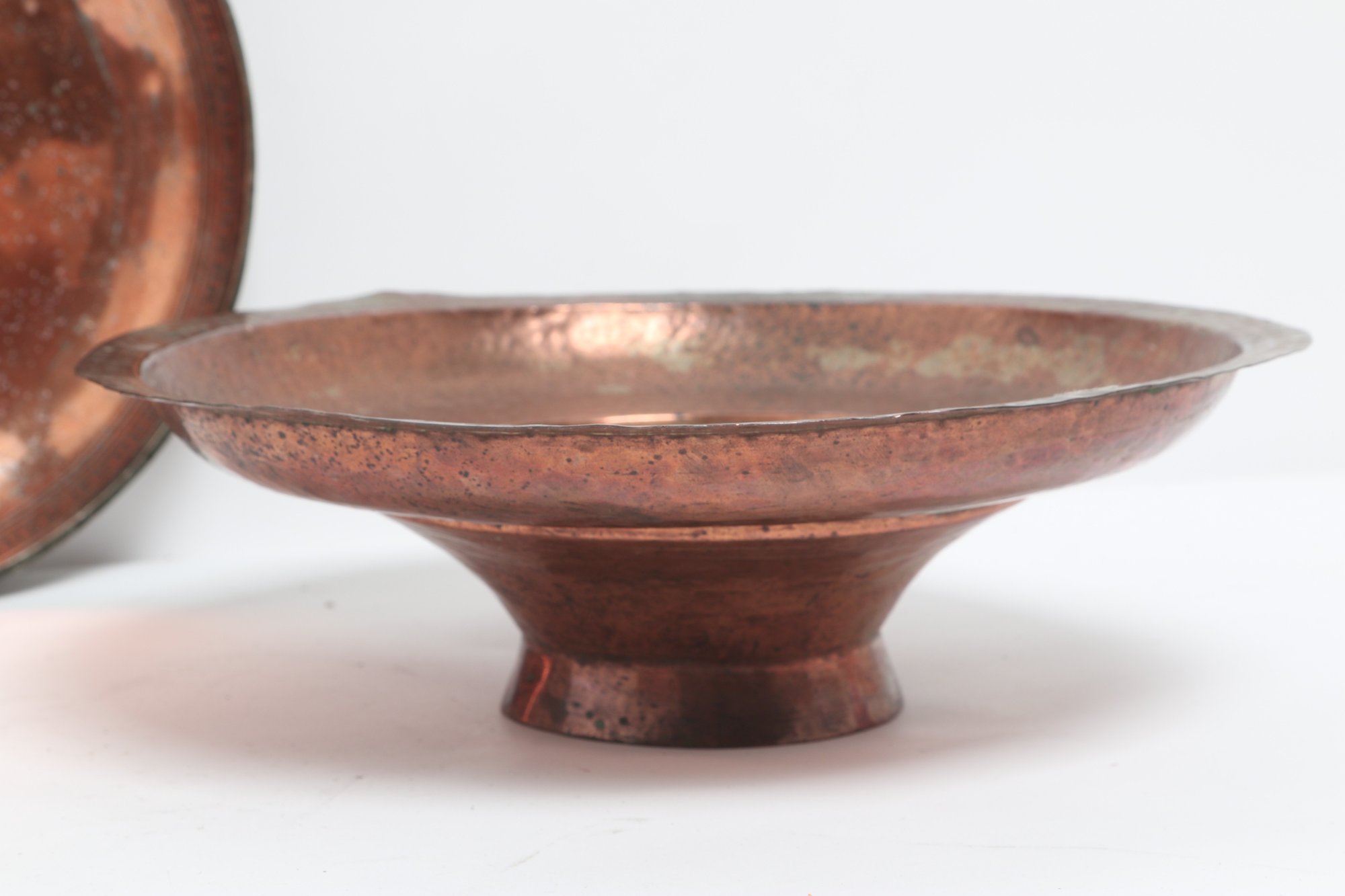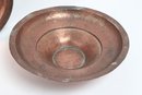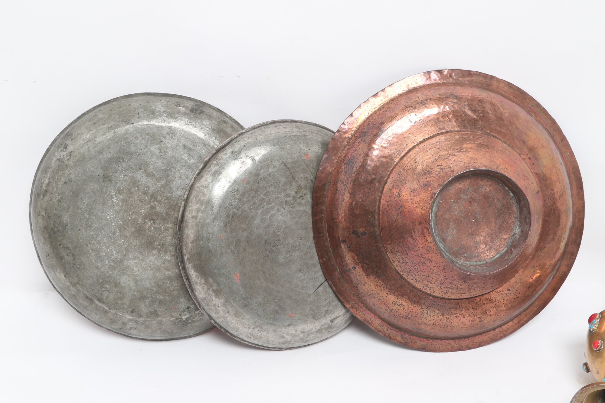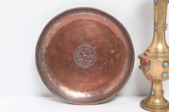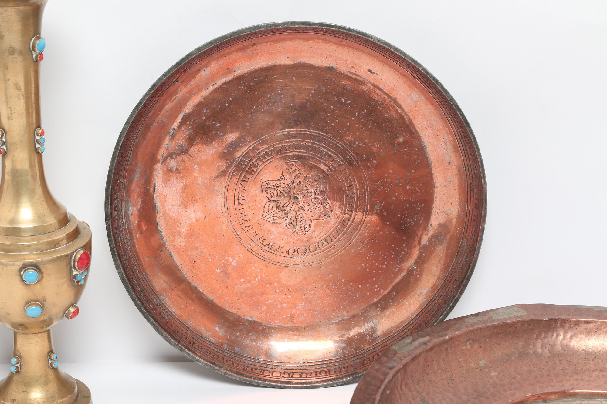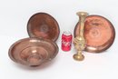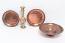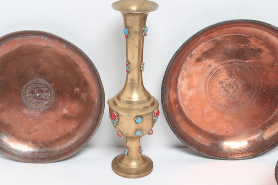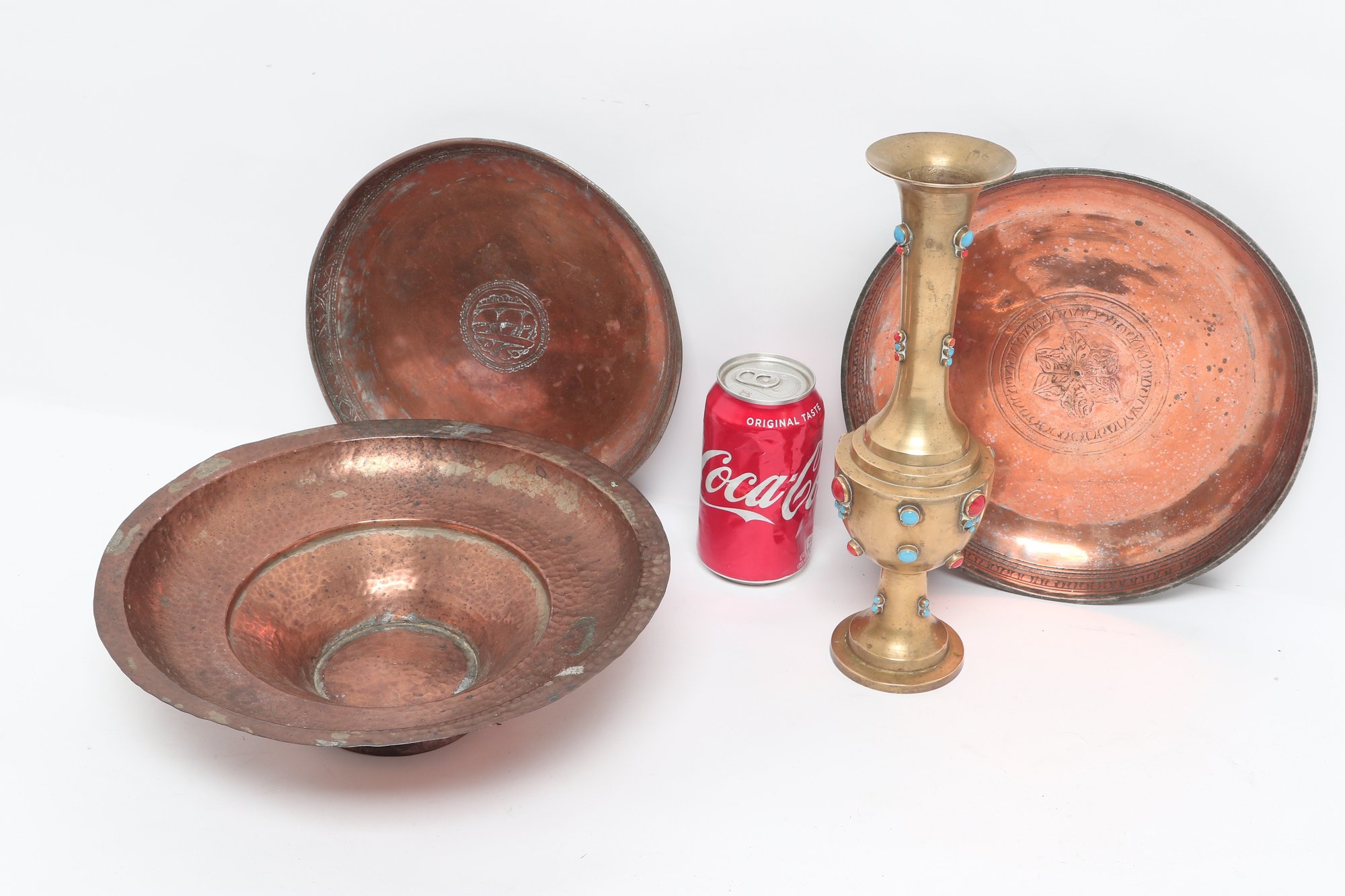 Collection of vintage metalware including copper bowls and plates with visible patina, along with a brass vase accented with colorful turquoise-style inlays. Pieces show age and wear consistent with use; decorative group for display or collection.