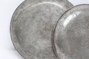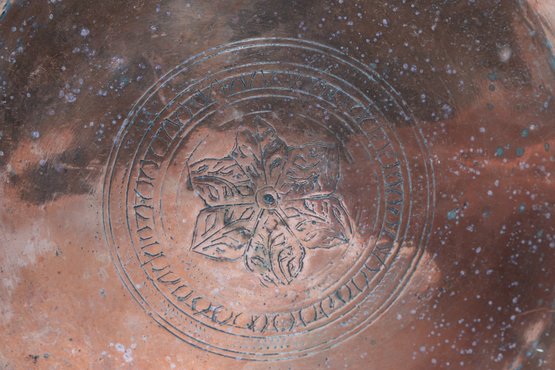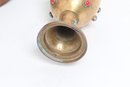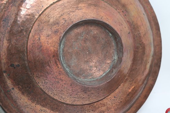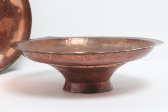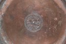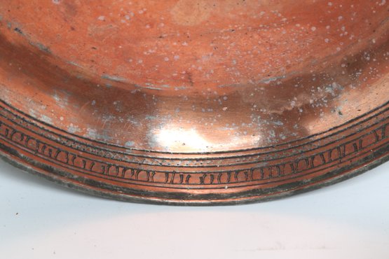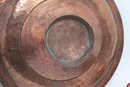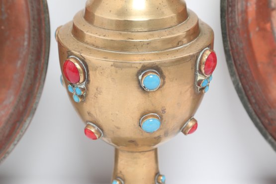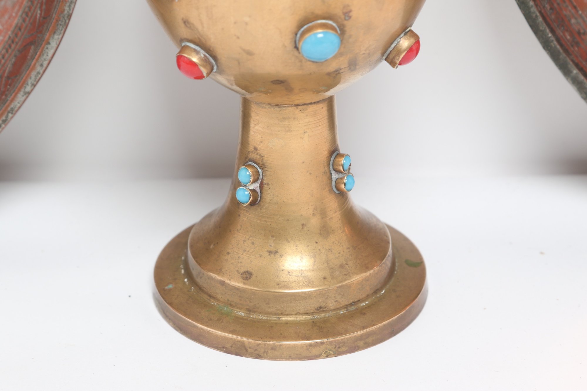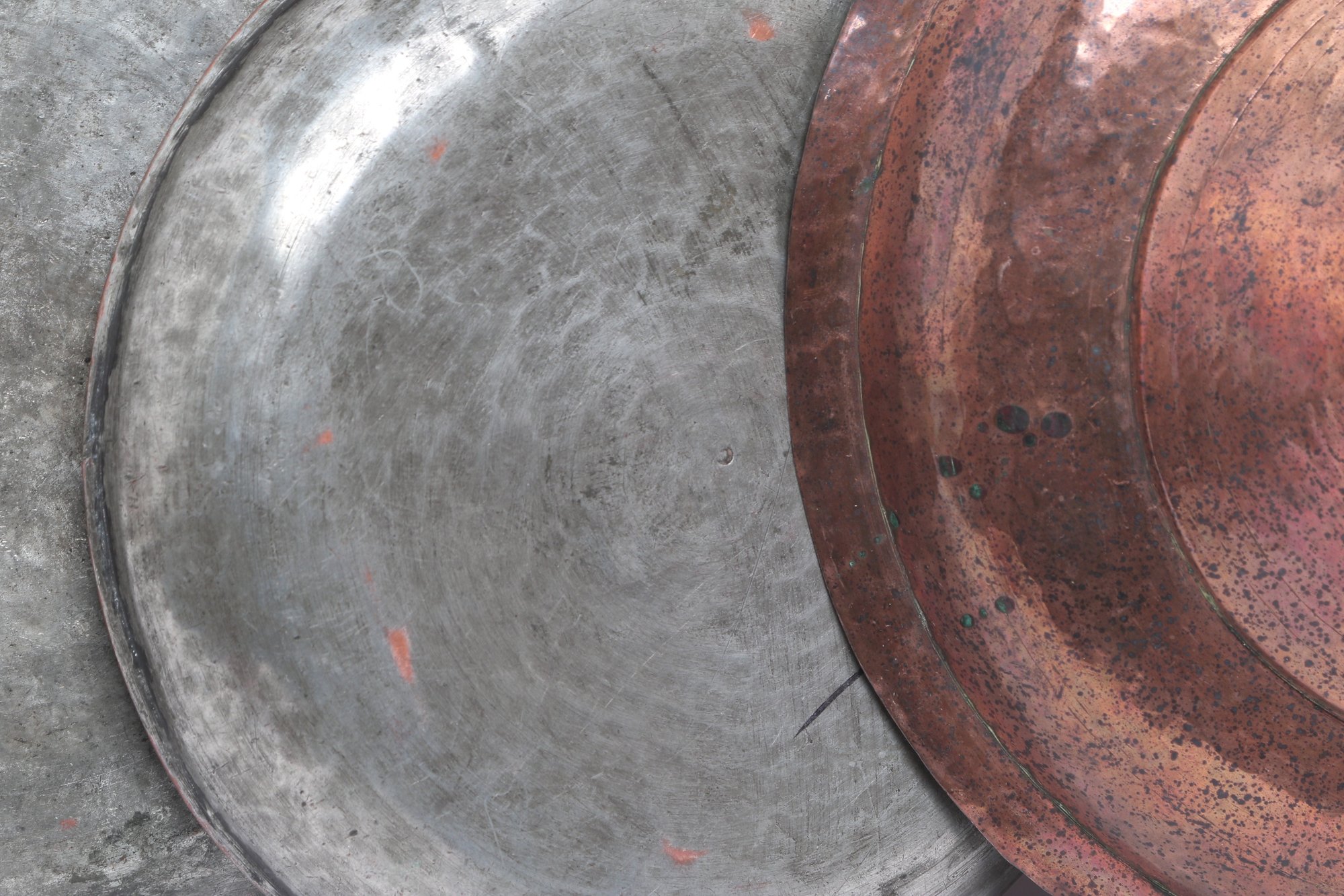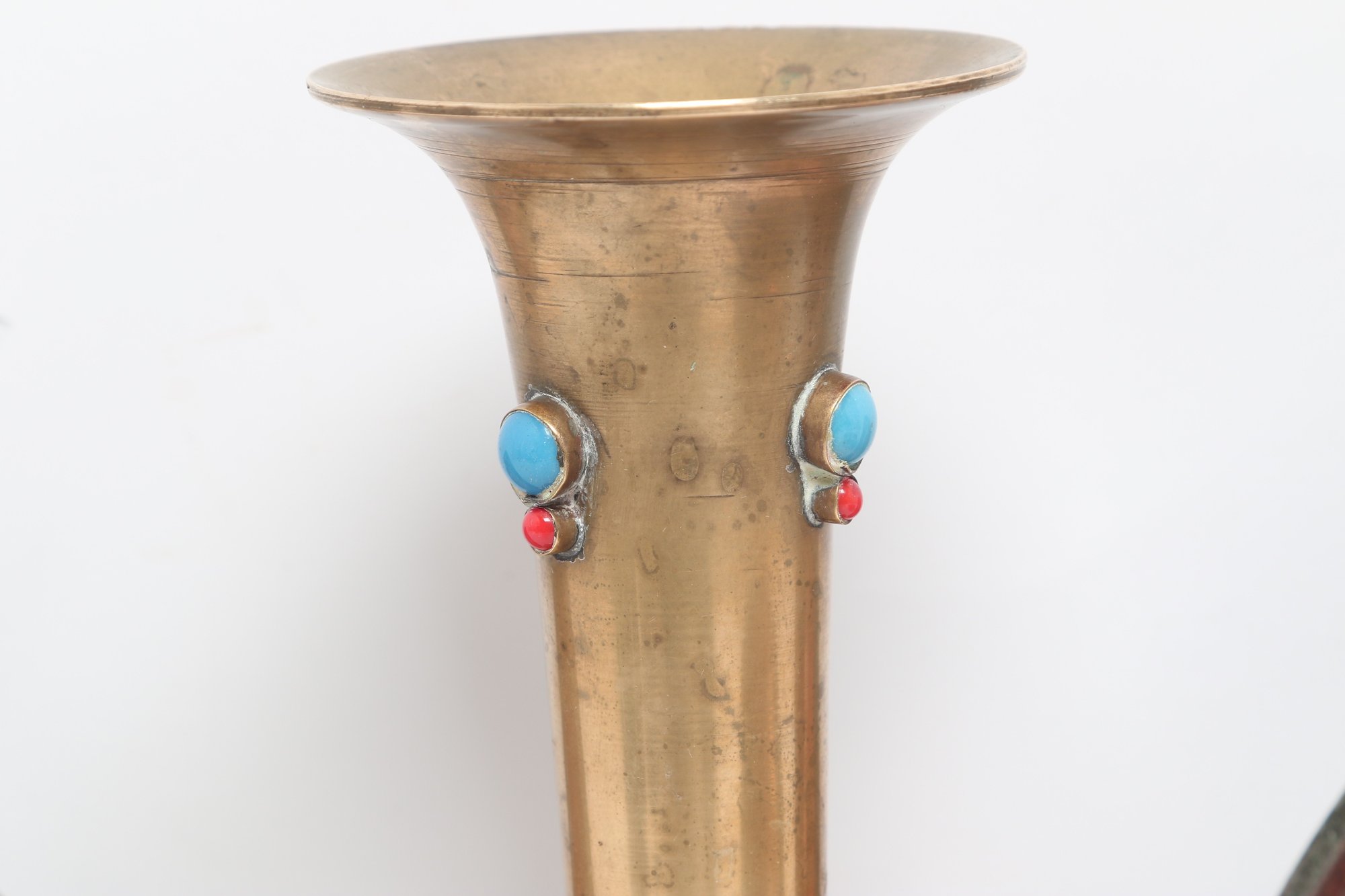 Collection of vintage metalware including copper bowls and plates with visible patina, along with a brass vase accented with colorful turquoise-style inlays. Pieces show age and wear consistent with use; decorative group for display or collection.
