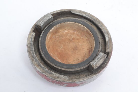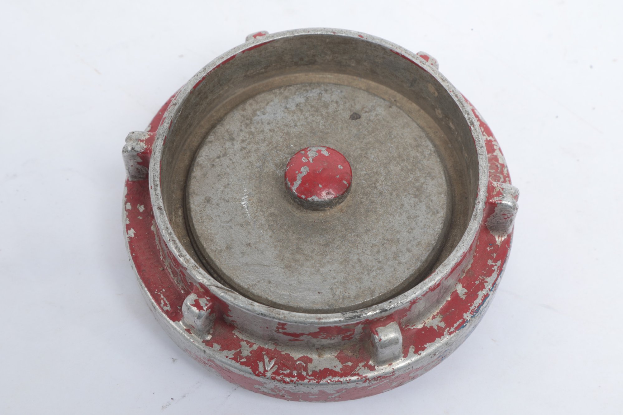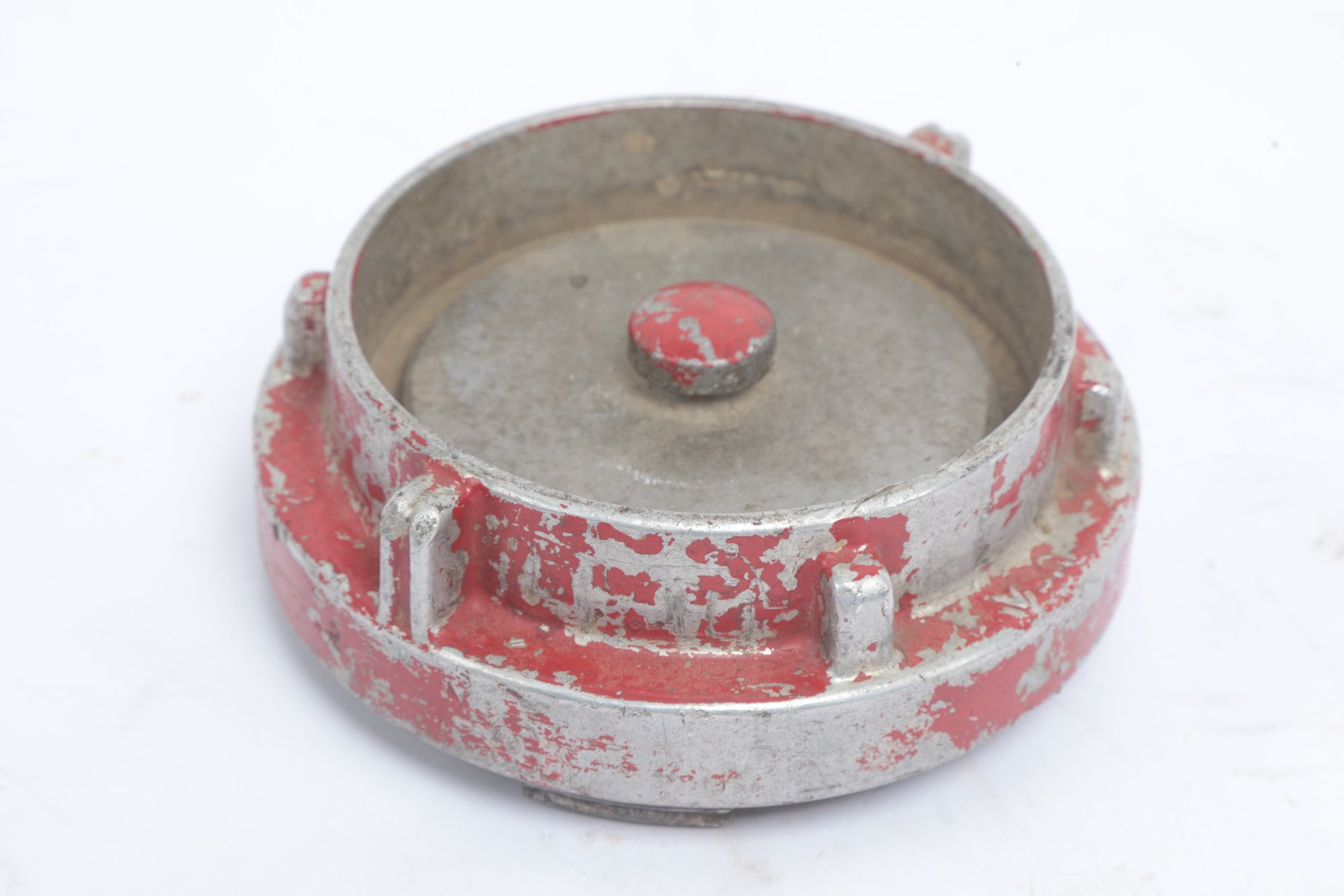 Vintage Fire Hose Connector Cap. Has wear and paint peeling from age and use. Sold for collecting or display, see pictures carefully for details on size and condition.