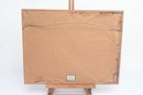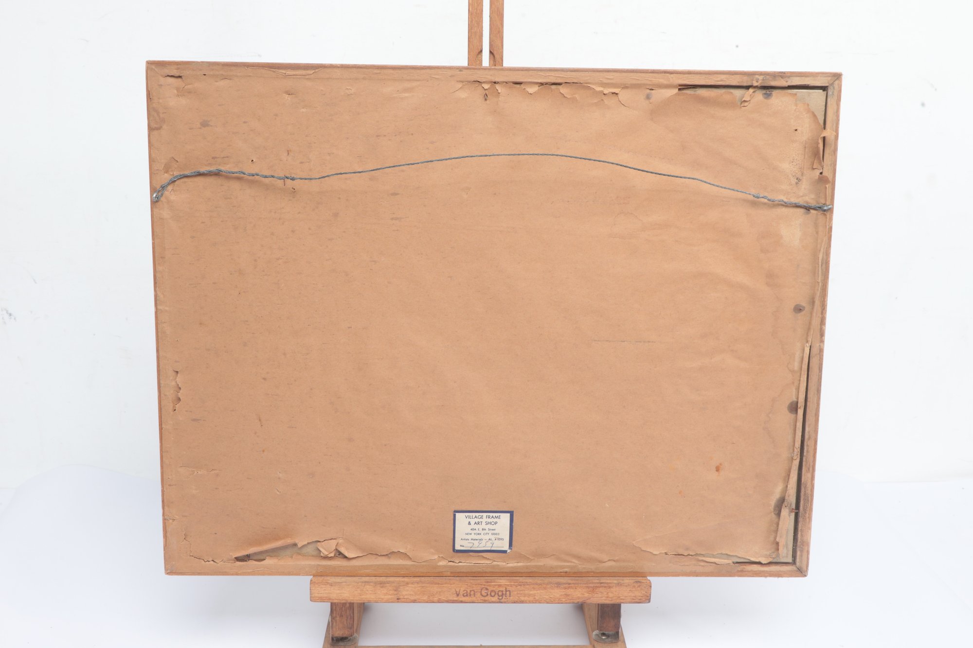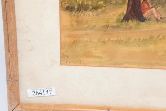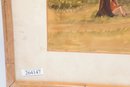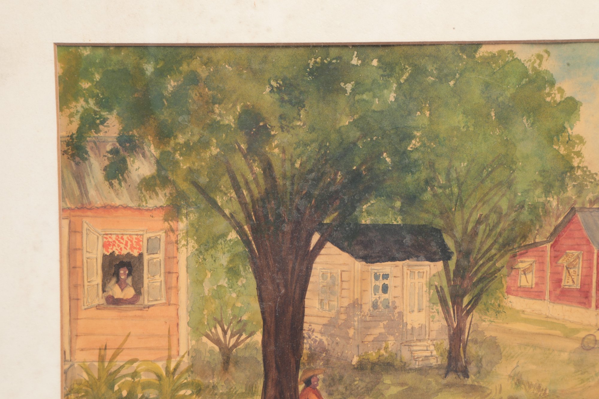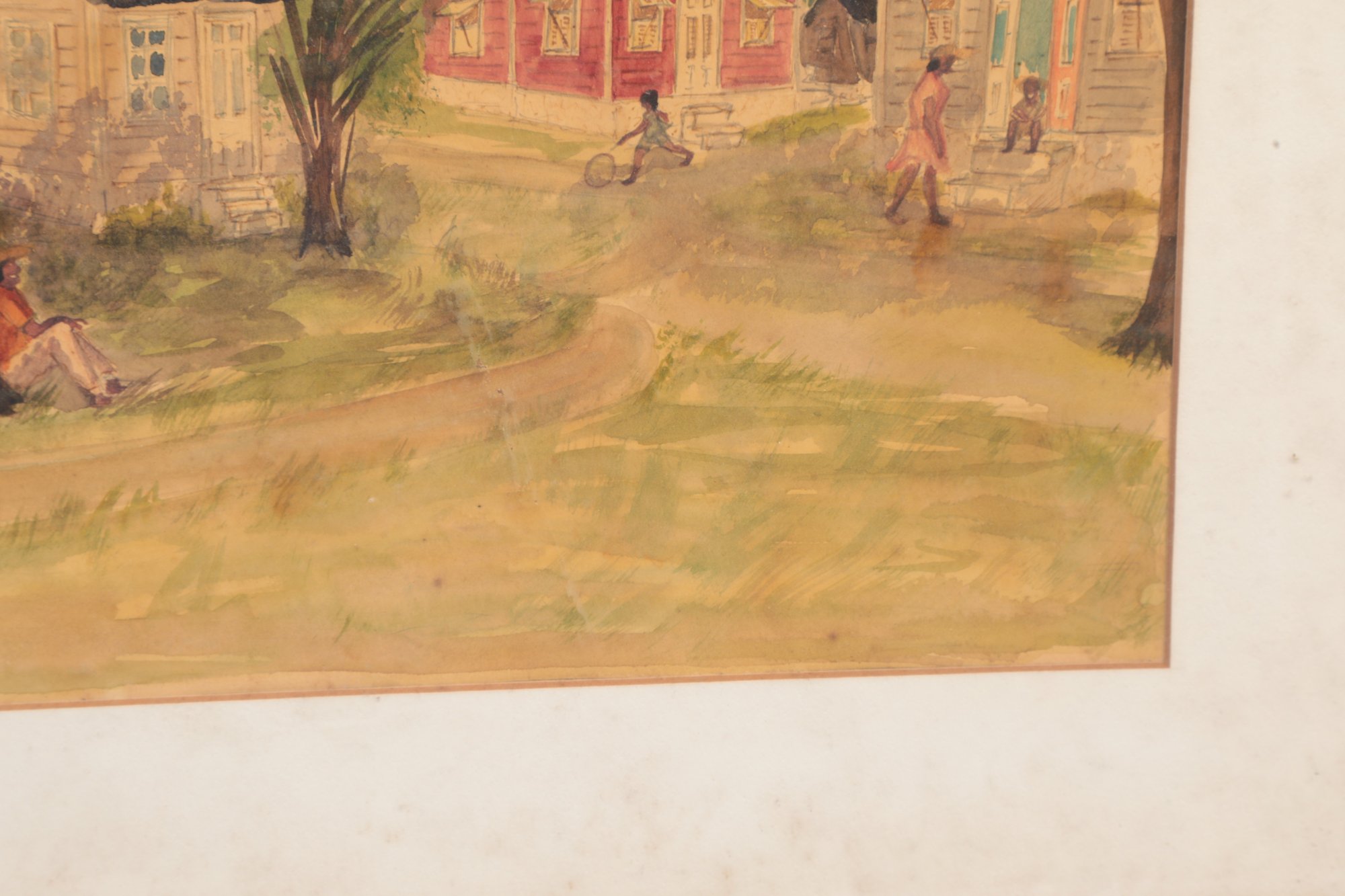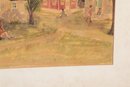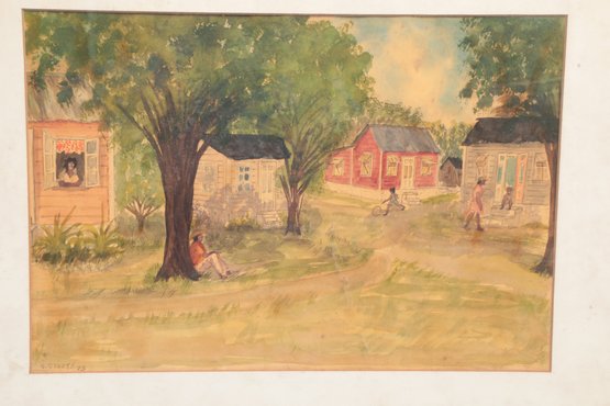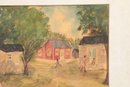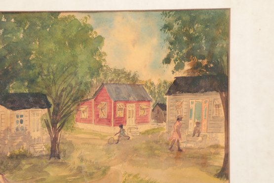 Vintage folk art style landscape painting depicting a small village scene with houses, figures, and children playing outdoors. Artist signed and dated along the lower edge. Presented in a simple wood frame with matting. Light age-related wear to the frame and mat; a charming mid-century decorative artwork.