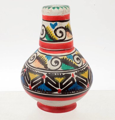 2-piece lot. Brightly decorated white clay carafe and cup.
