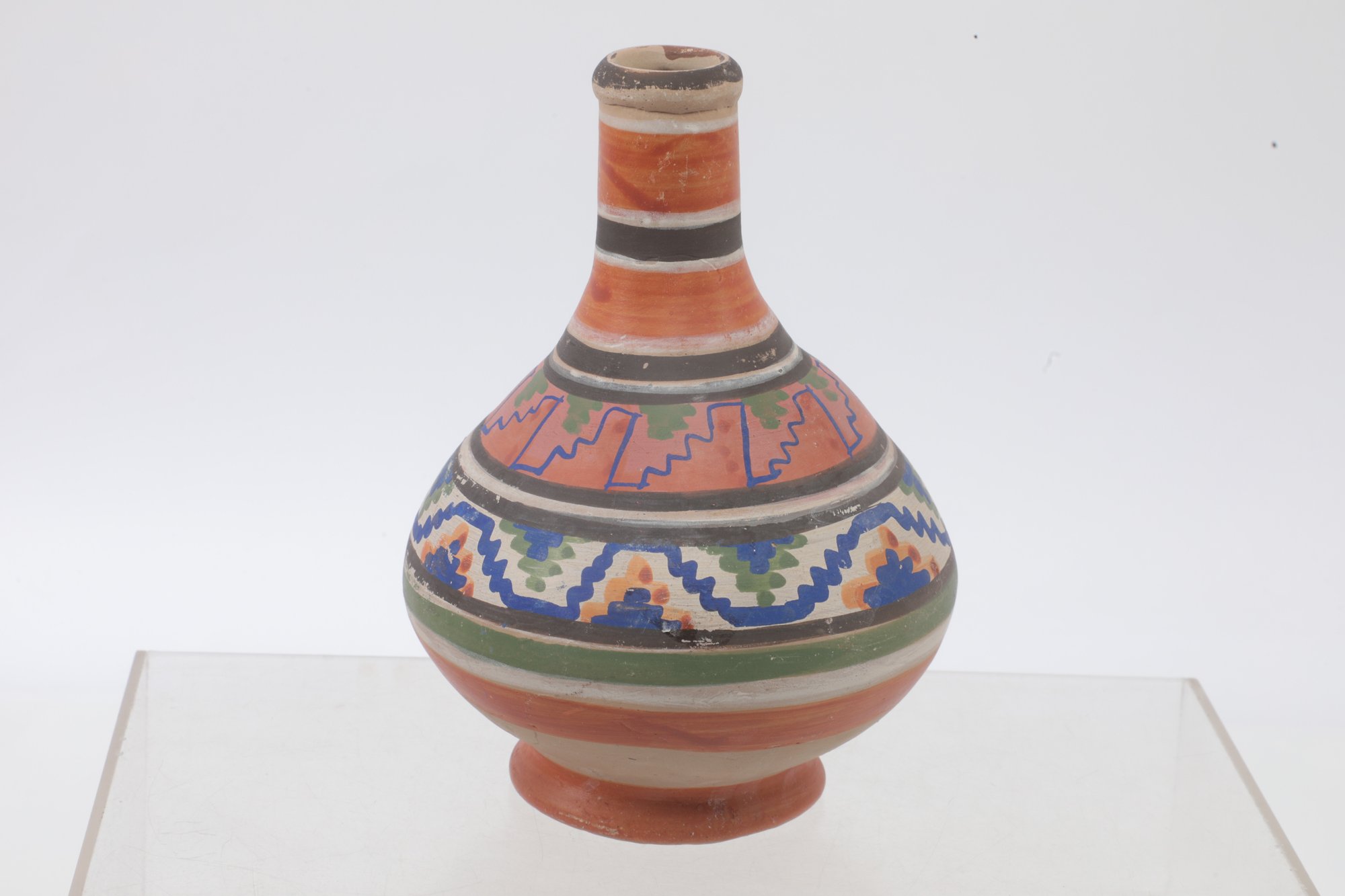 2-piece lot. Blue and earth tone decorated white clay carafe and cup.