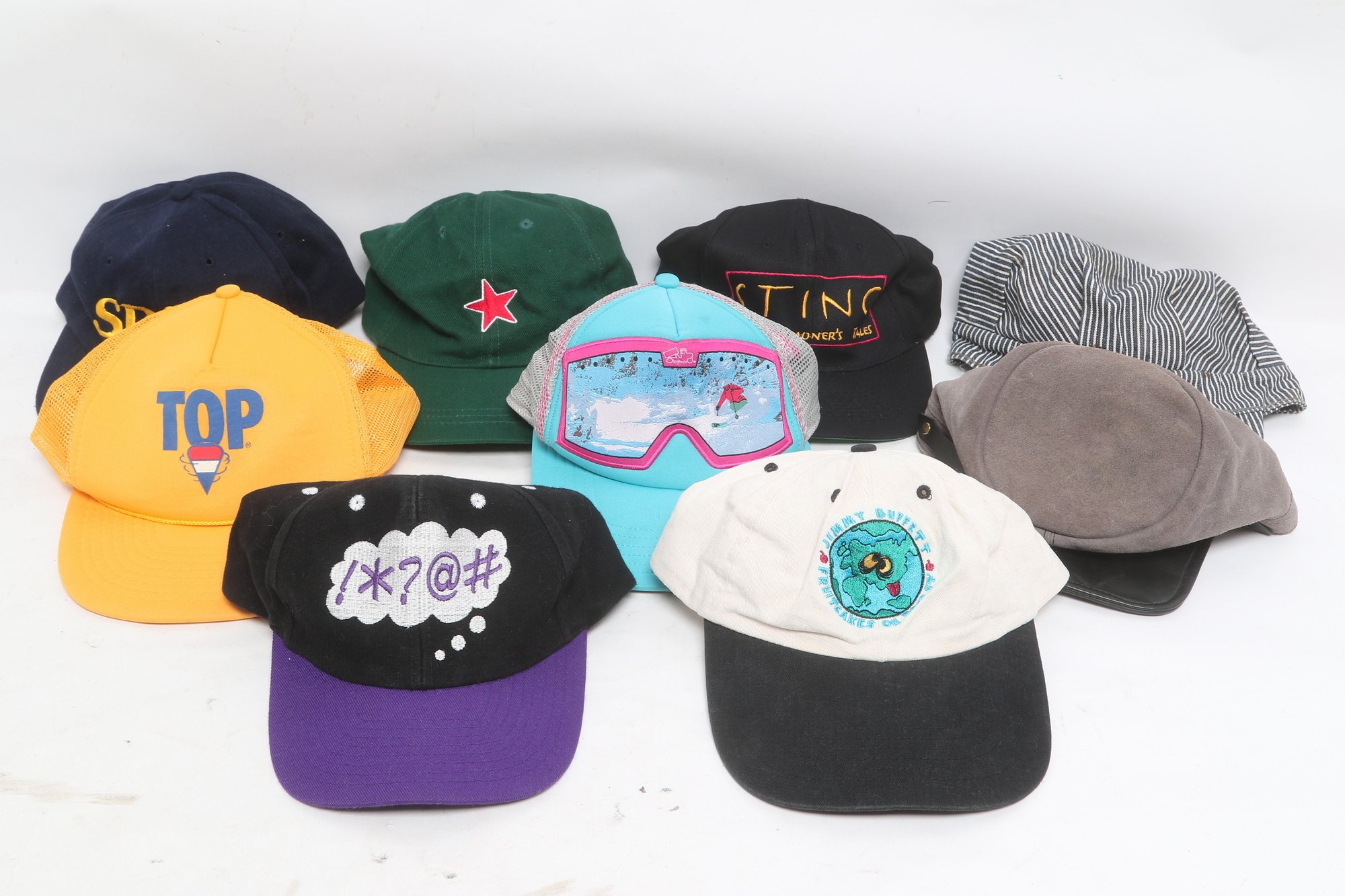 Assorted lot of nine hats including baseball caps, snapbacks, and newsboy styles in various colors and designs. Features graphic logos, embroidered details, and casual everyday wear styles. Pre-owned with visible wear consistent with use.