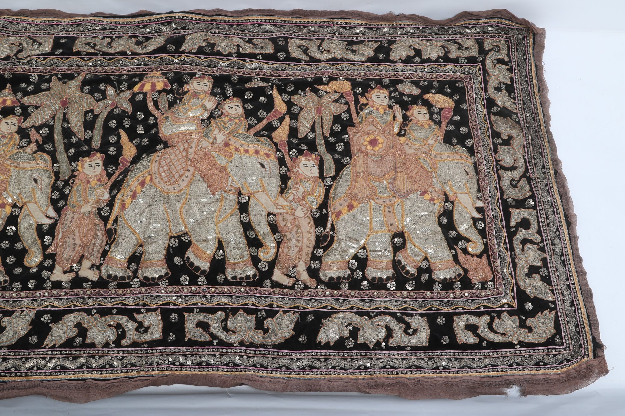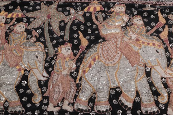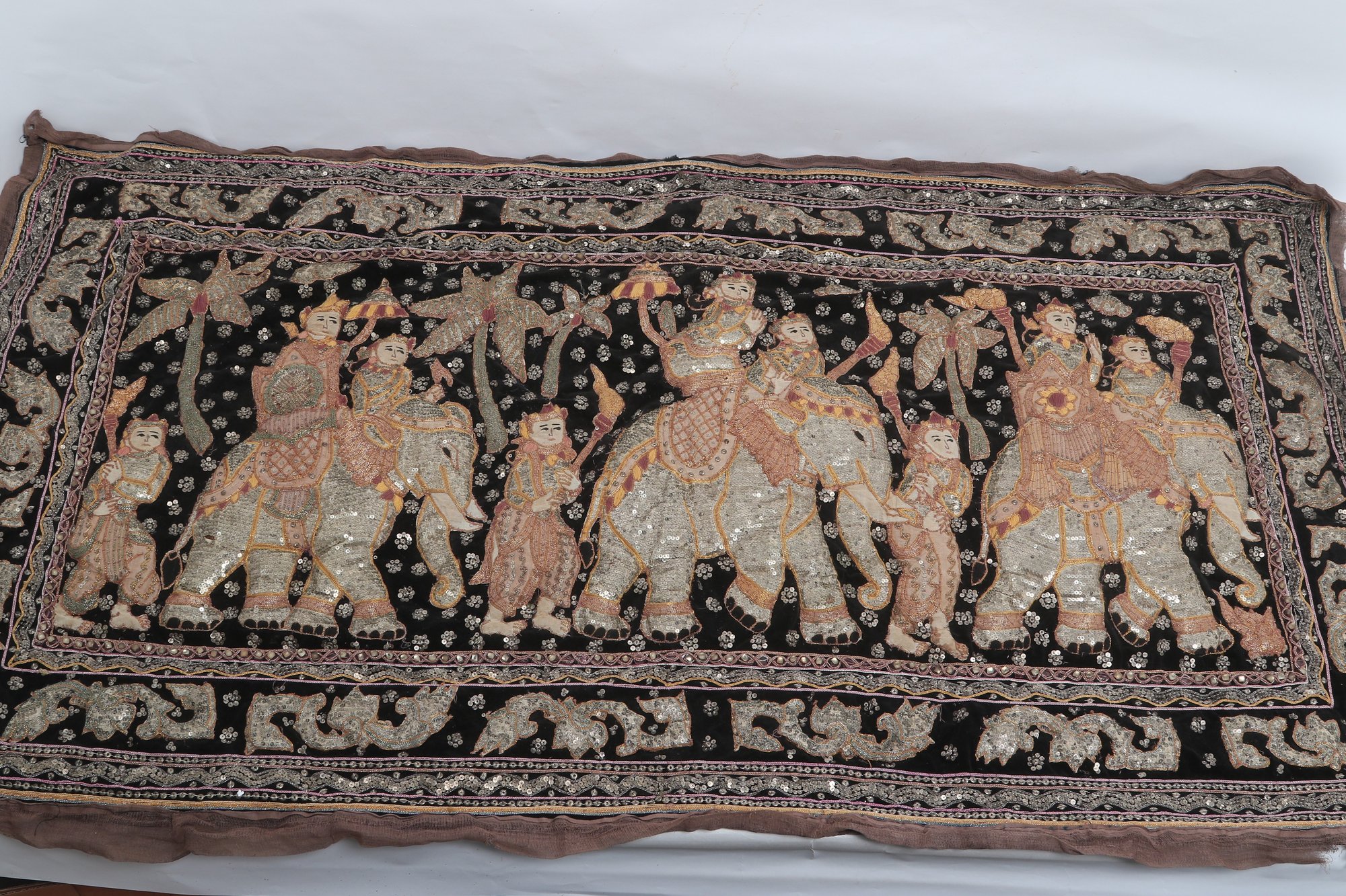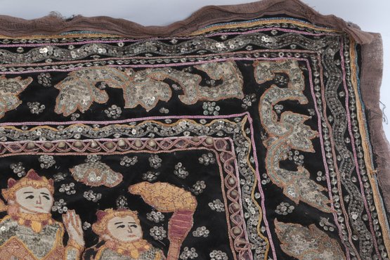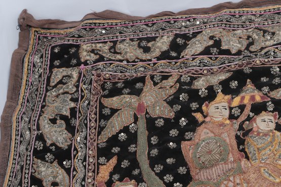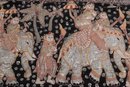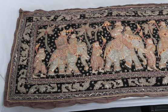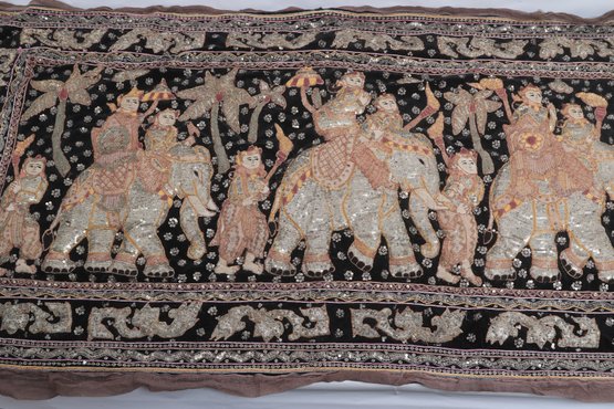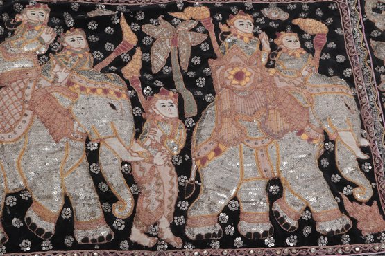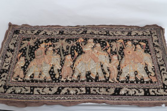 Striking vintage Indian textile wall hanging featuring elaborately dressed figures riding elephants, richly decorated with intricate hand embroidery and metallic thread accents on a dark ground. Measures approximately 51” x 32”. Shows visible wear, fraying, and loss in areas, consistent with age, but retains strong decorative appeal.