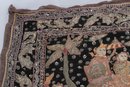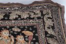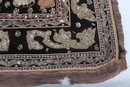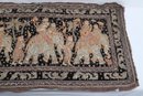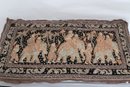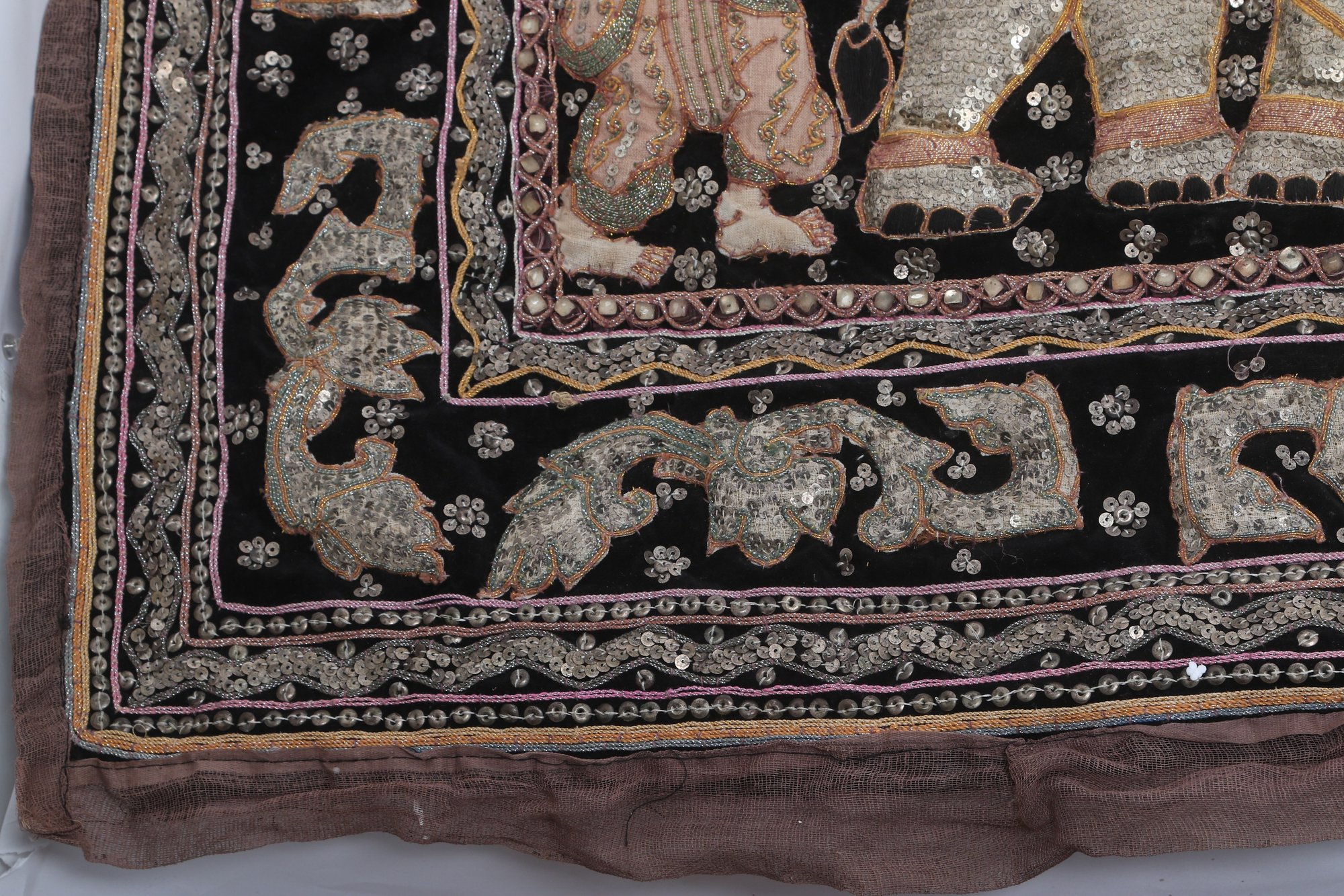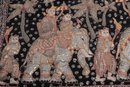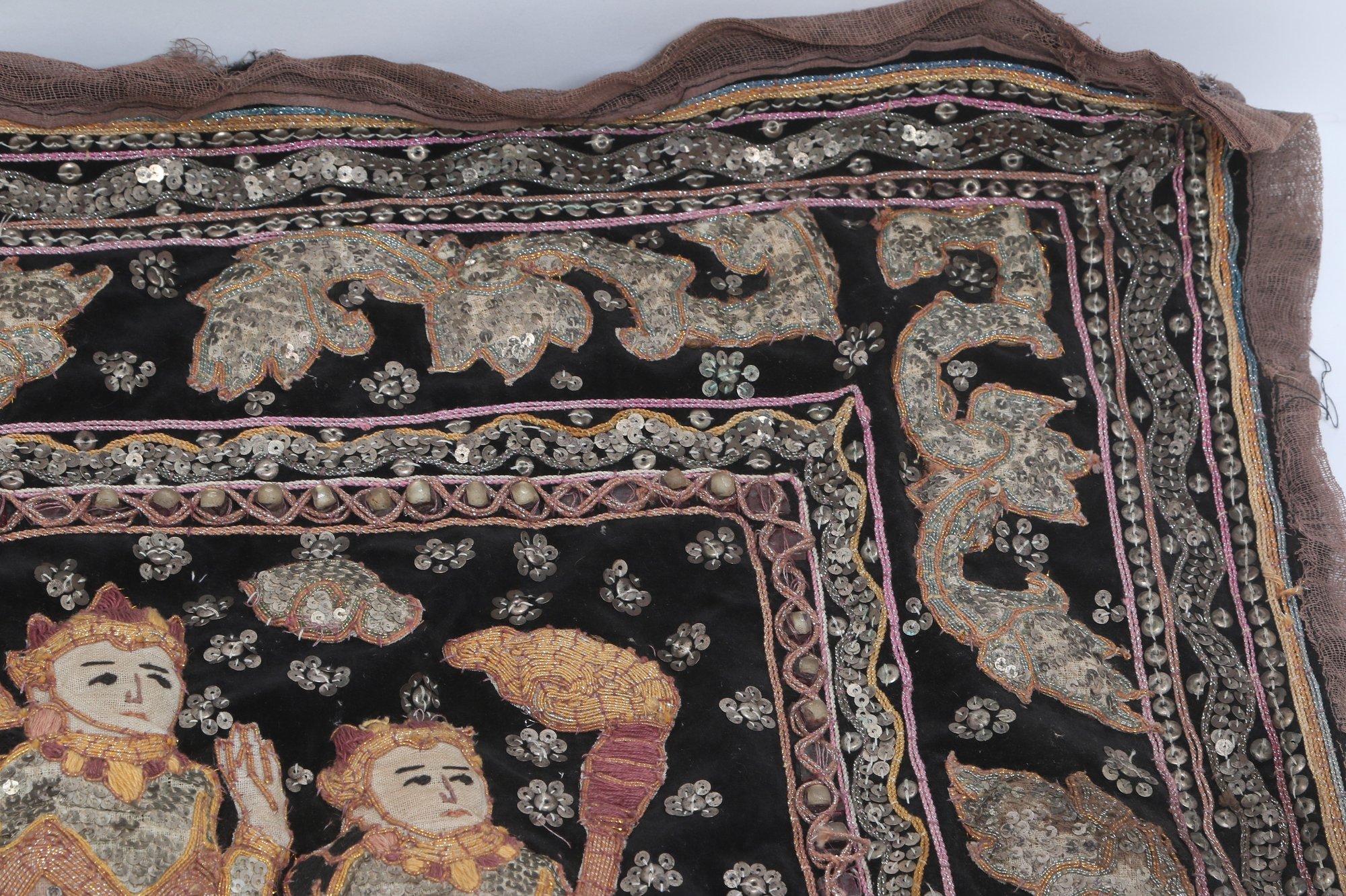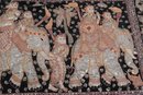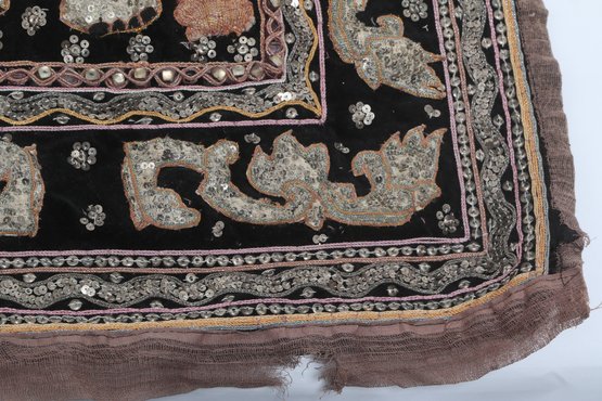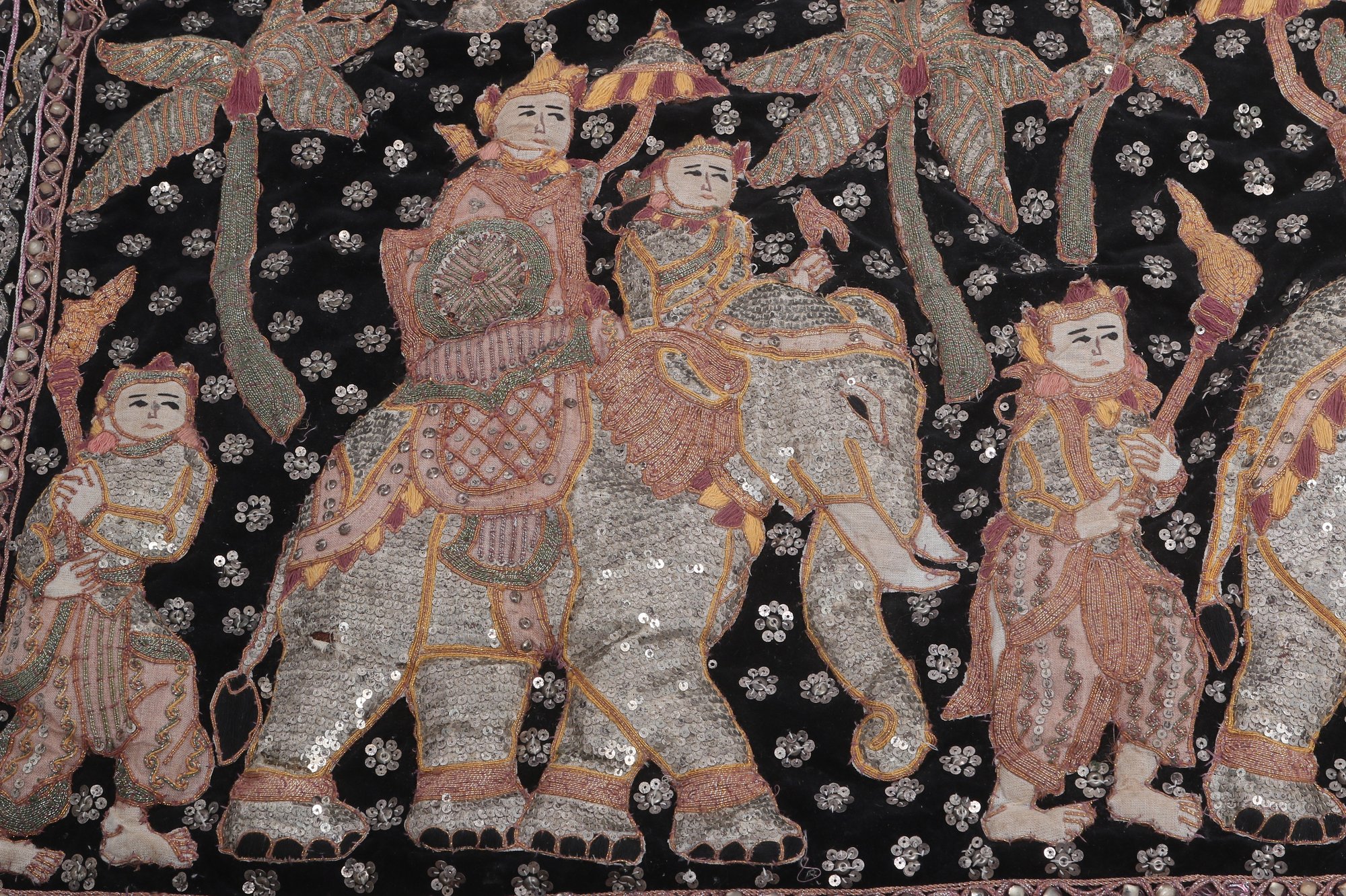 Striking vintage Indian textile wall hanging featuring elaborately dressed figures riding elephants, richly decorated with intricate hand embroidery and metallic thread accents on a dark ground. Measures approximately 51” x 32”. Shows visible wear, fraying, and loss in areas, consistent with age, but retains strong decorative appeal.