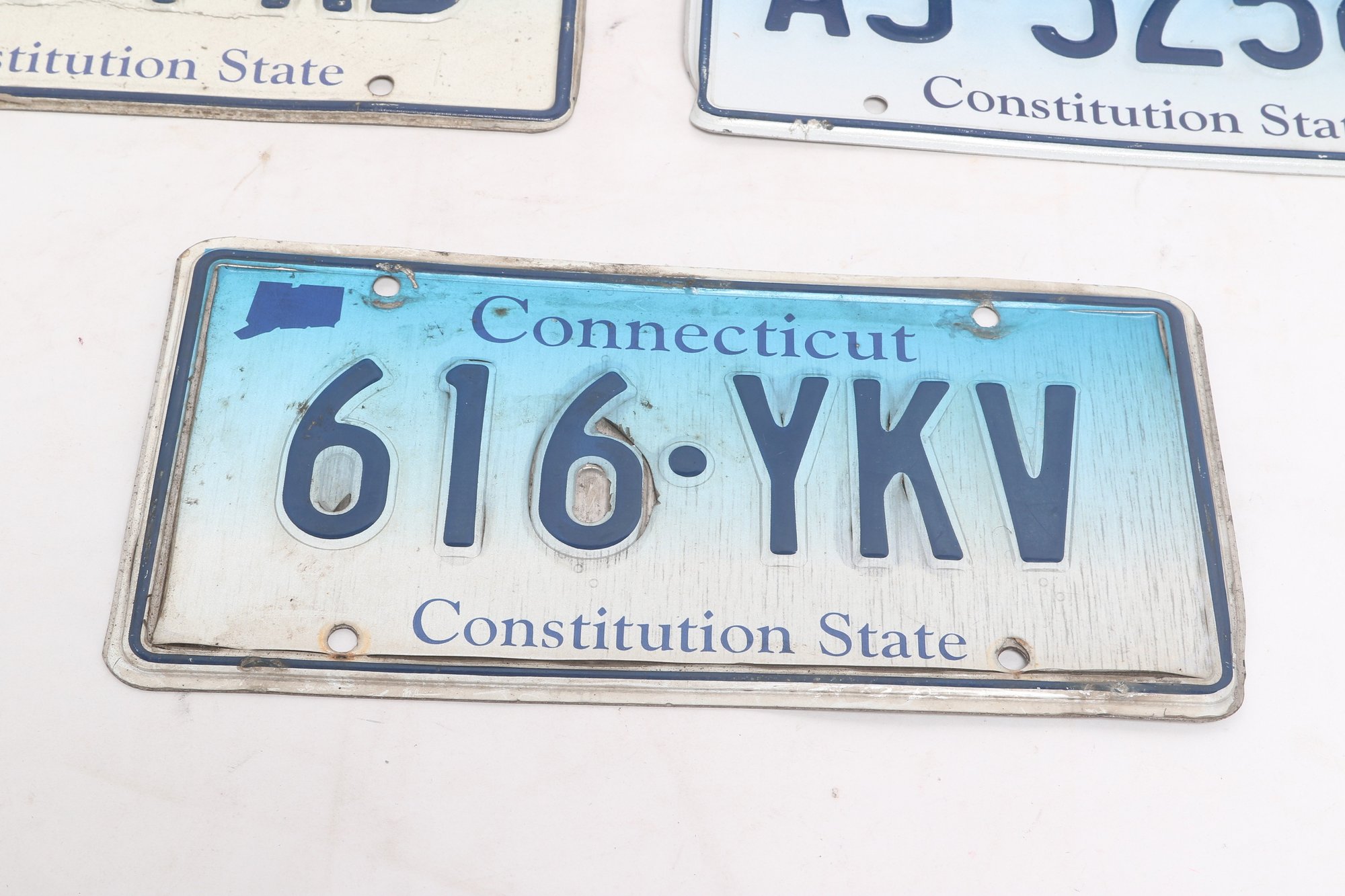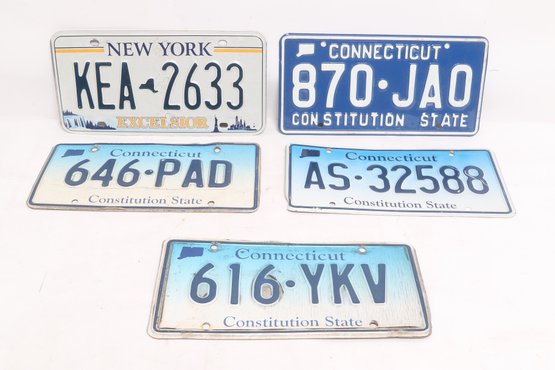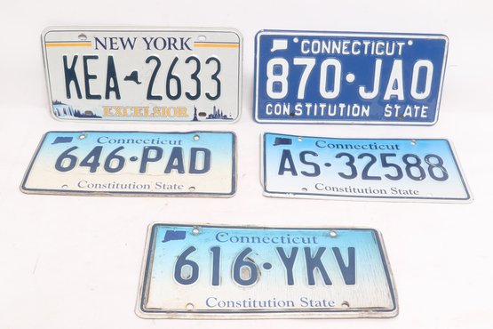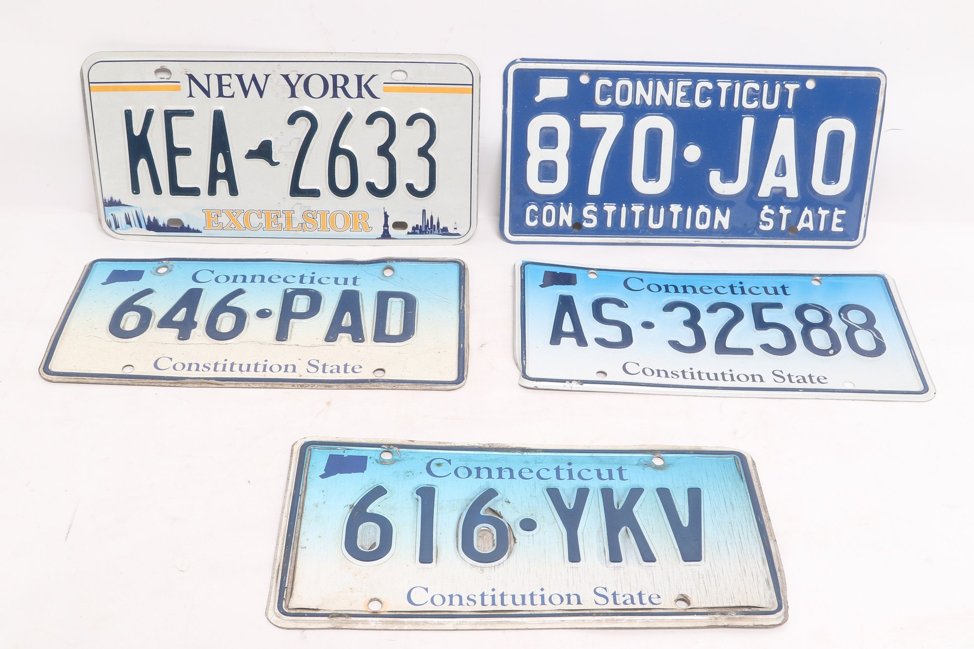 Lot of five vintage license plates including Connecticut and New York examples with assorted numbers and designs. Features classic “Constitution State” plates and older New York style. Shows wear, discoloration, and patina consistent with age, ideal for collection or décor.