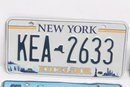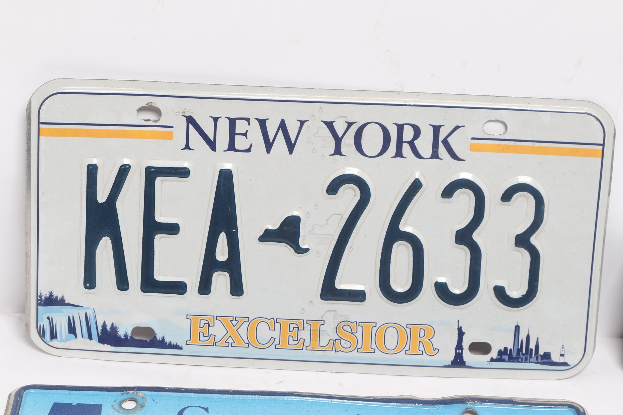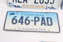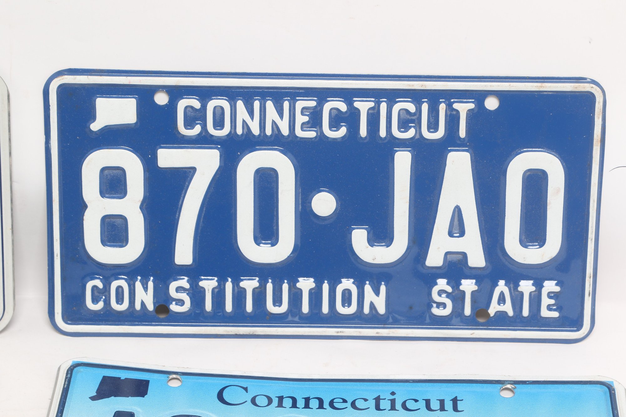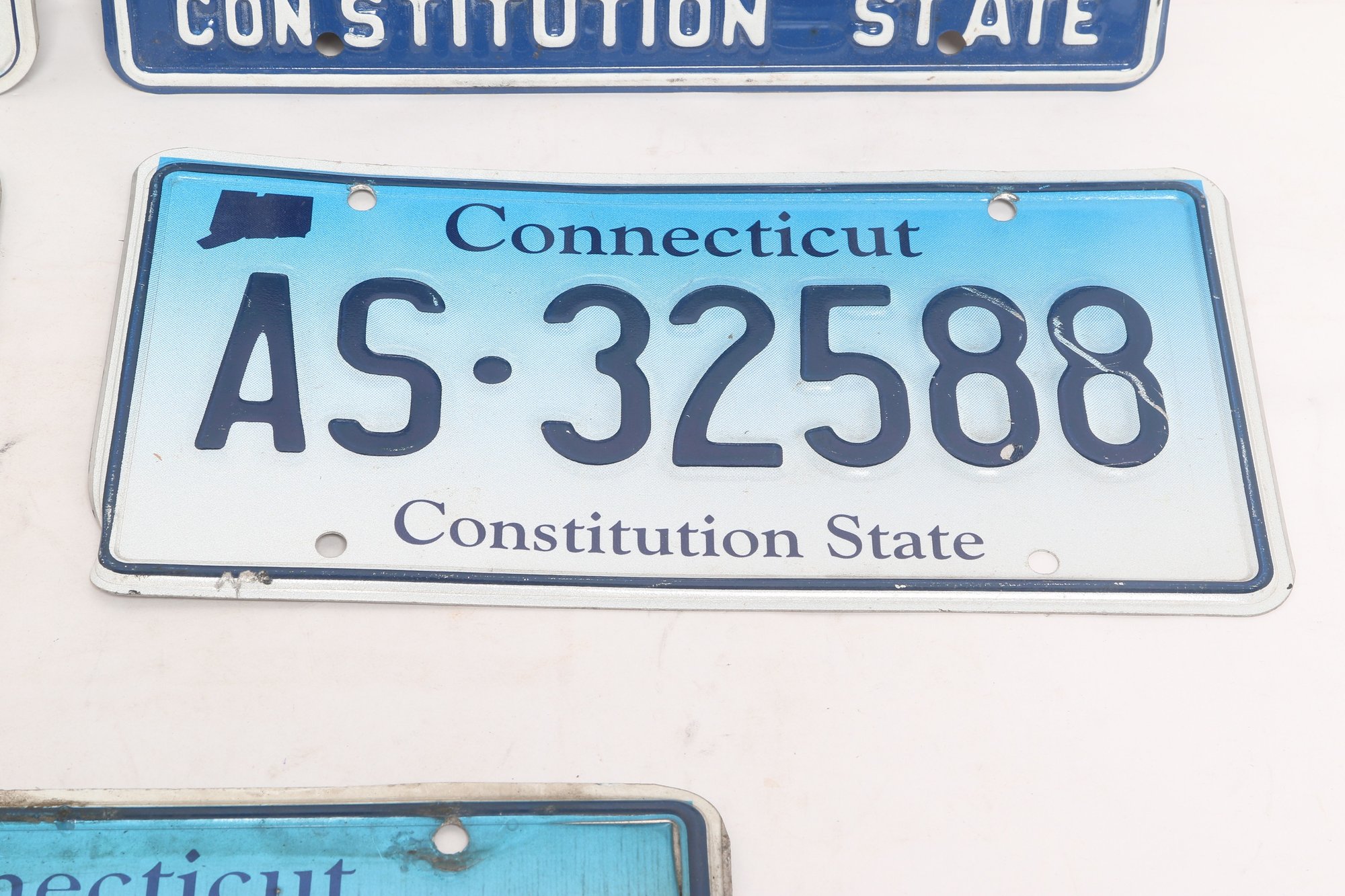 Lot of five vintage license plates including Connecticut and New York examples with assorted numbers and designs. Features classic “Constitution State” plates and older New York style. Shows wear, discoloration, and patina consistent with age, ideal for collection or décor.