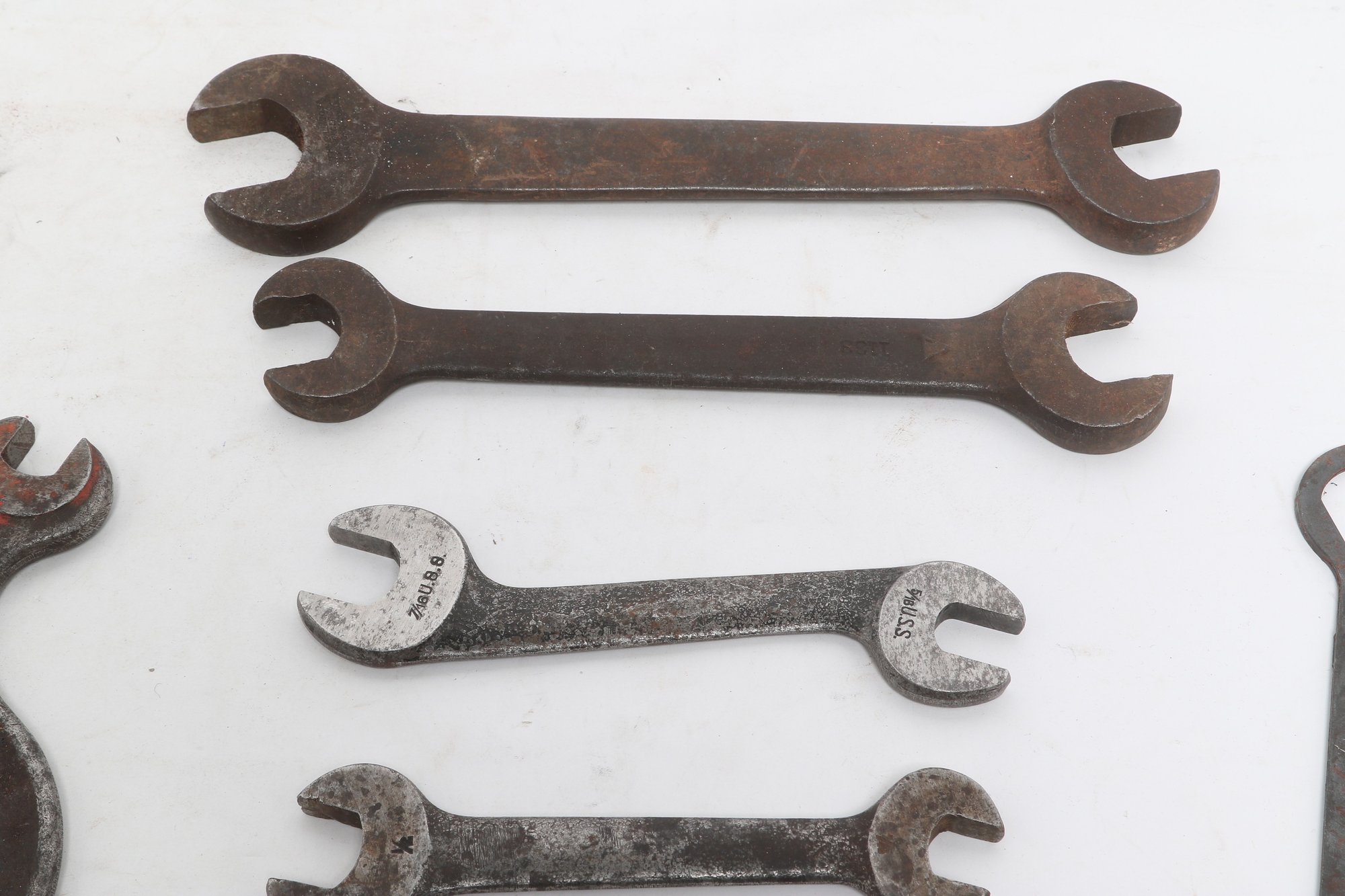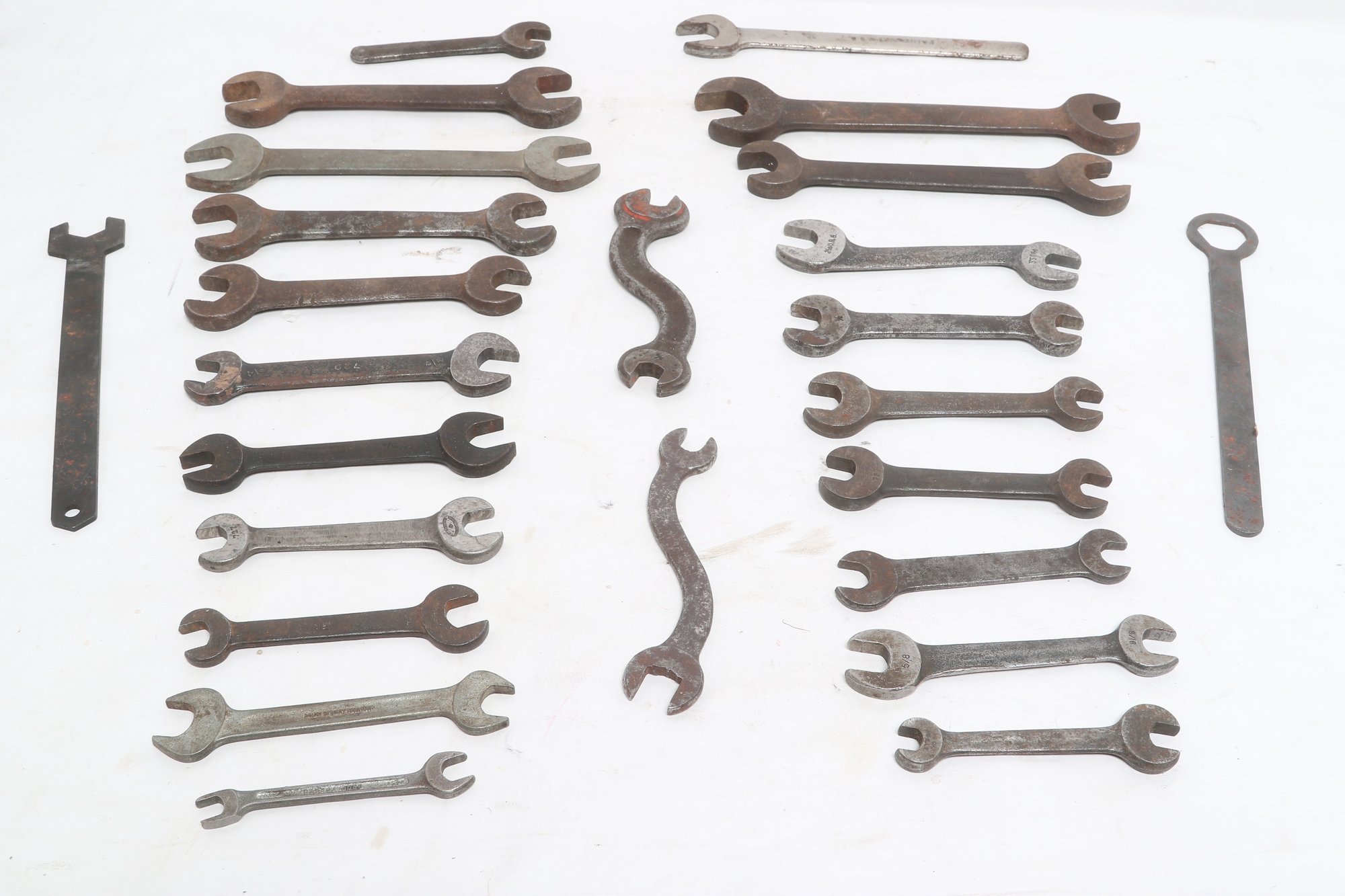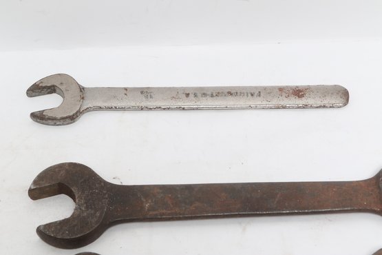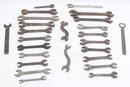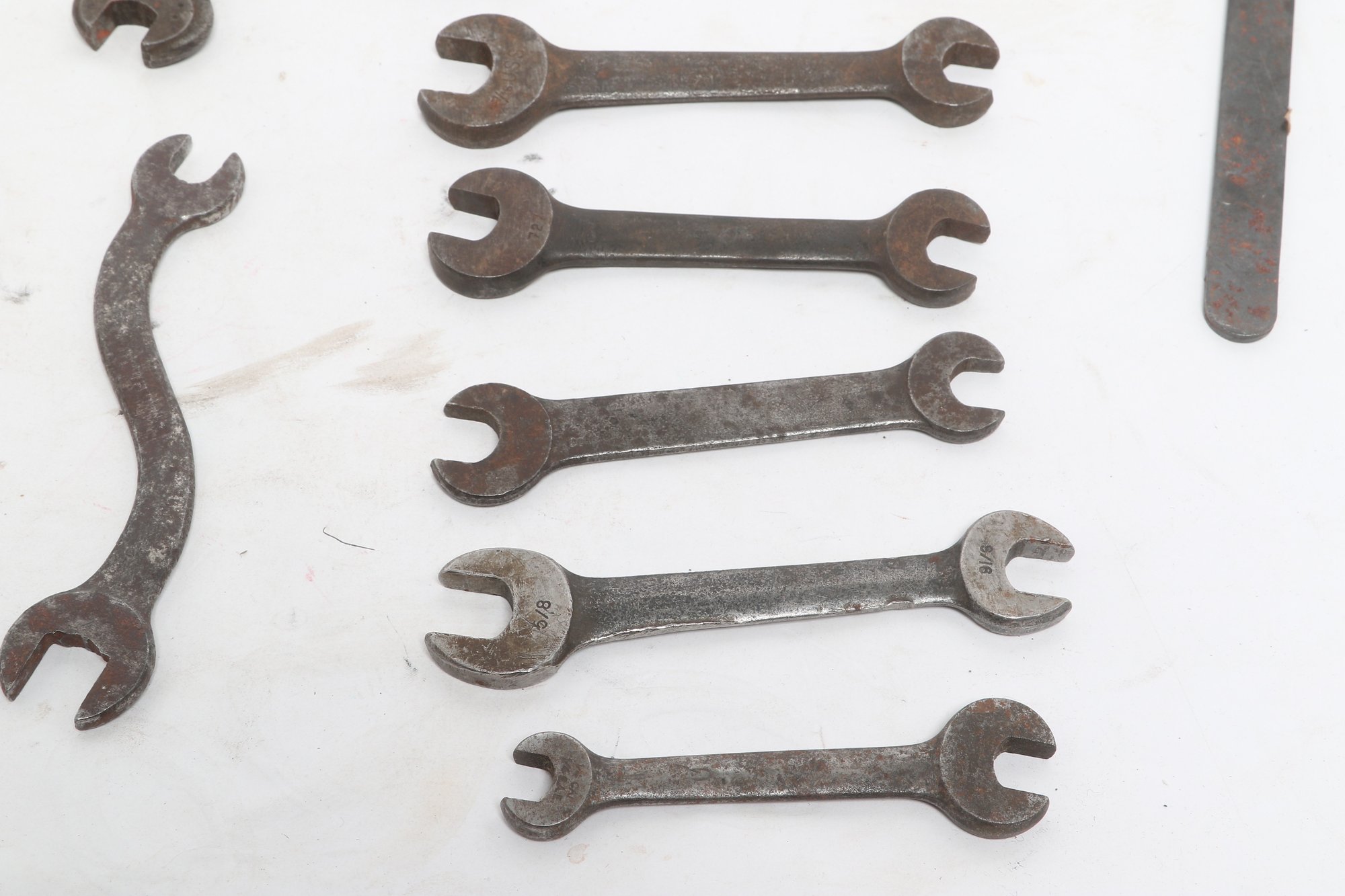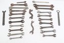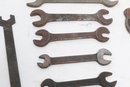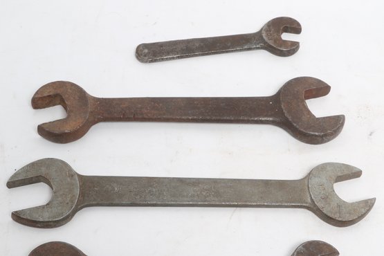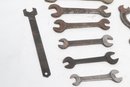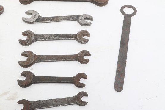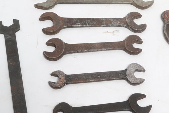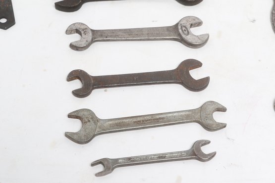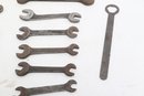 Assorted lot of vintage machinist open-end wrenches in various sizes and styles. Includes multiple well-used tools with aged patina, ideal for collectors, restoration, or workshop use. Pre-owned with visible wear and oxidation consistent with age.