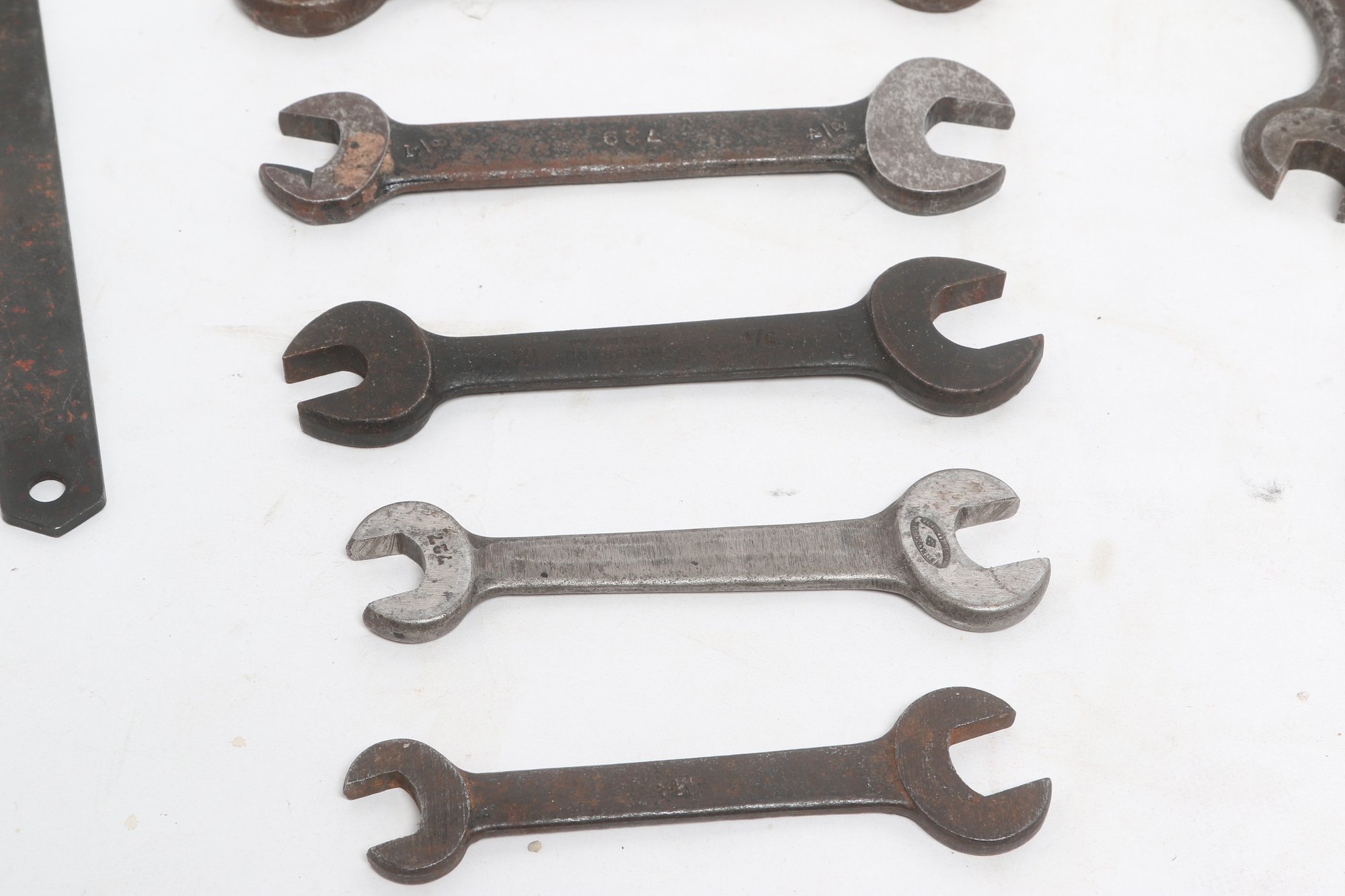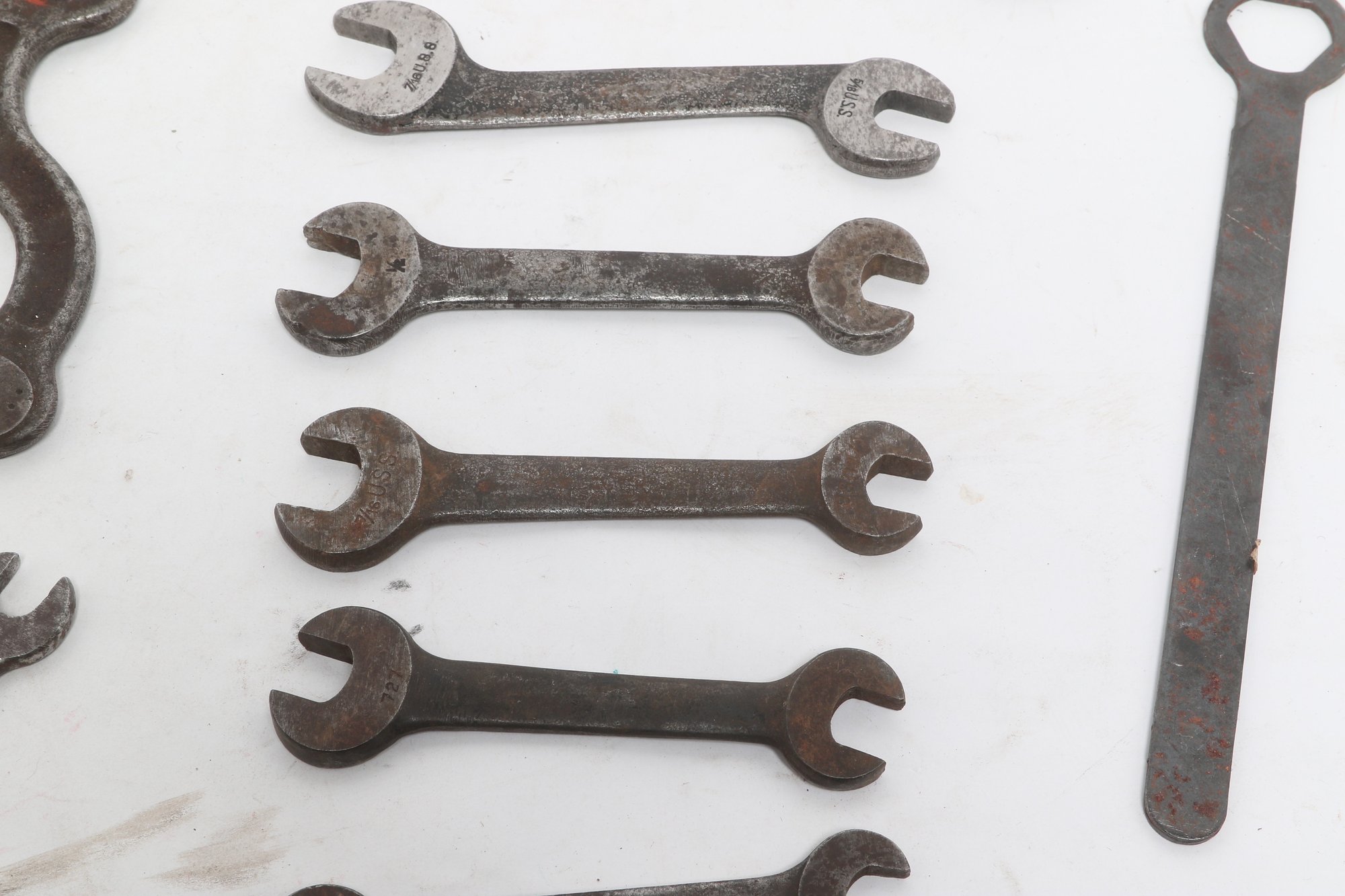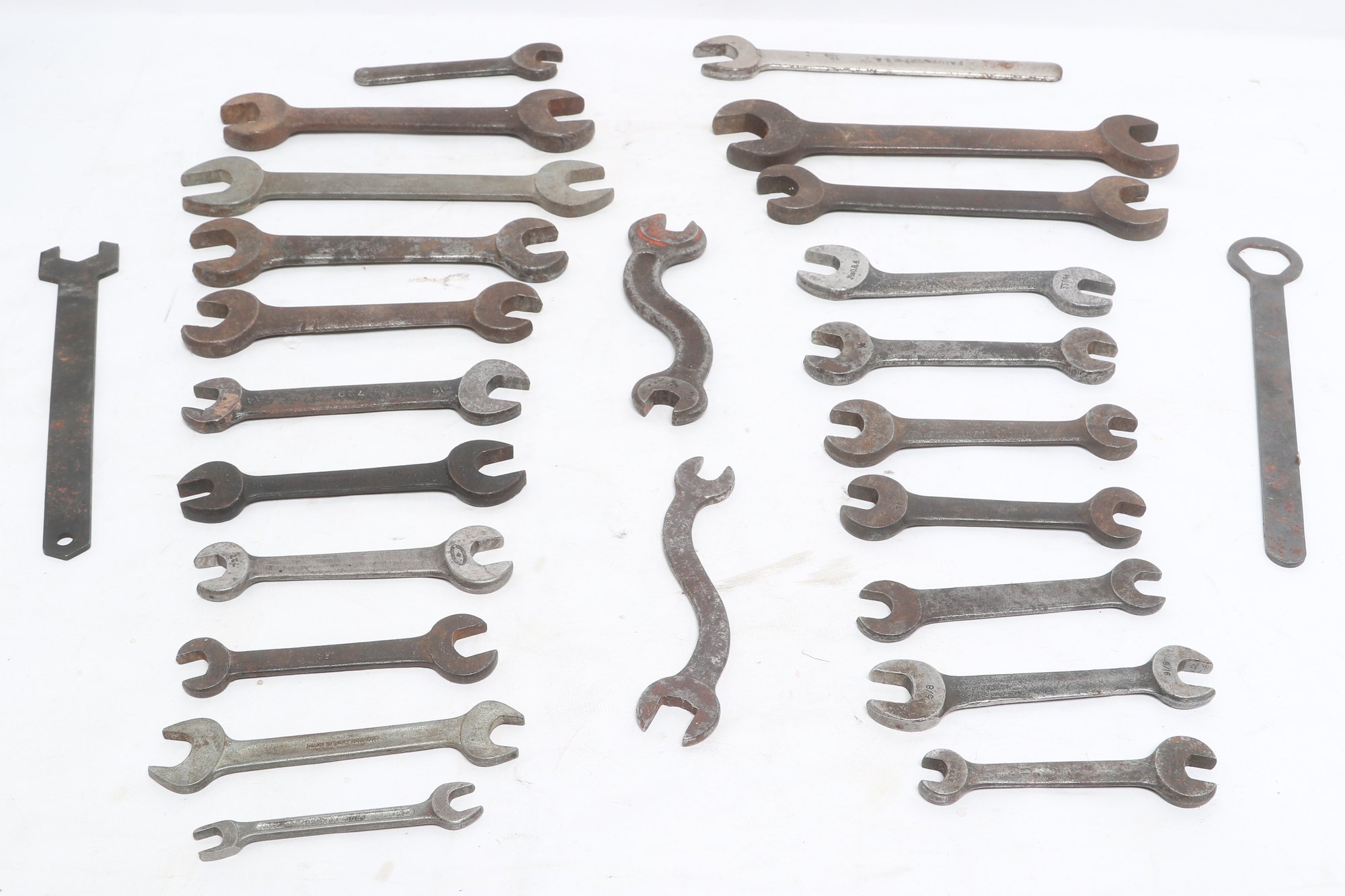 Assorted lot of vintage machinist open-end wrenches in various sizes and styles. Includes multiple well-used tools with aged patina, ideal for collectors, restoration, or workshop use. Pre-owned with visible wear and oxidation consistent with age.