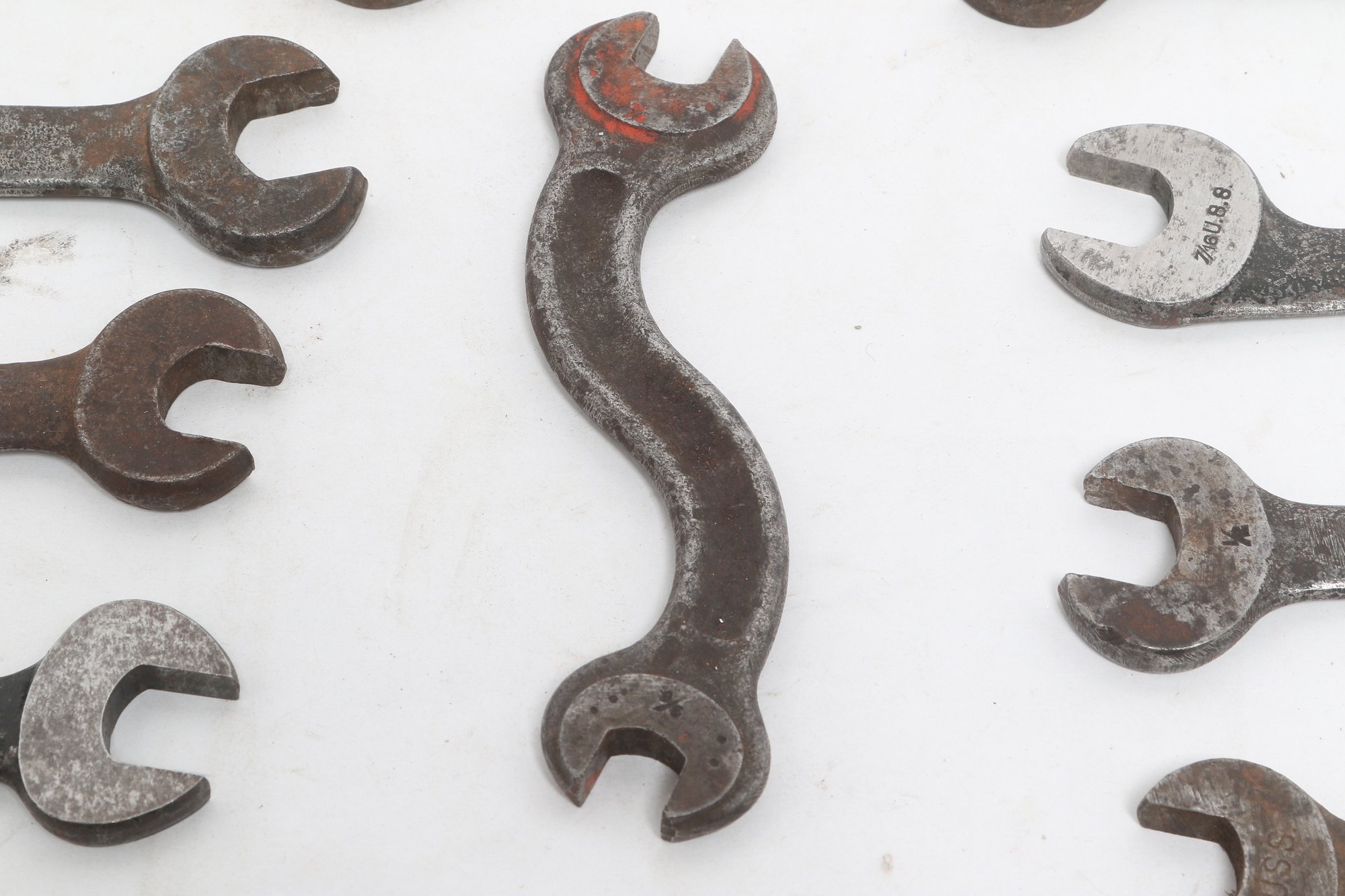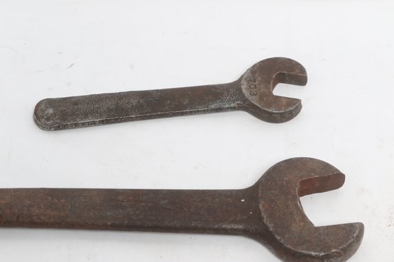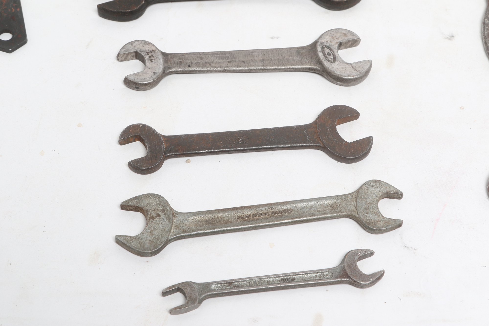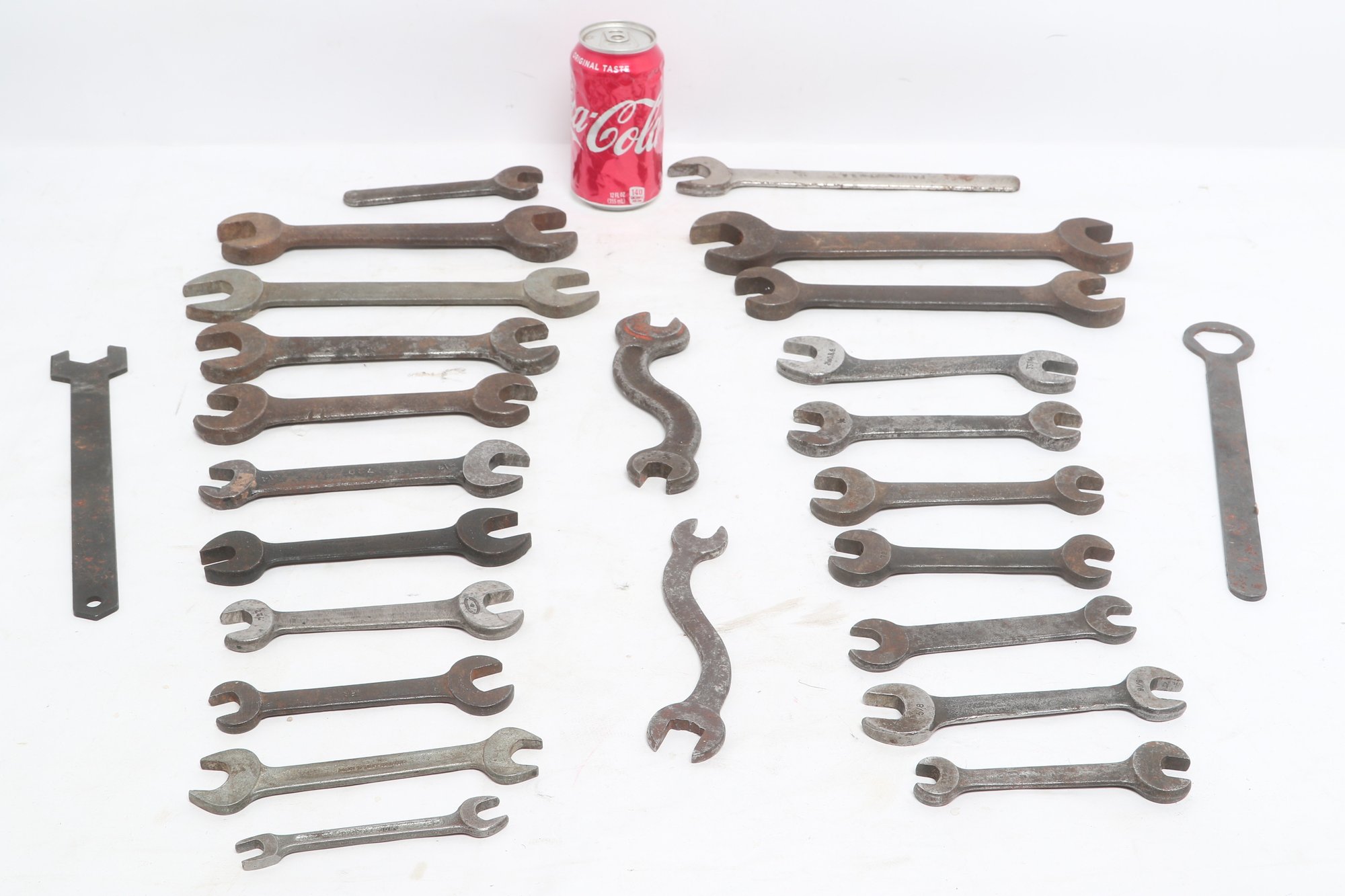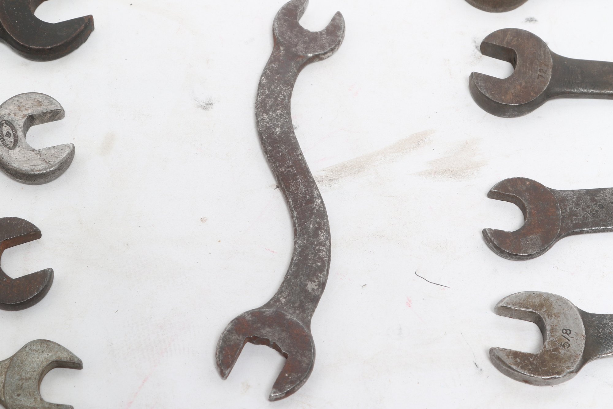 Assorted lot of vintage machinist open-end wrenches in various sizes and styles. Includes multiple well-used tools with aged patina, ideal for collectors, restoration, or workshop use. Pre-owned with visible wear and oxidation consistent with age.