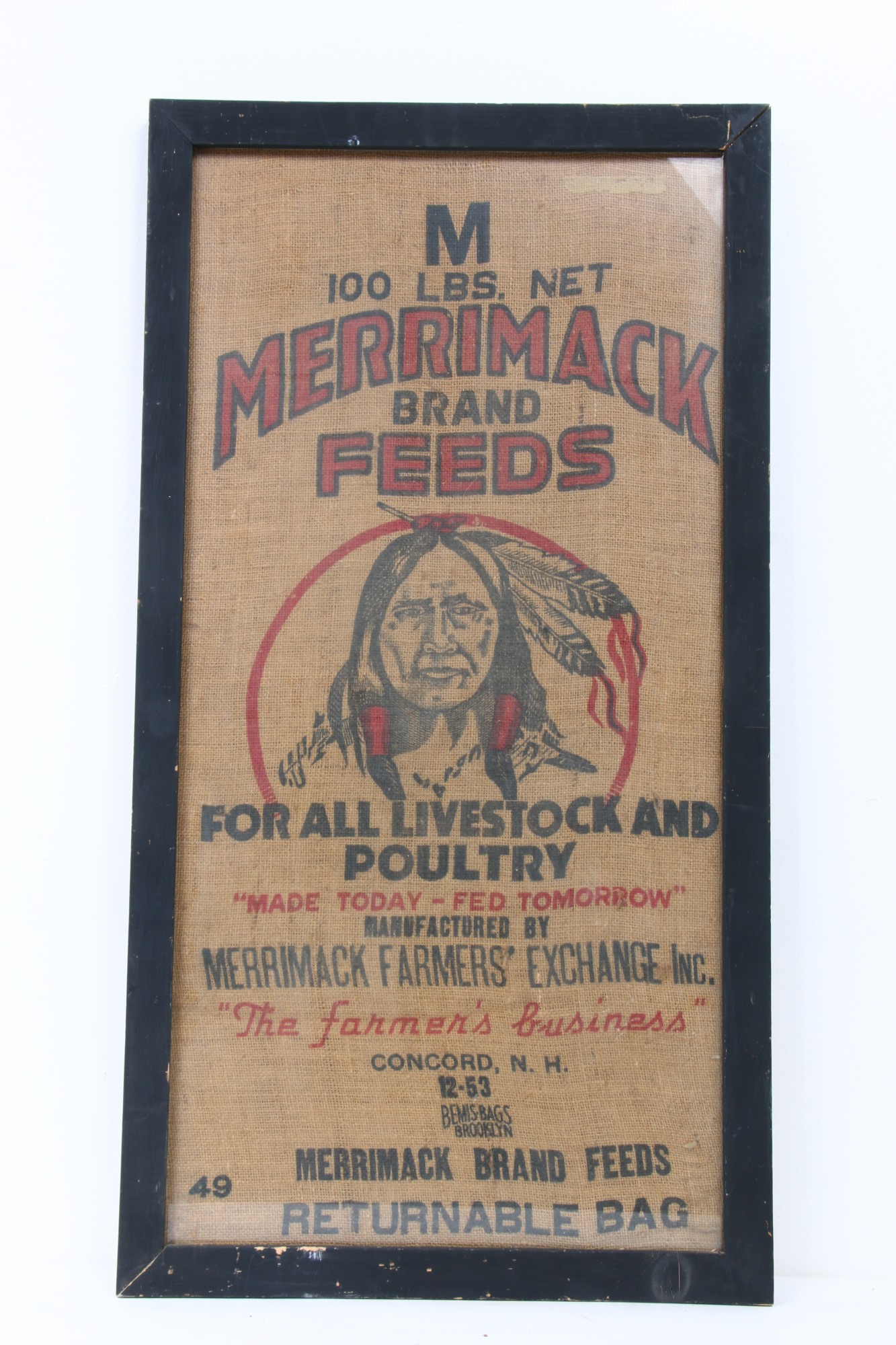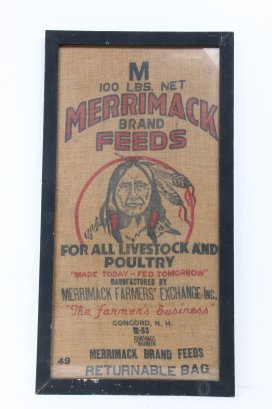 Vintage MERRIMACK Feeds Livestock & Poultry 100lbs Burlap Bag Sack - Framed