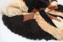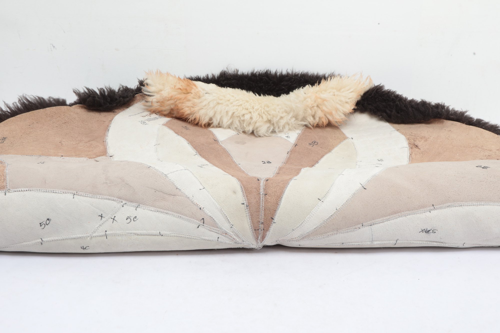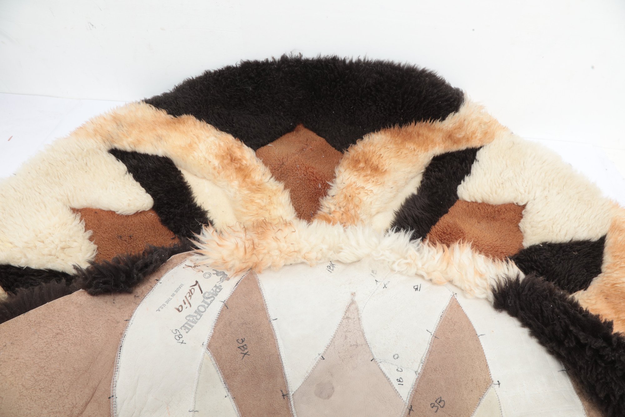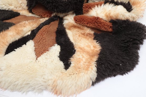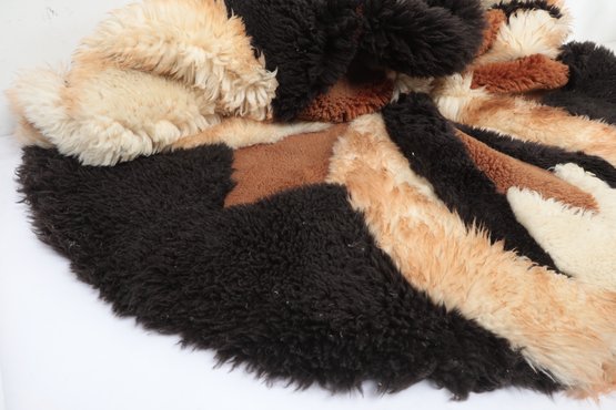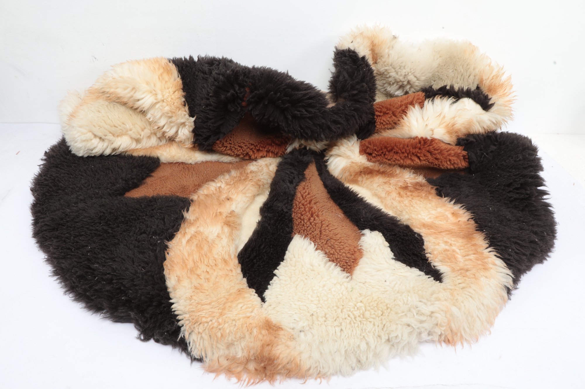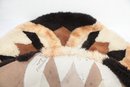 Add warmth and texture to your space with this vintage genuine sheepskin or alpaca patchwork rug by Pastorale, made in the USA. This eye-catching piece features a striking radial sunburst design in natural tones of cream, tan, brown, and black—perfect for boho, rustic, or mid-century modern interiors.