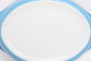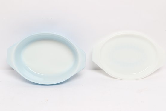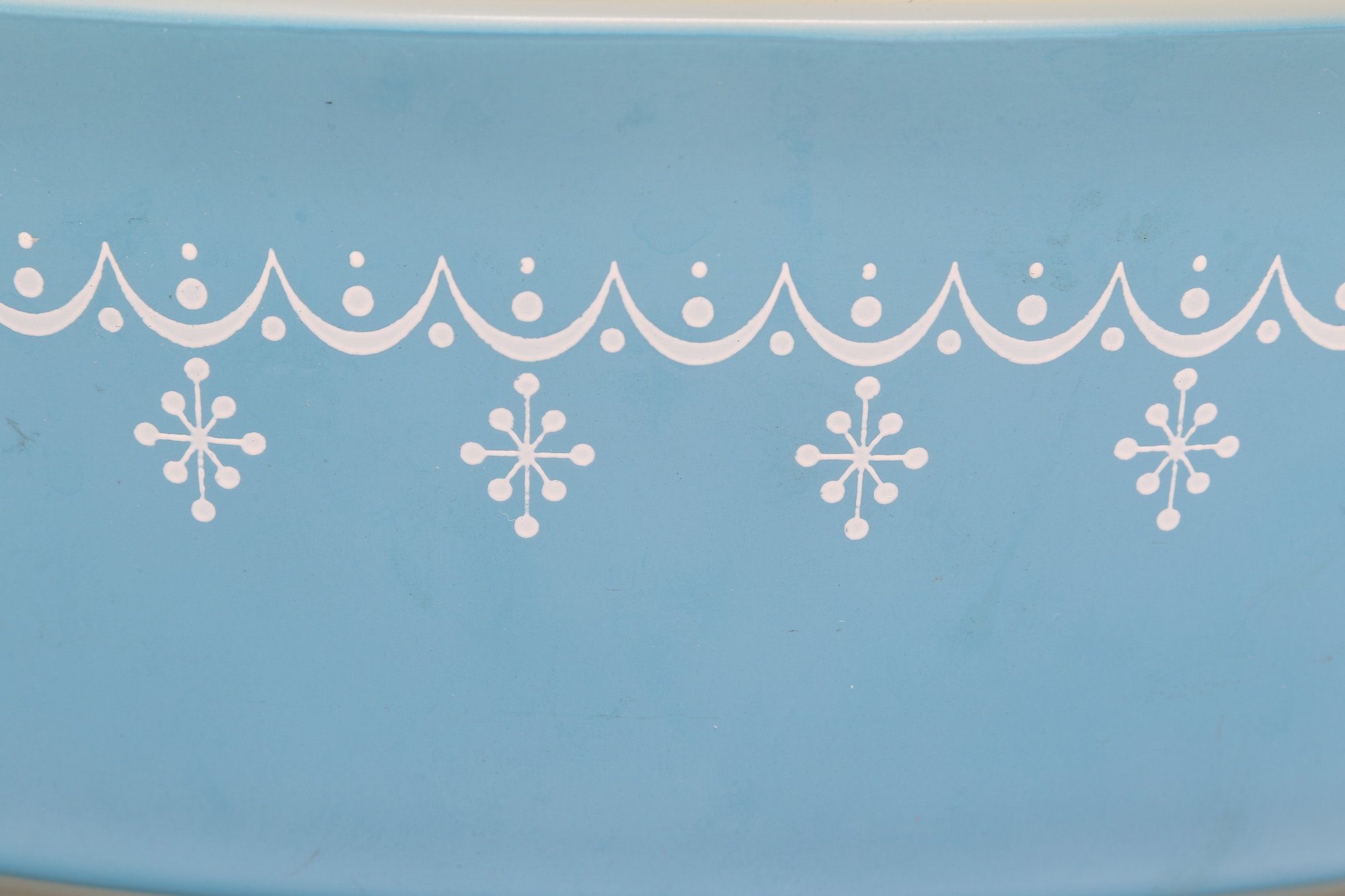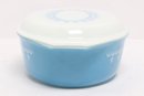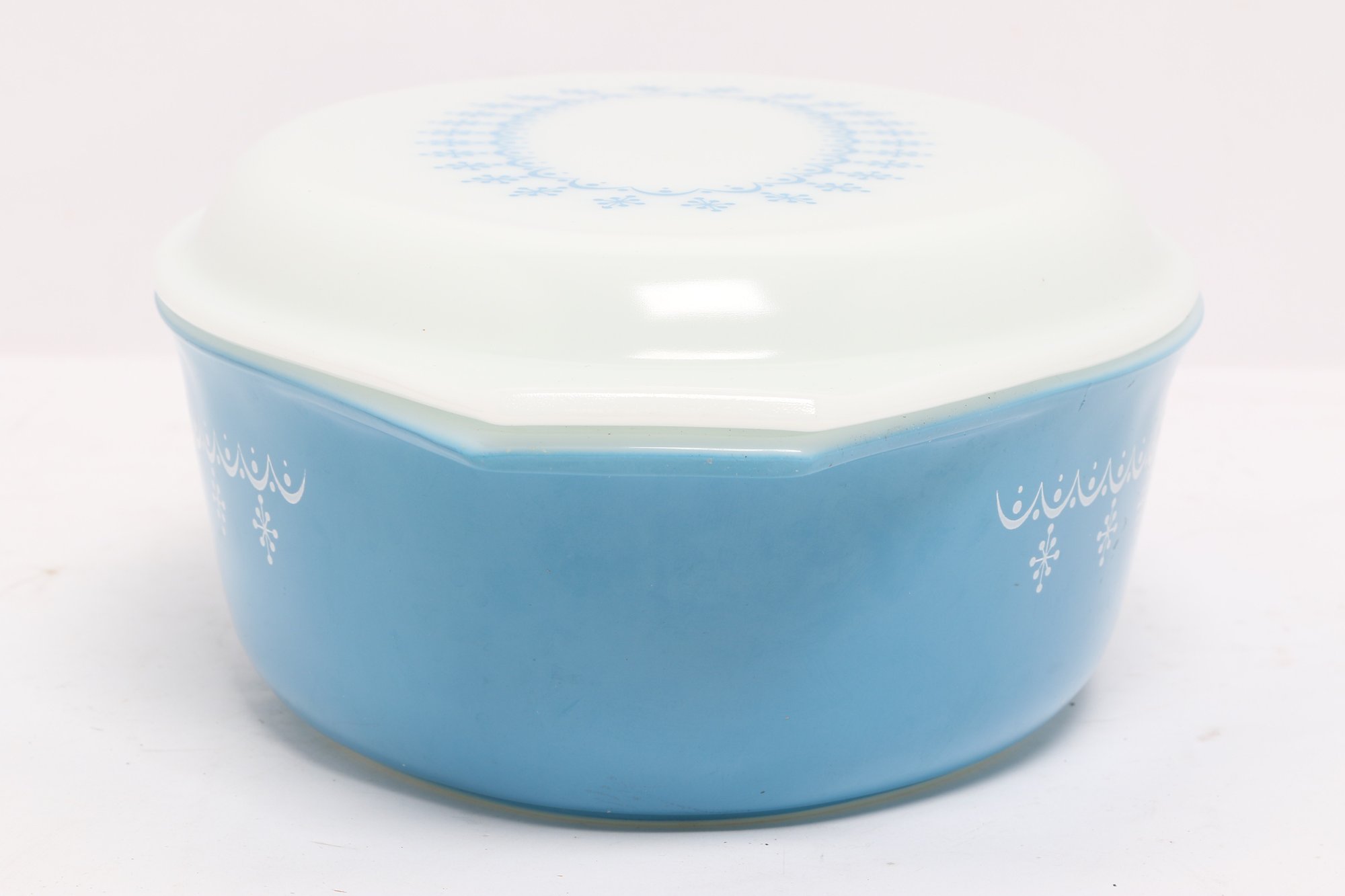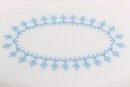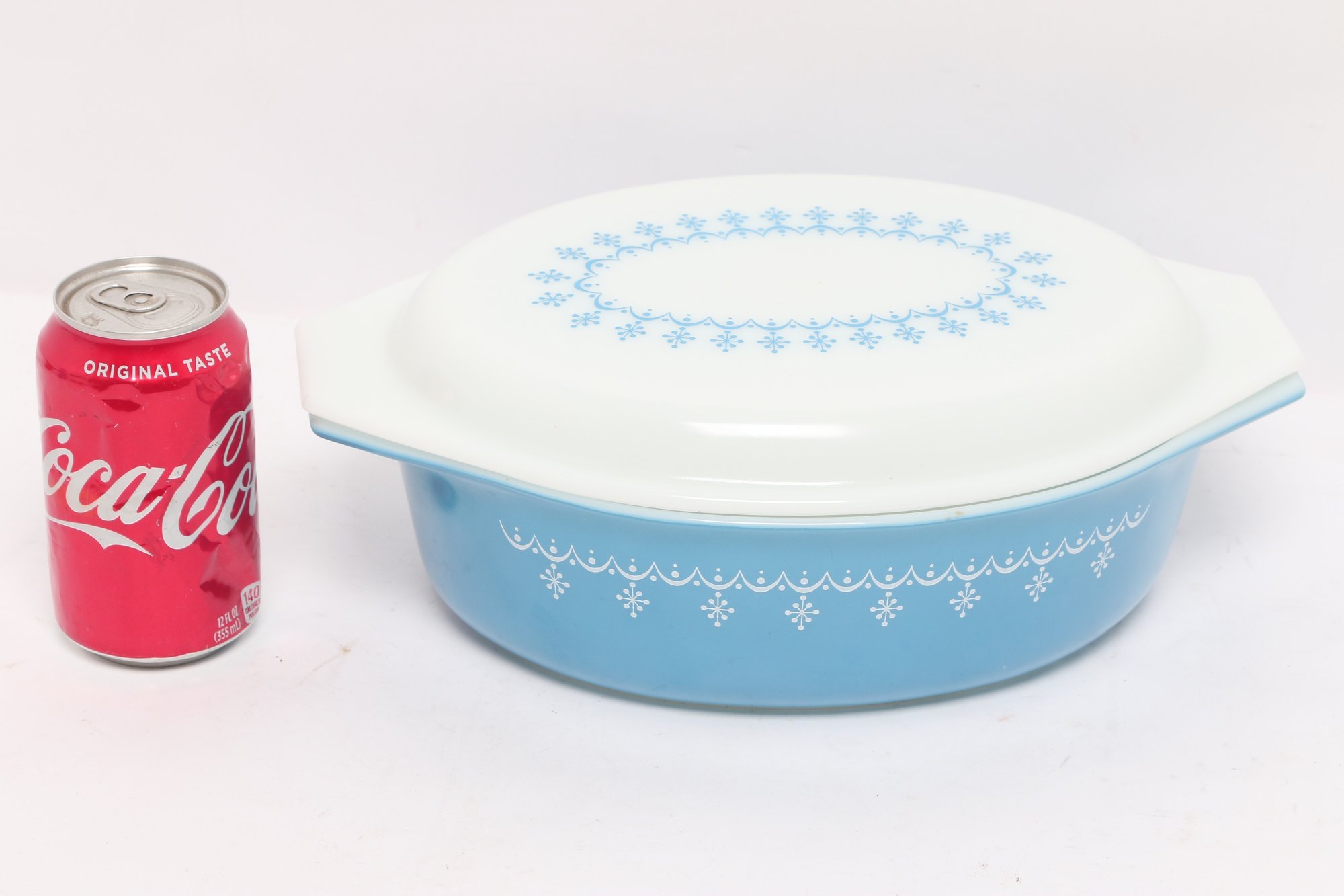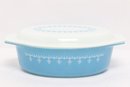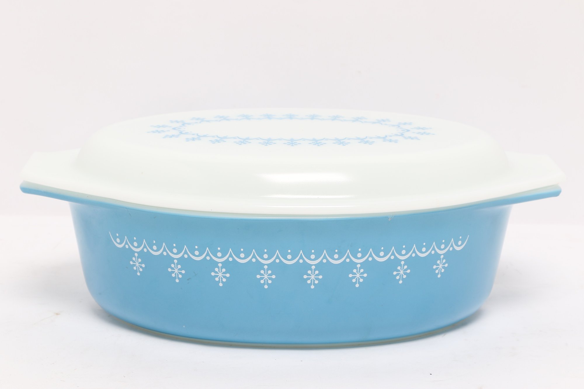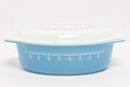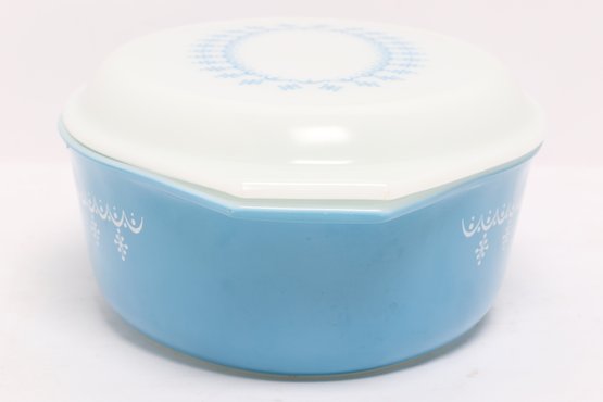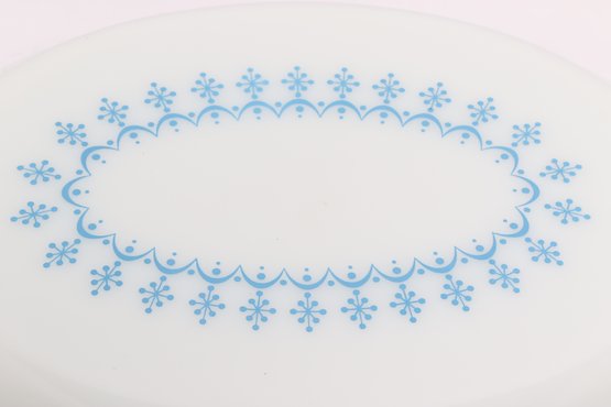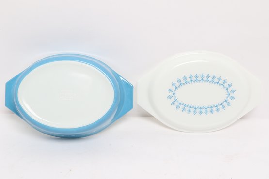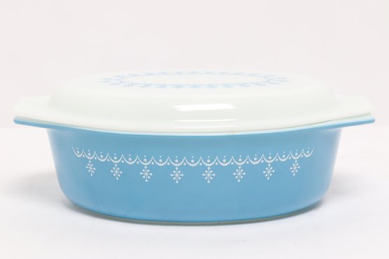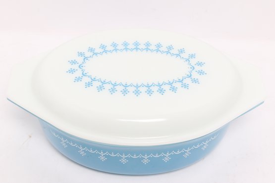 Vintage Pyrex oval casserole dish in light blue with white snowflake pattern, complete with matching lid. Classic mid-century design, perfect for serving, baking, or collection display.